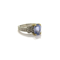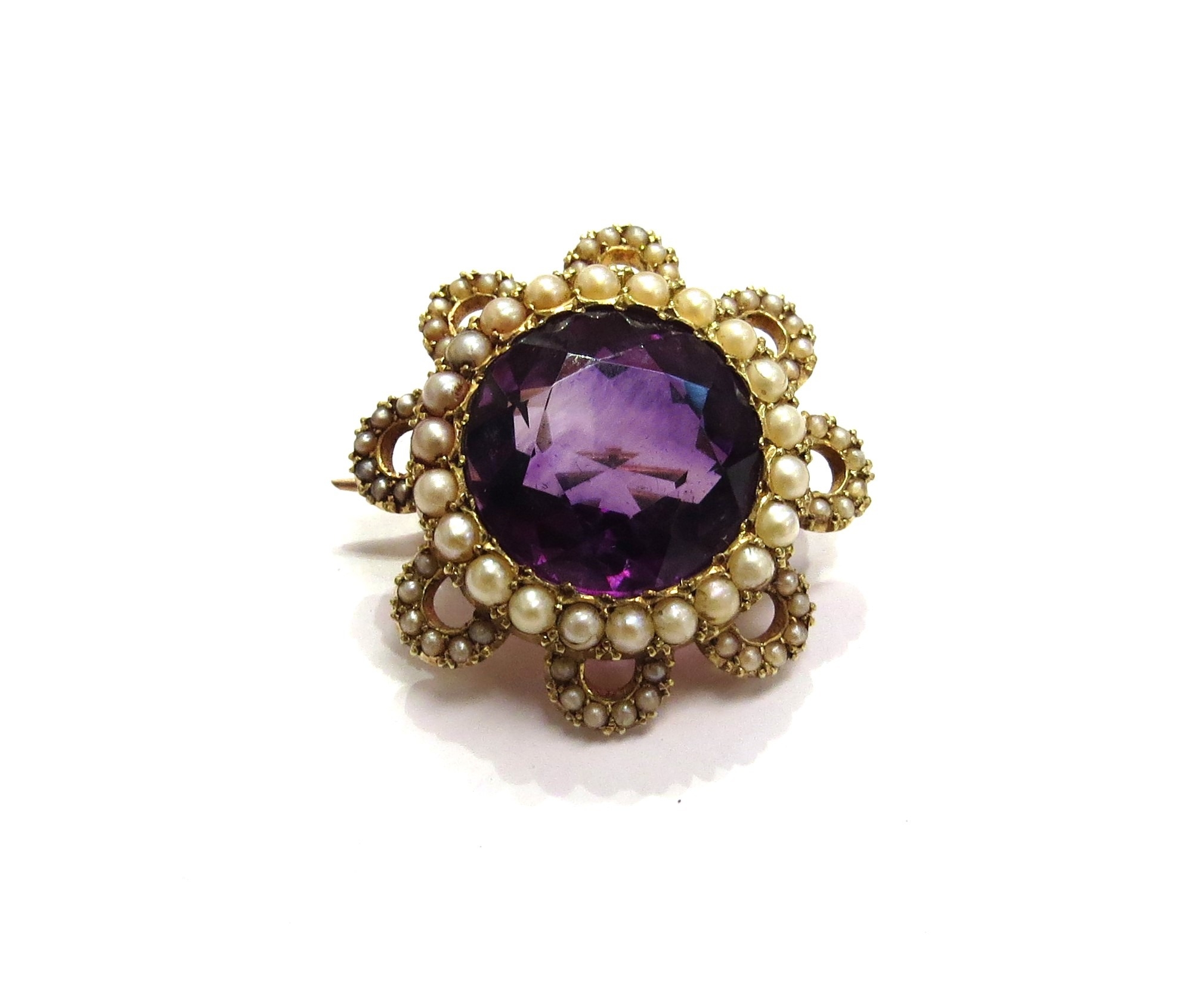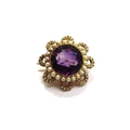A gold amethyst and pearl flower brooch, stamped 15ct, 2cm diameter, 5.5g