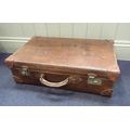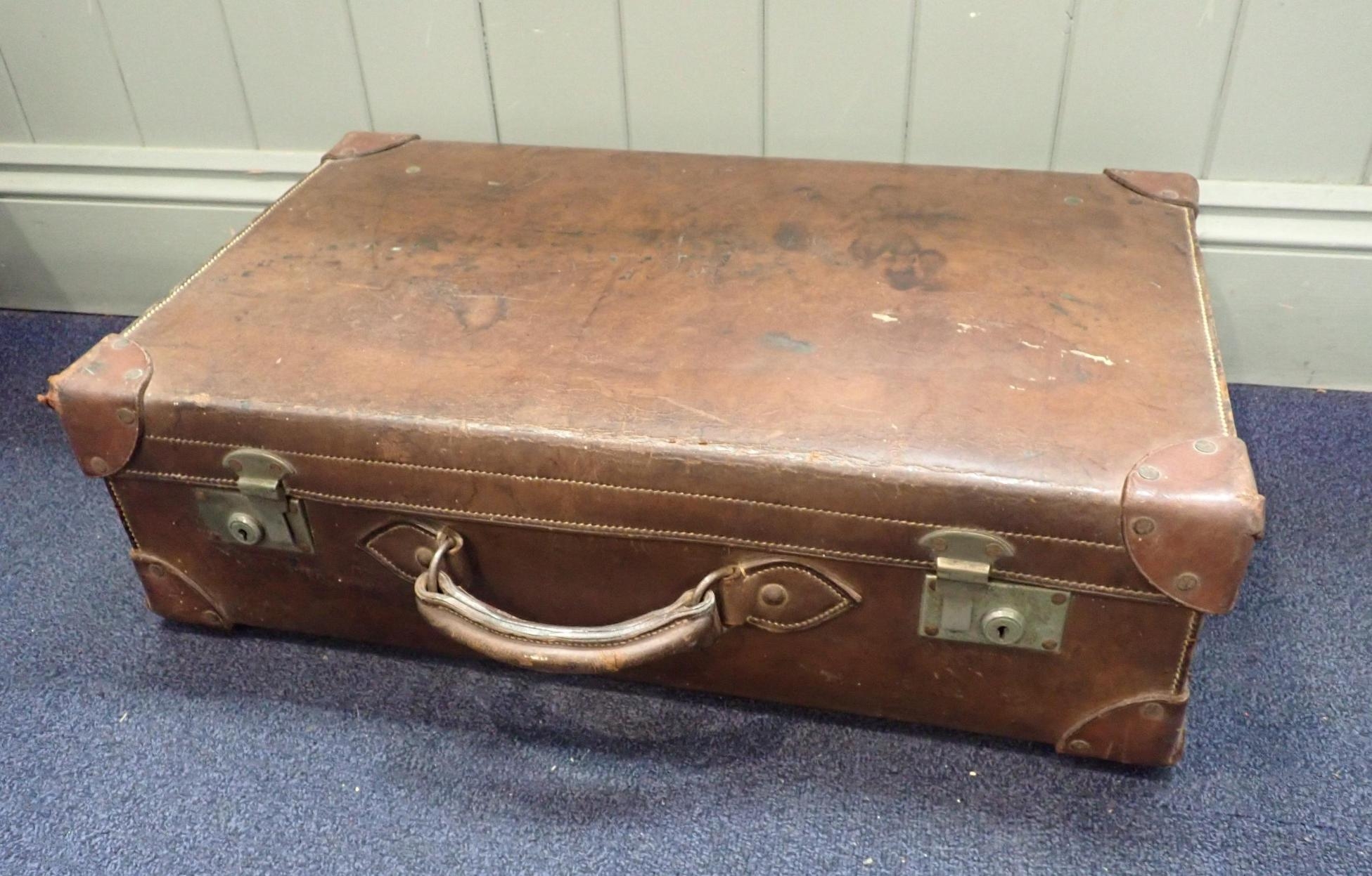 A VINTAGE LEATHER SUITCASEstamped 'J.E. BEALE Ltd, BOURNEMOUTH', 20 x 68 x 41cm (lining partly removed)
