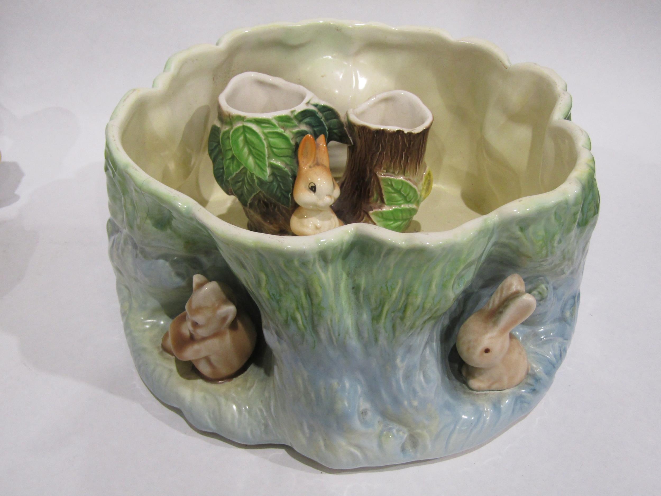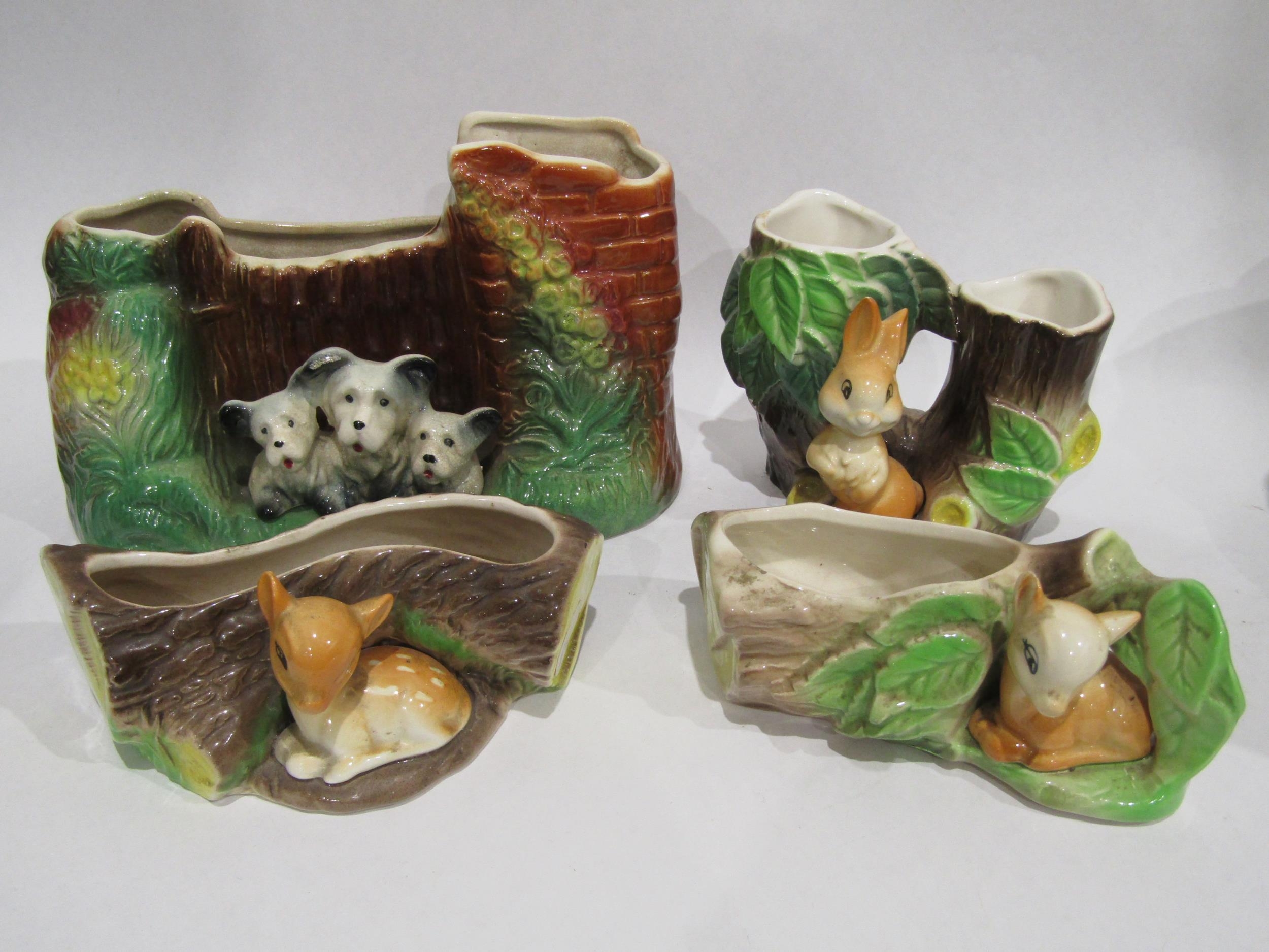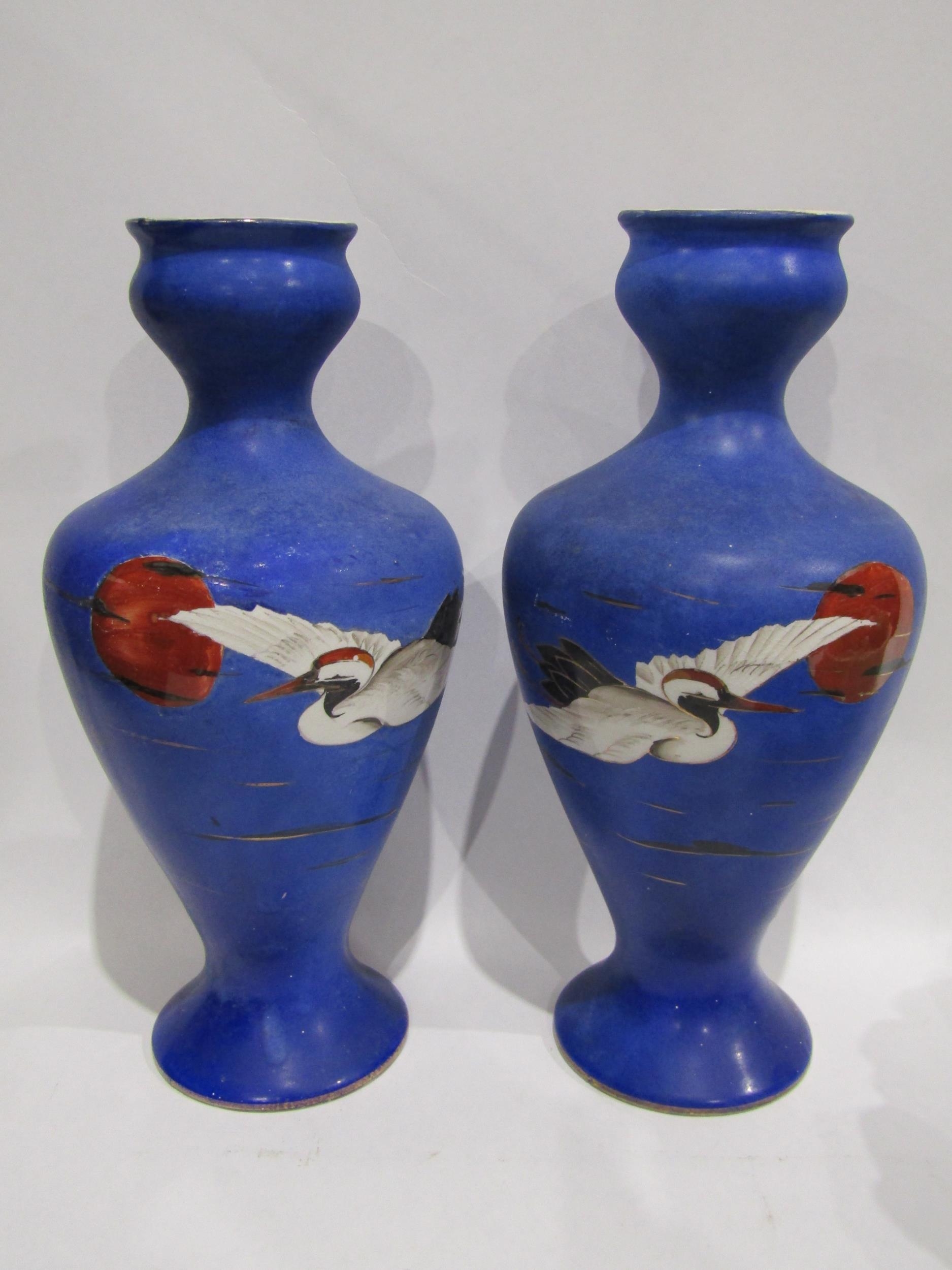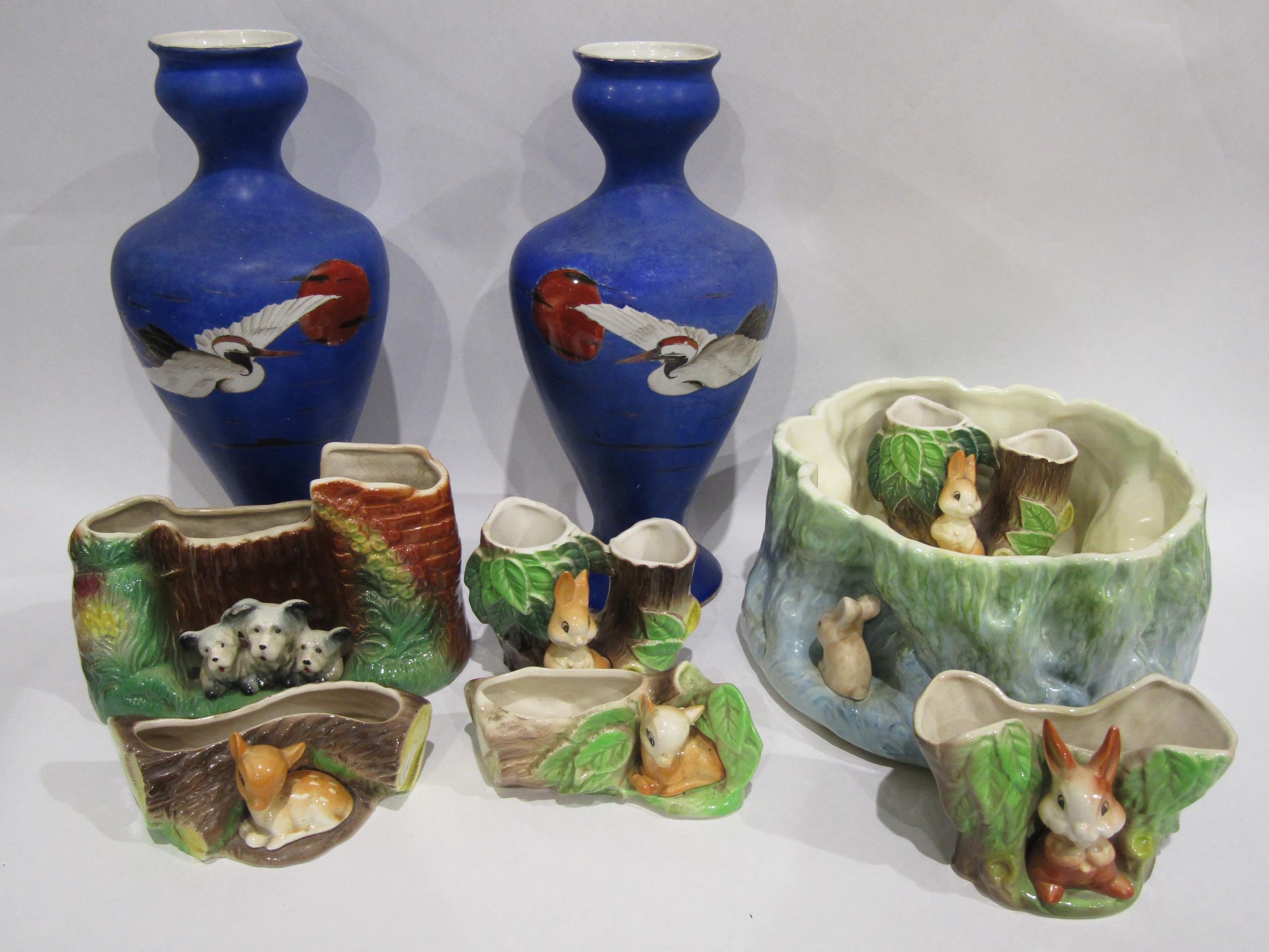 A selection of Hornsea and Sylvac flora and fauna ceramics together with a pair of Bow blue ground vases with crane design