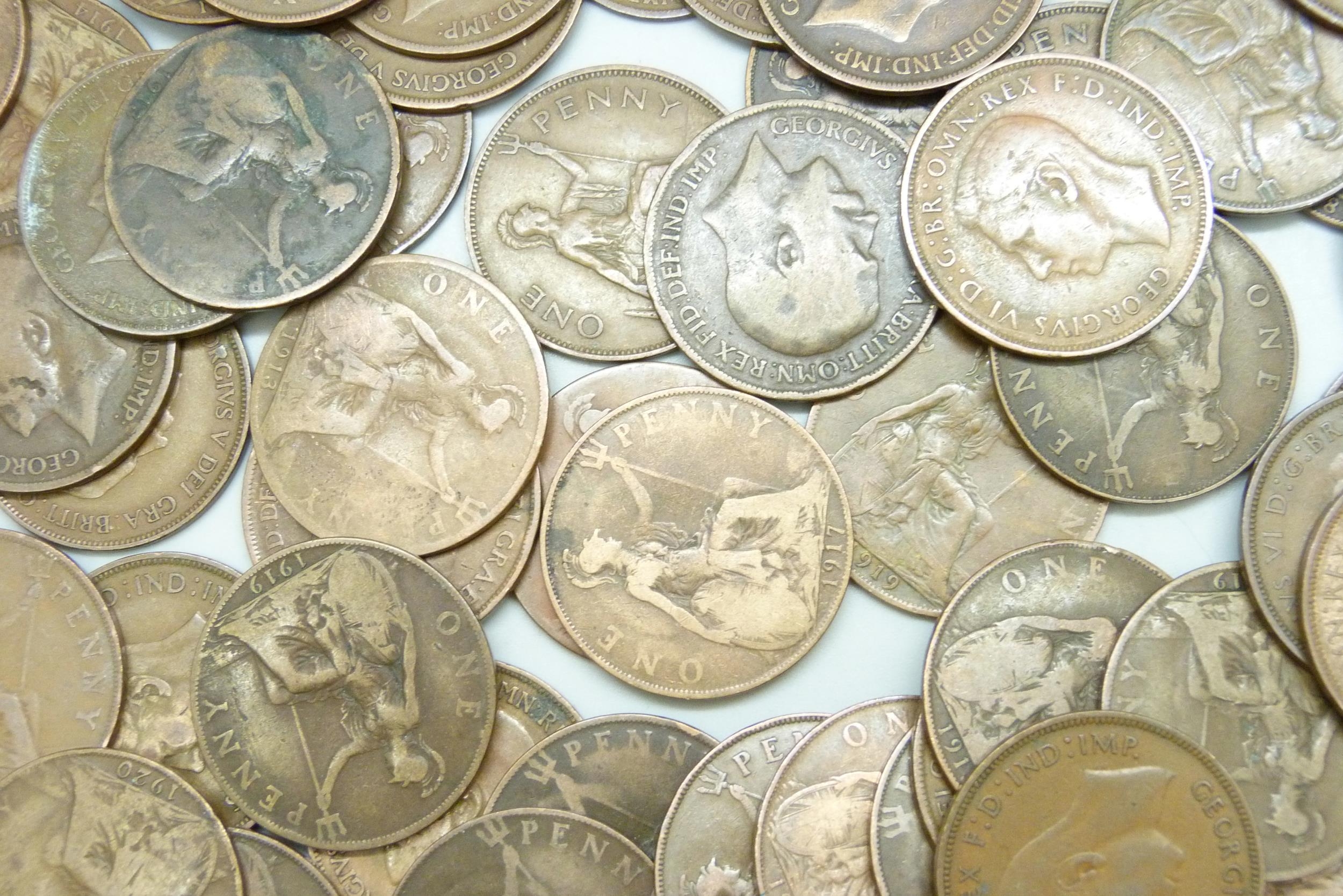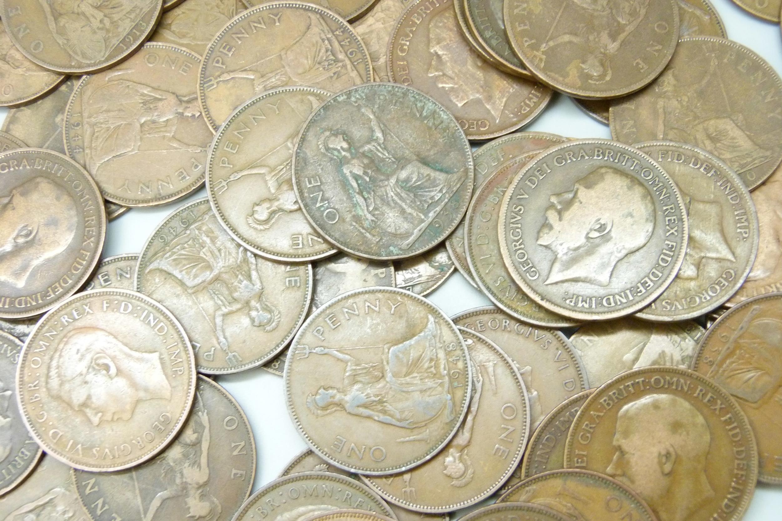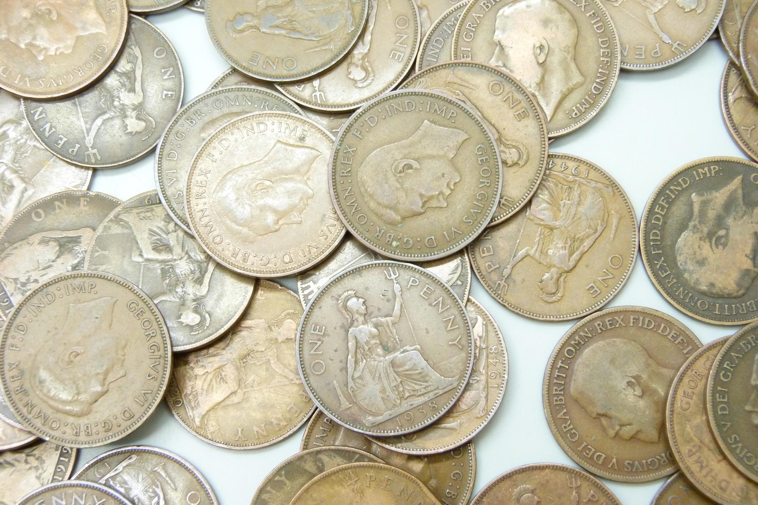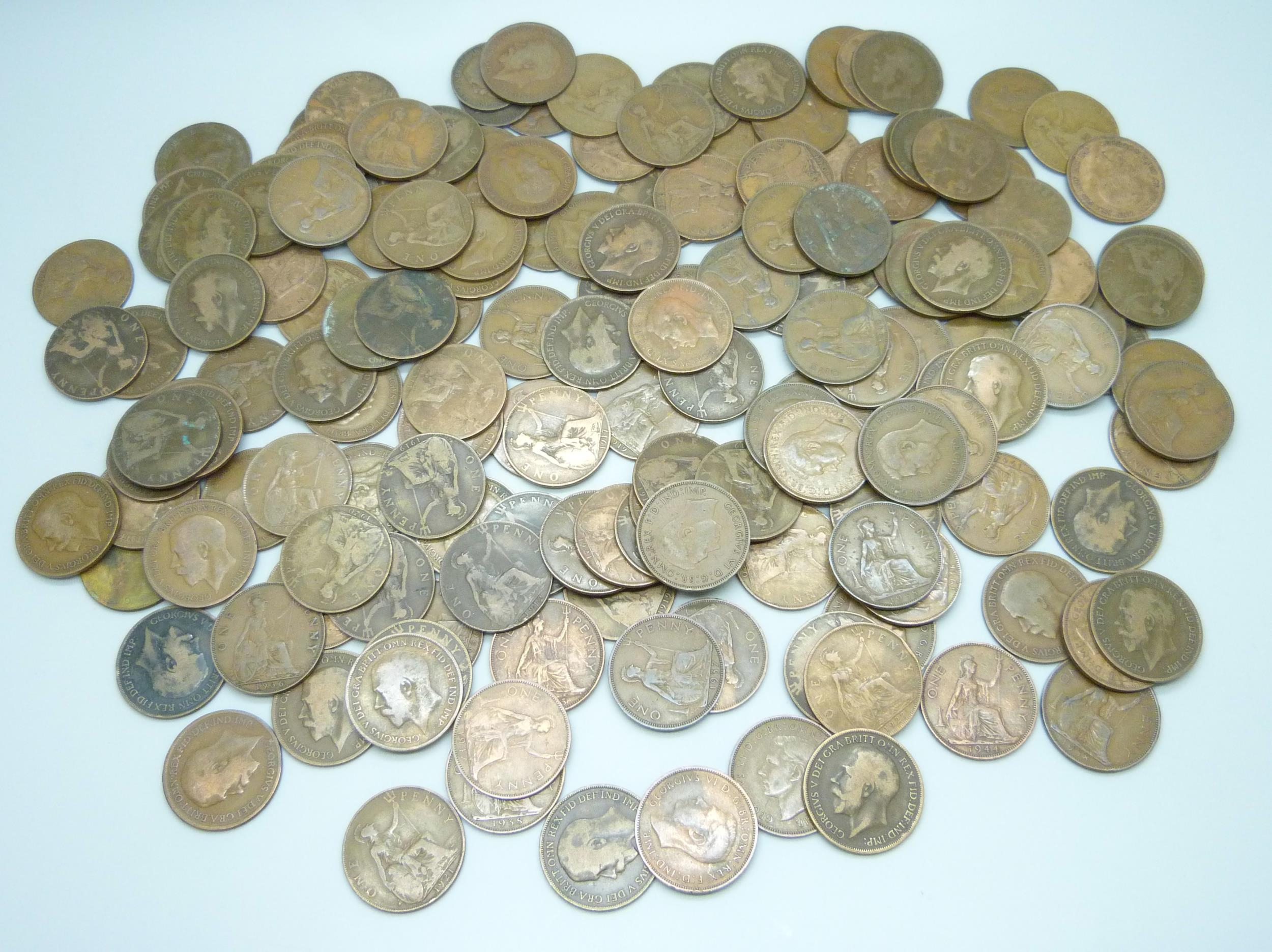 A collection of approximately 100 George VI pennies together with approximately 50 George V pennies