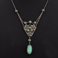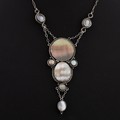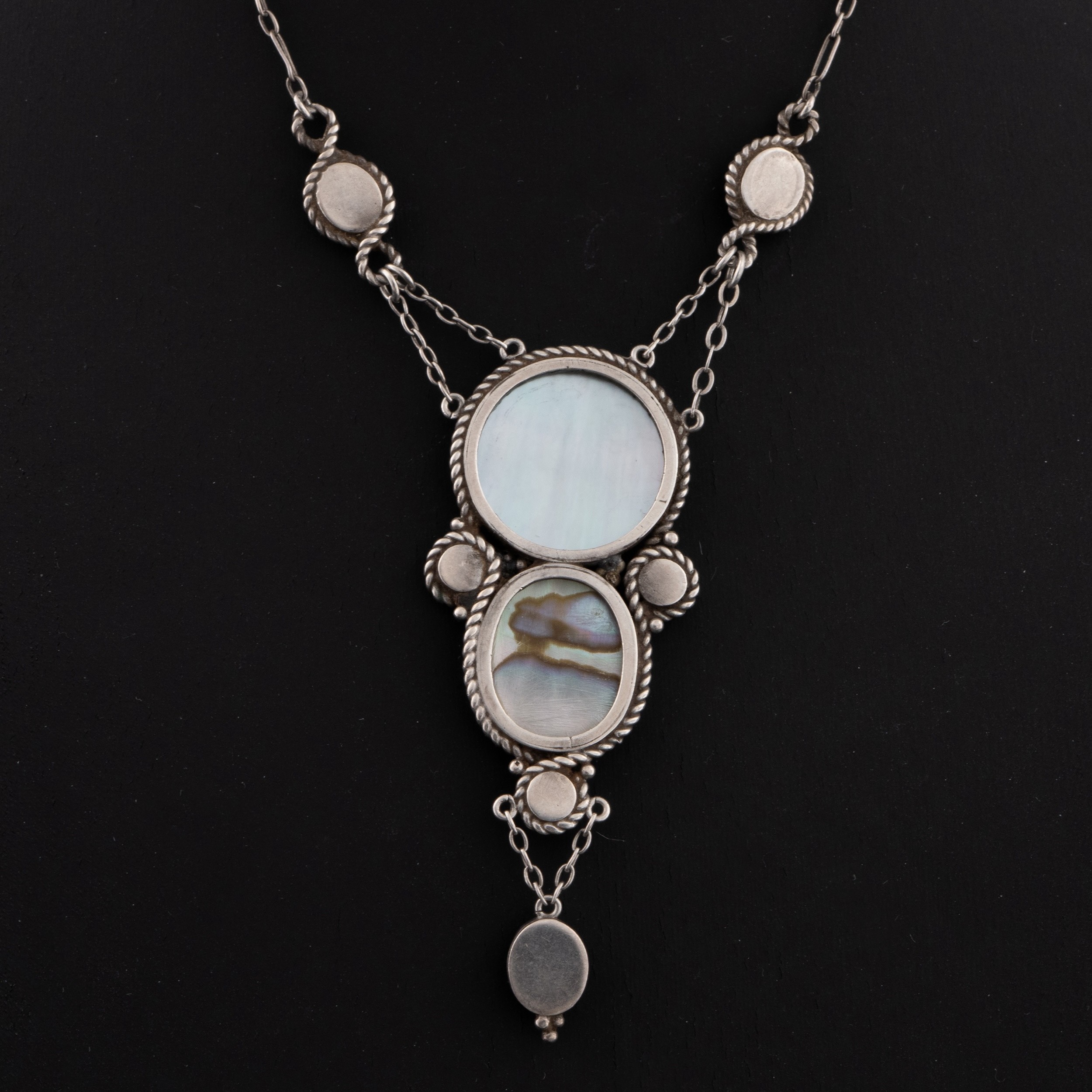An early 20thC English Arts and Crafts silver and abalone pendant necklace, colourful abalone mounted in ropework with two abalone suspenders and a drop, tests as silver, drop 6.2cm, total chain length 37cm, total weight 8g. (LDC14584)