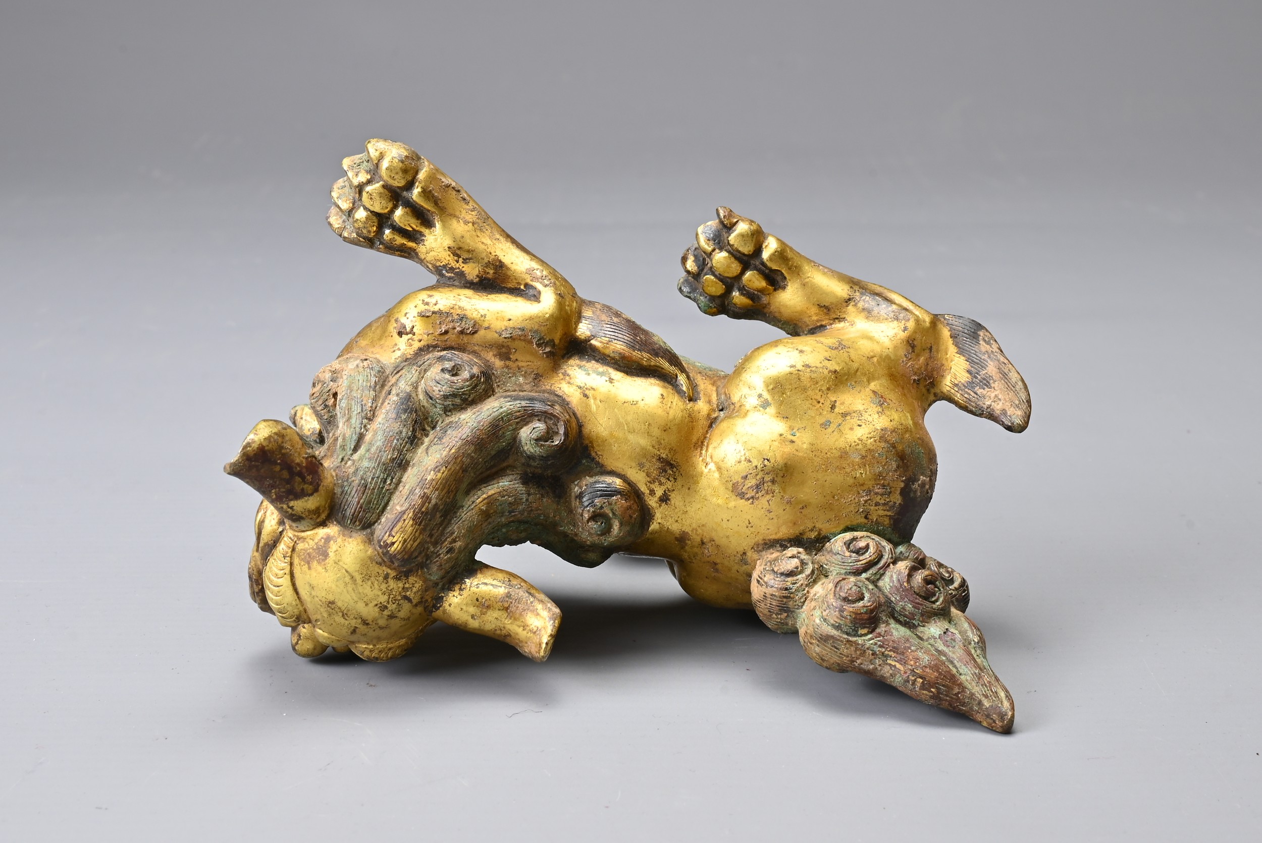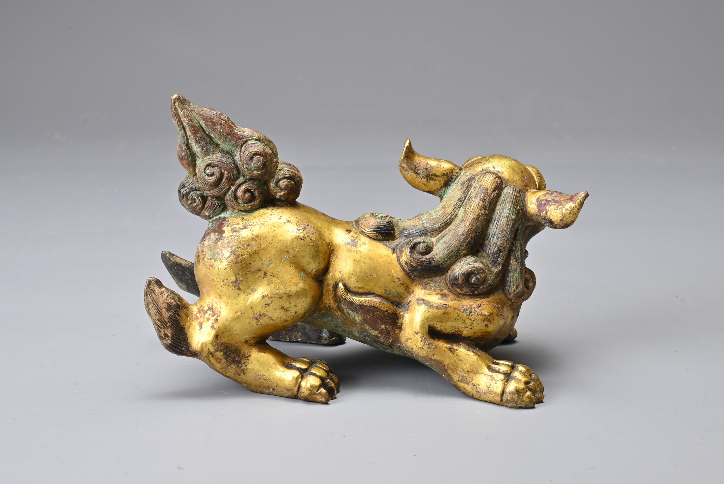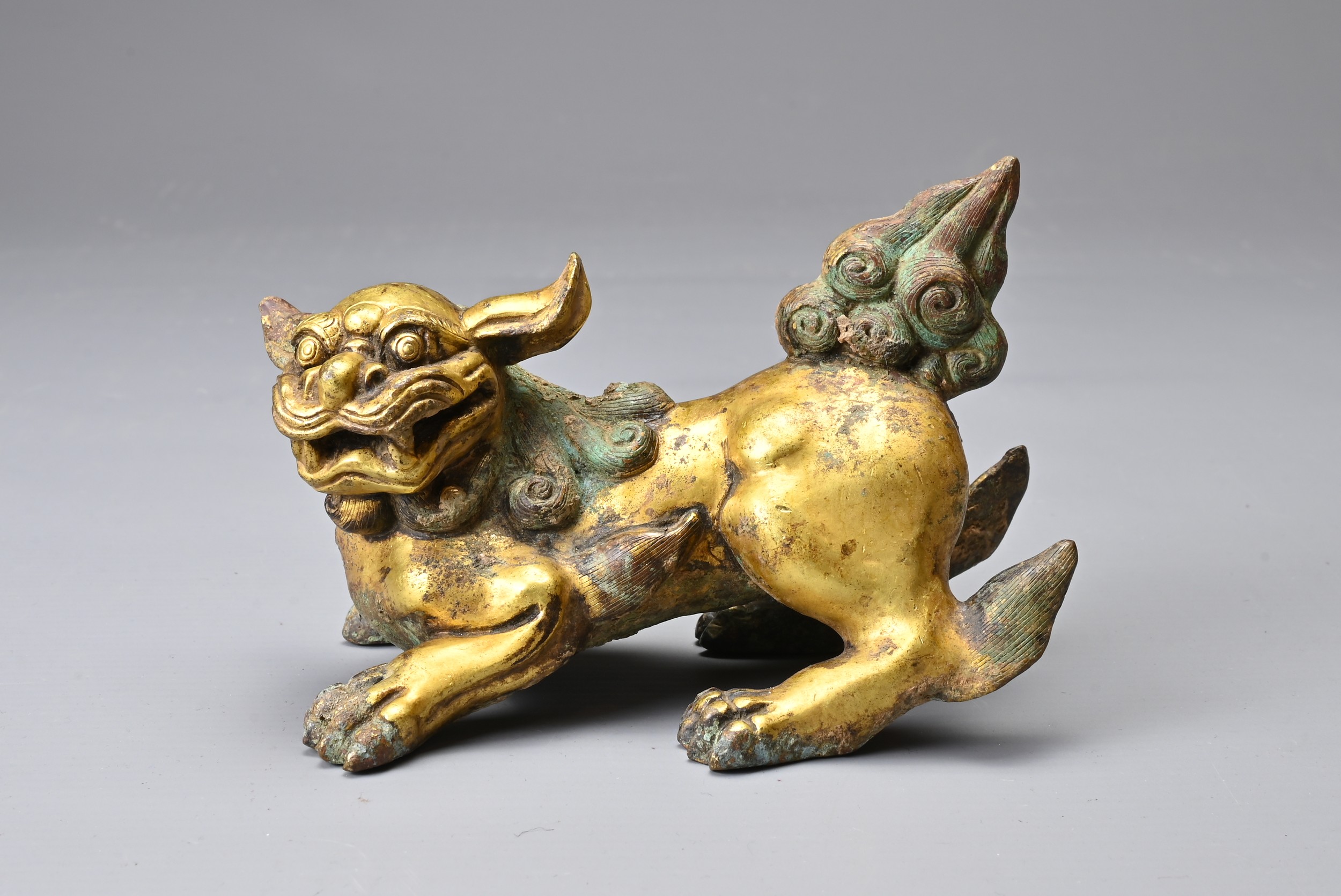 A CHINESE GILT BRONZE FIGURE OF A LION, MING DYNASTY STYLE. In a playful position with its head turned to the left. 14cm length.