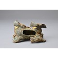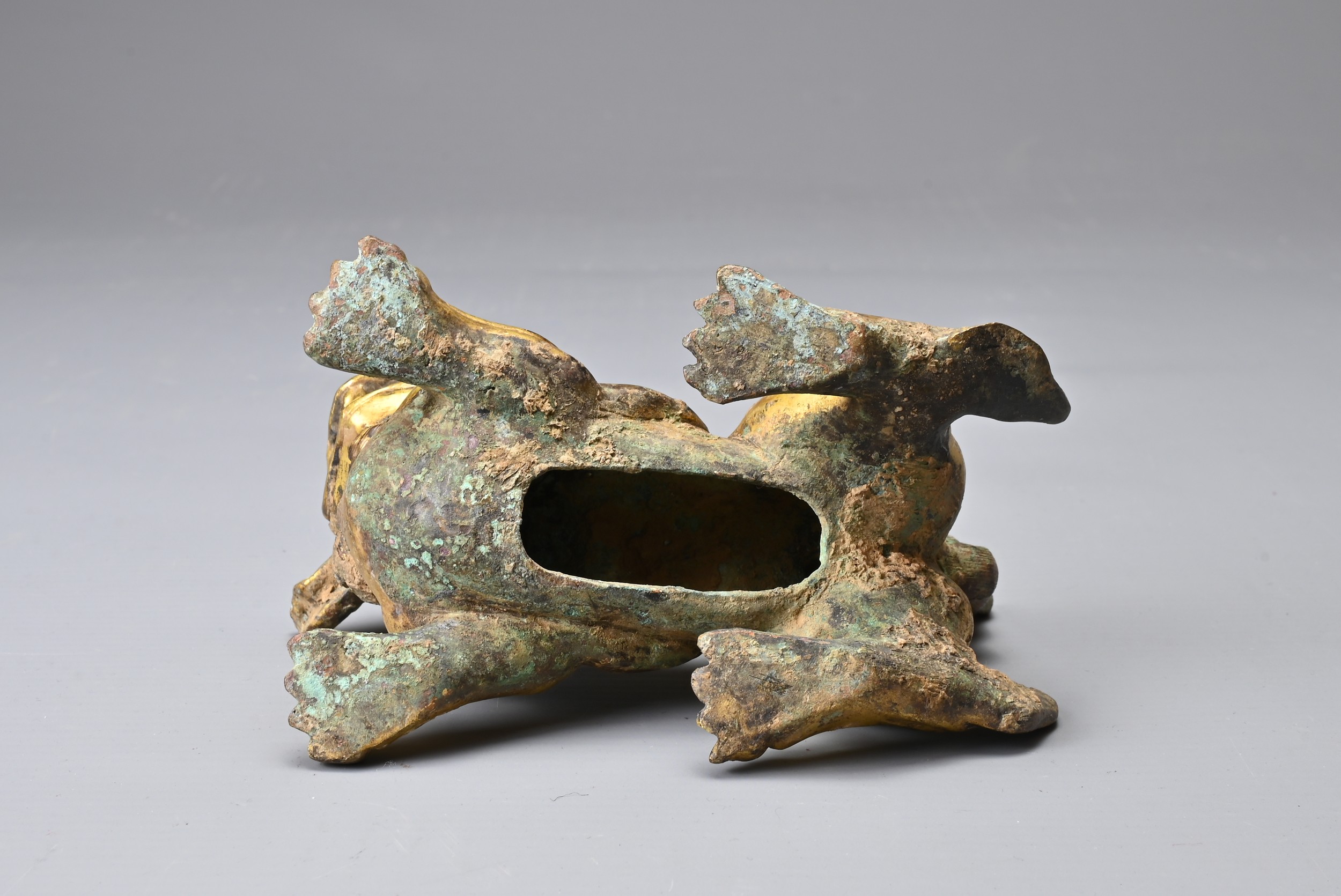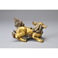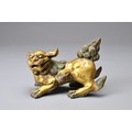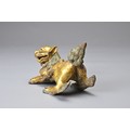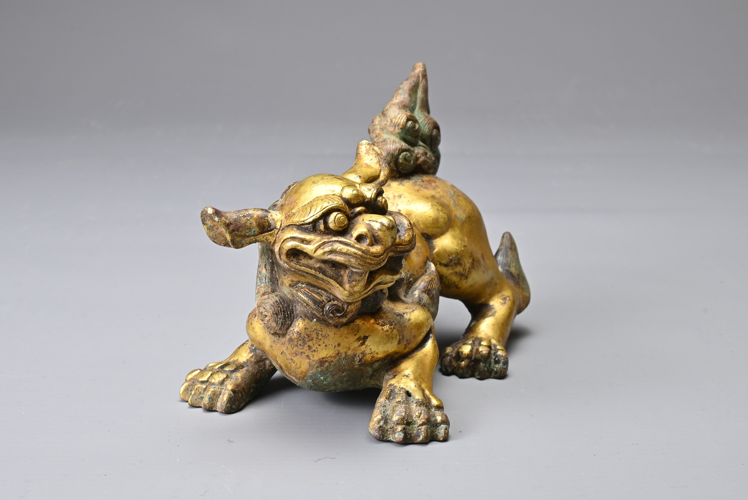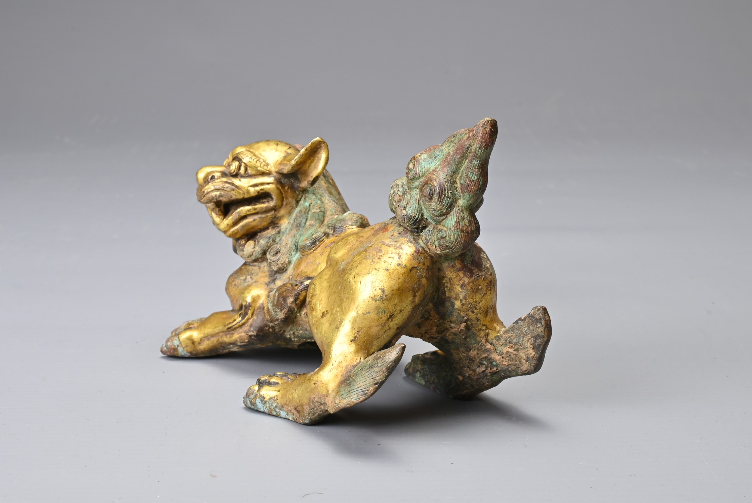 A CHINESE GILT BRONZE FIGURE OF A LION, MING DYNASTY STYLE. In a playful position with its head turned to the left. 14cm length.