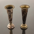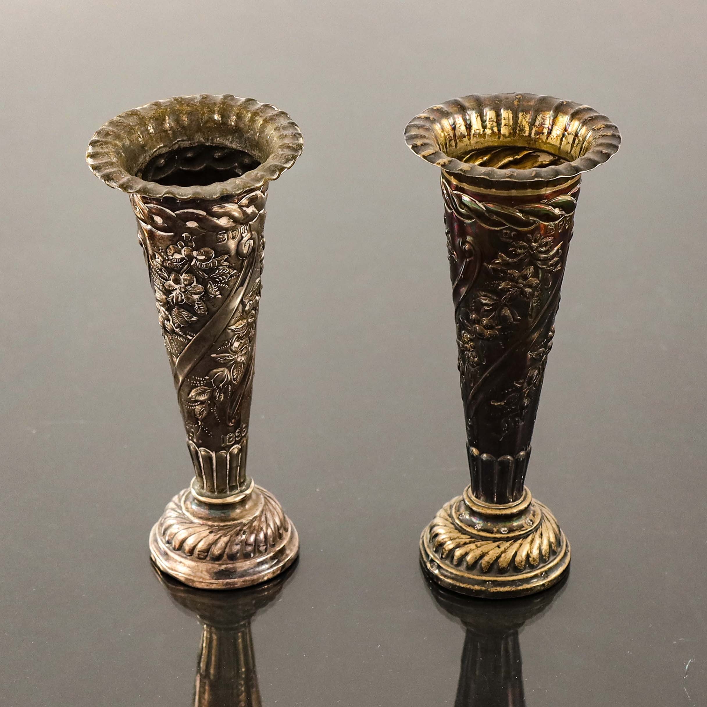 A pair of Victorian silver vases, William Comyns, London 1894, footed trumpet form, embossed with wrythen ribbon and garland bands, crimped rim, weighted, 10cm high