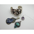 A Stylish Wide Cuff Bangle, with large central flowerhead; together with two ethnic style hardstone inset pendants, and another. (4)