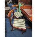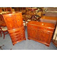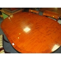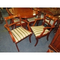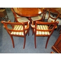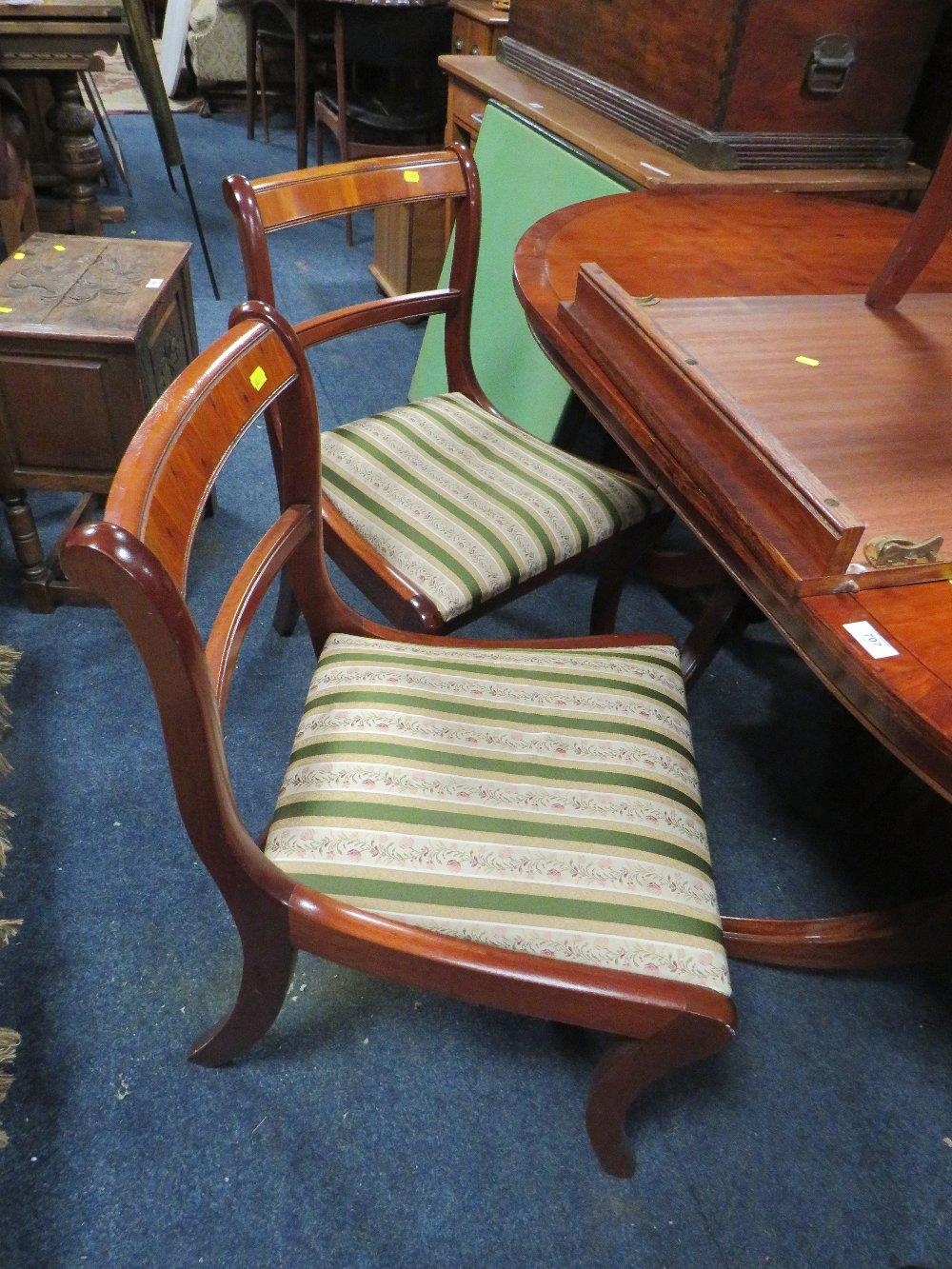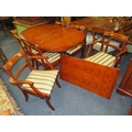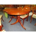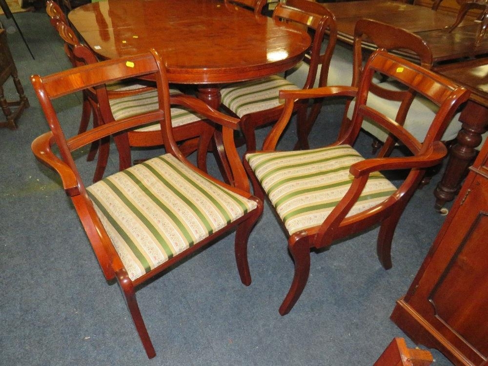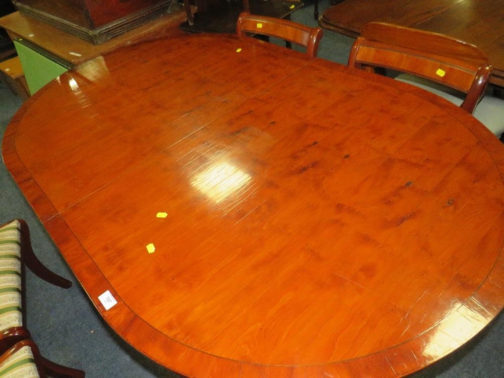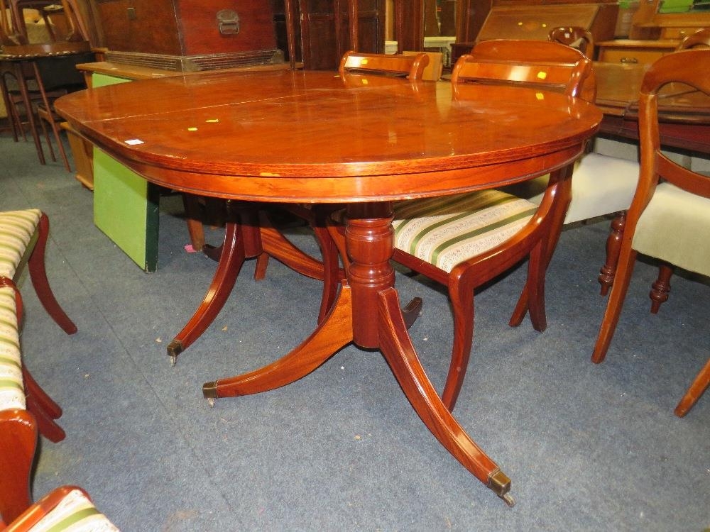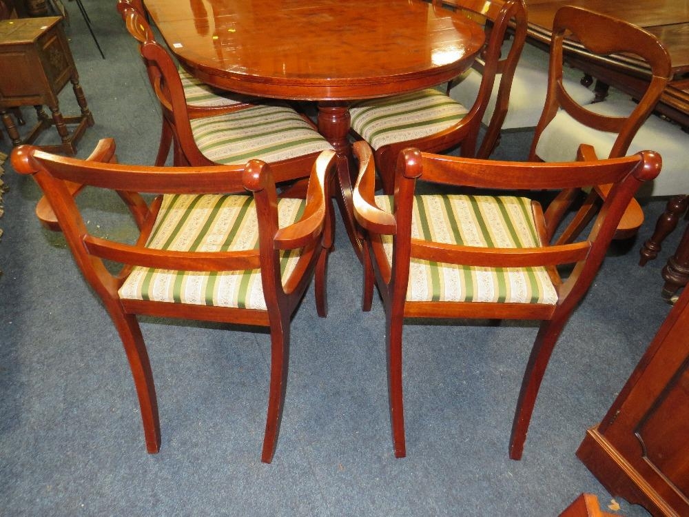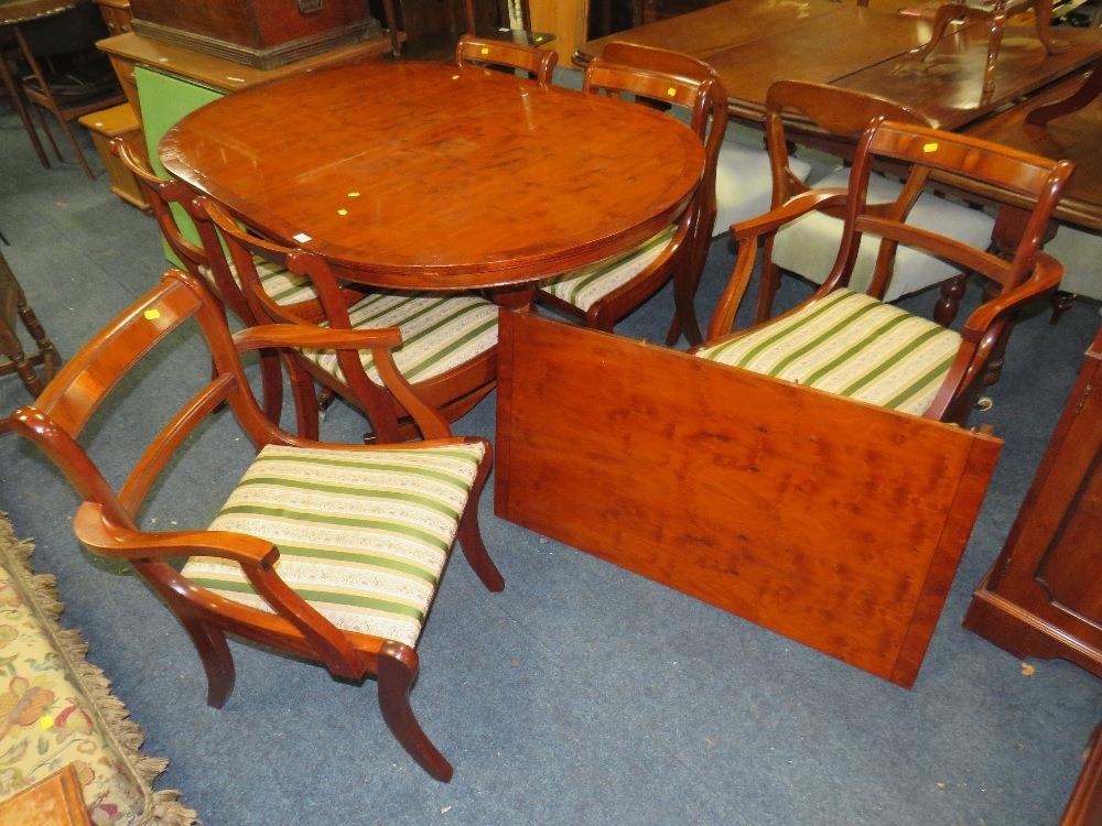 A MODERN YEW WOOD TWIN PEDESTAL DINING TABLE WITH ONE EXTRA LEAF AND SIX CHAIRS ( 4 + 2 )