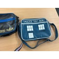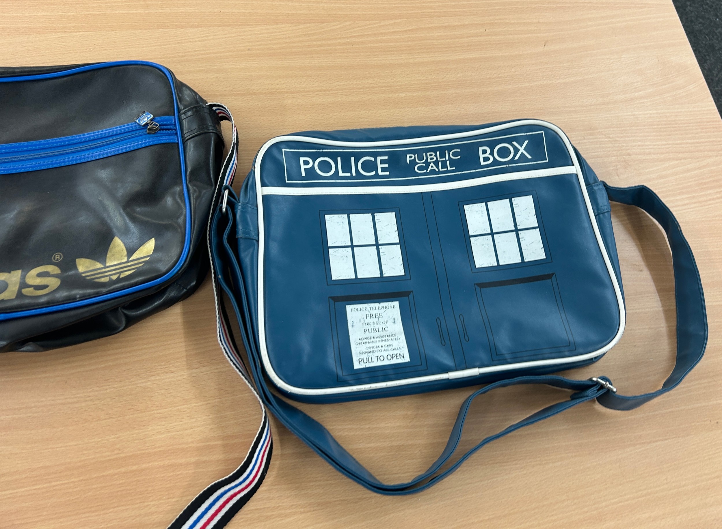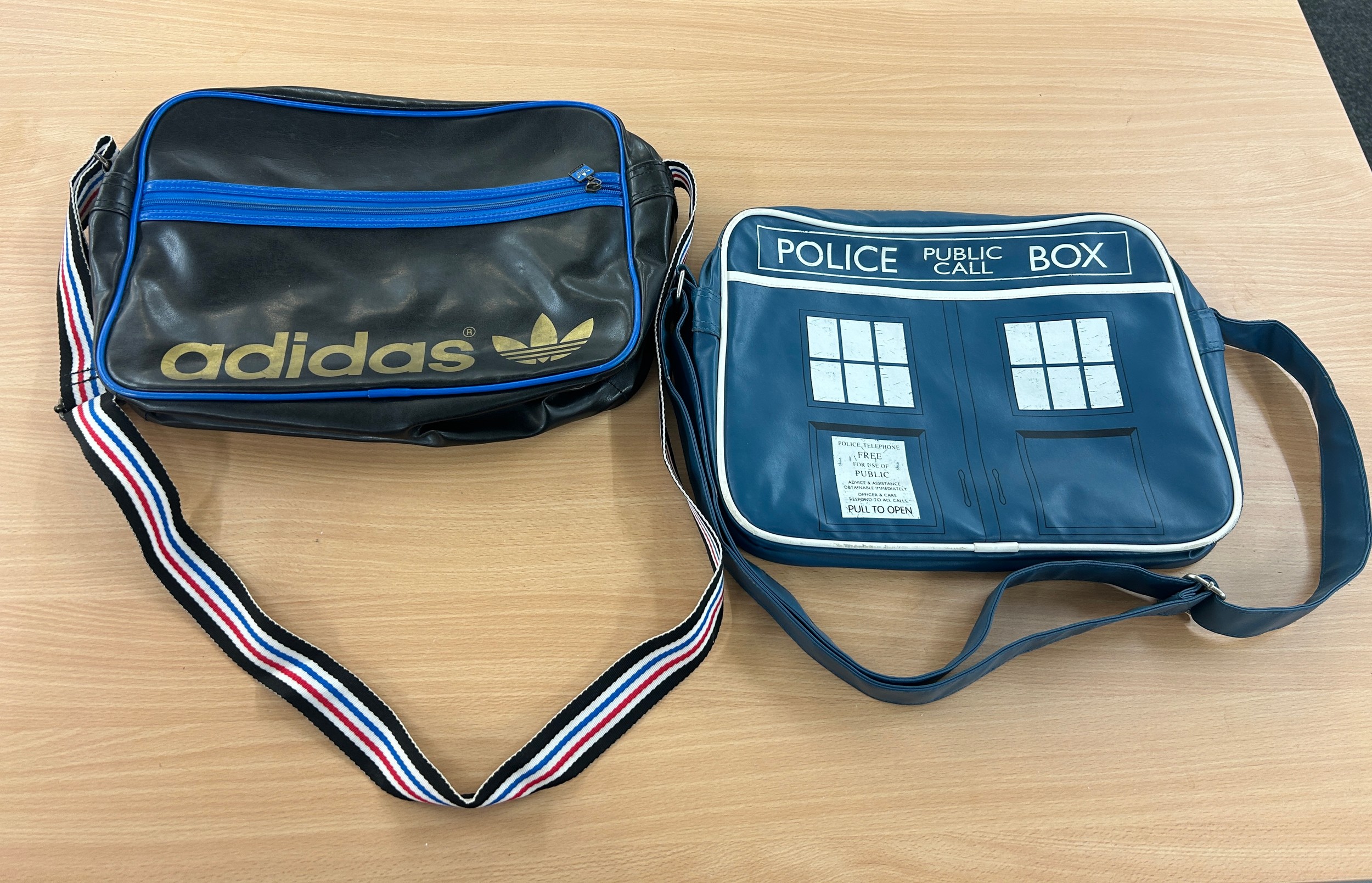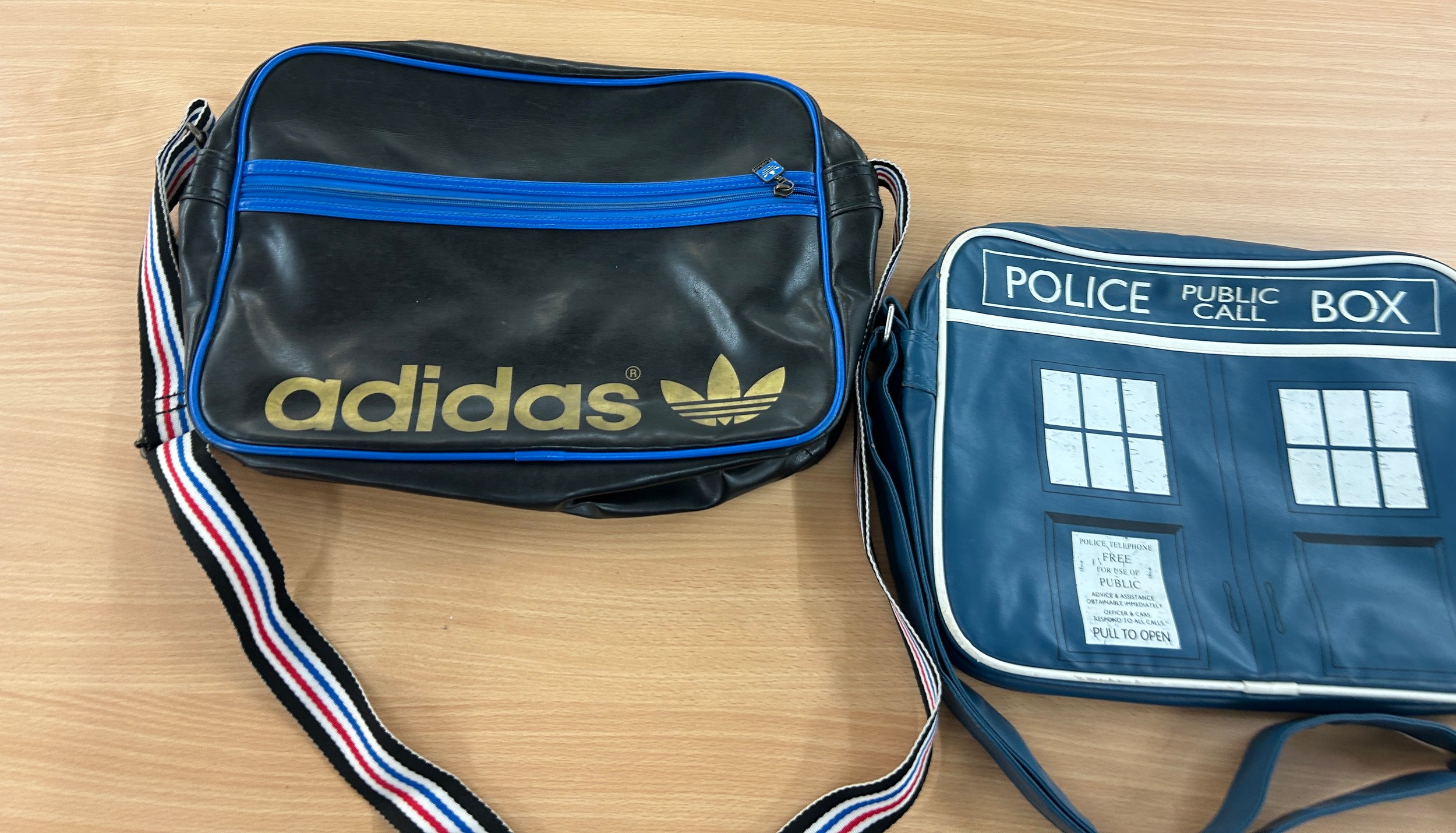 Black and blue Adidas original airliner bag and a retro tardis messenger bag