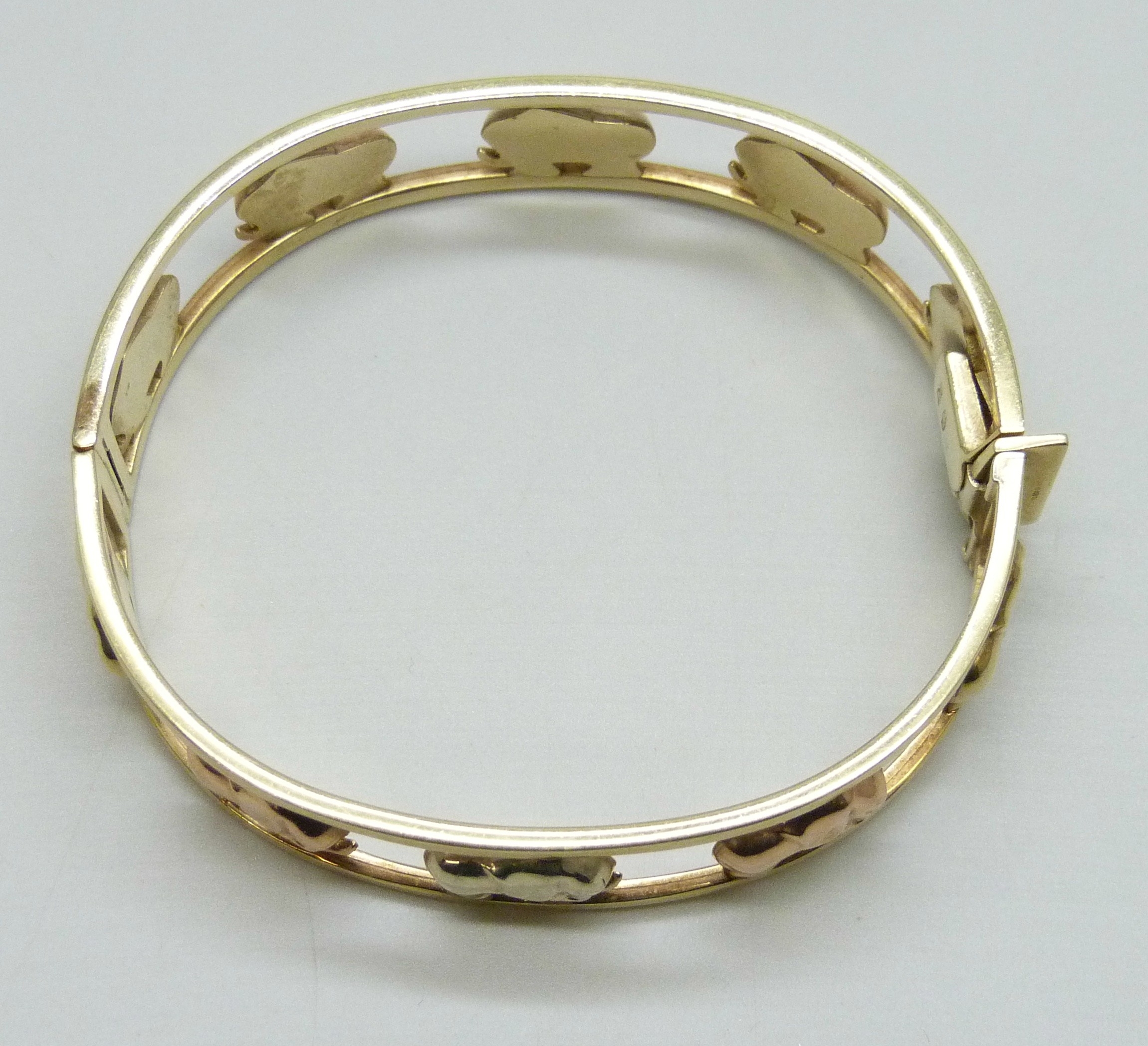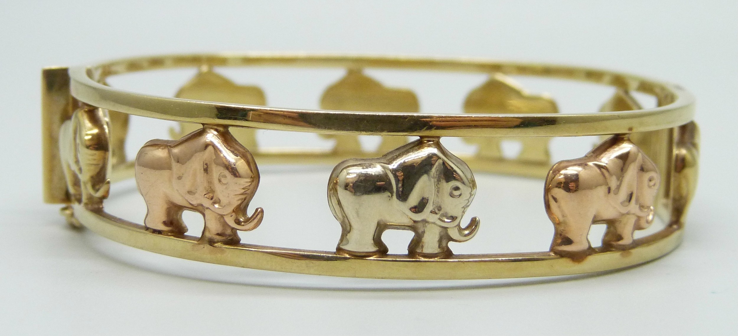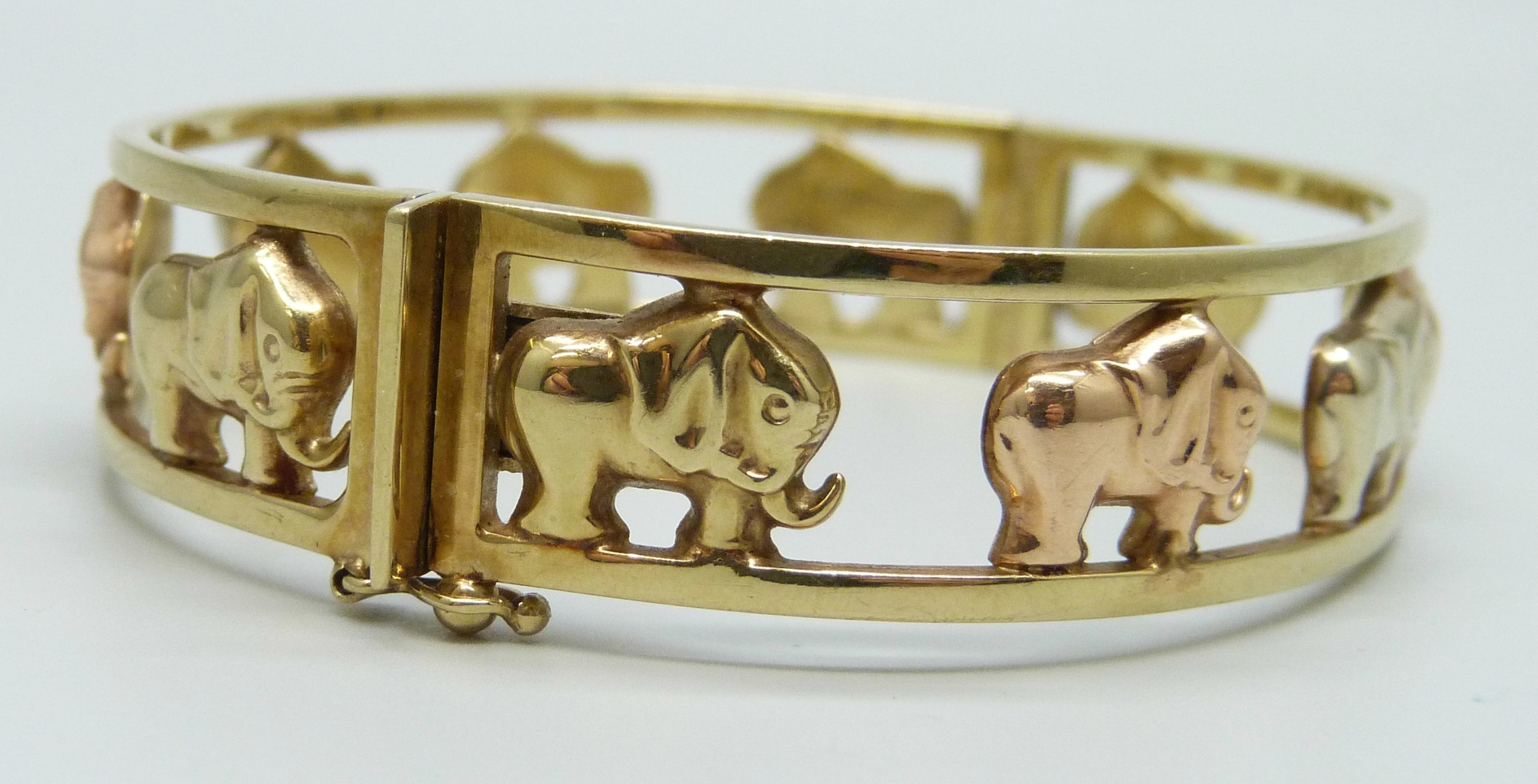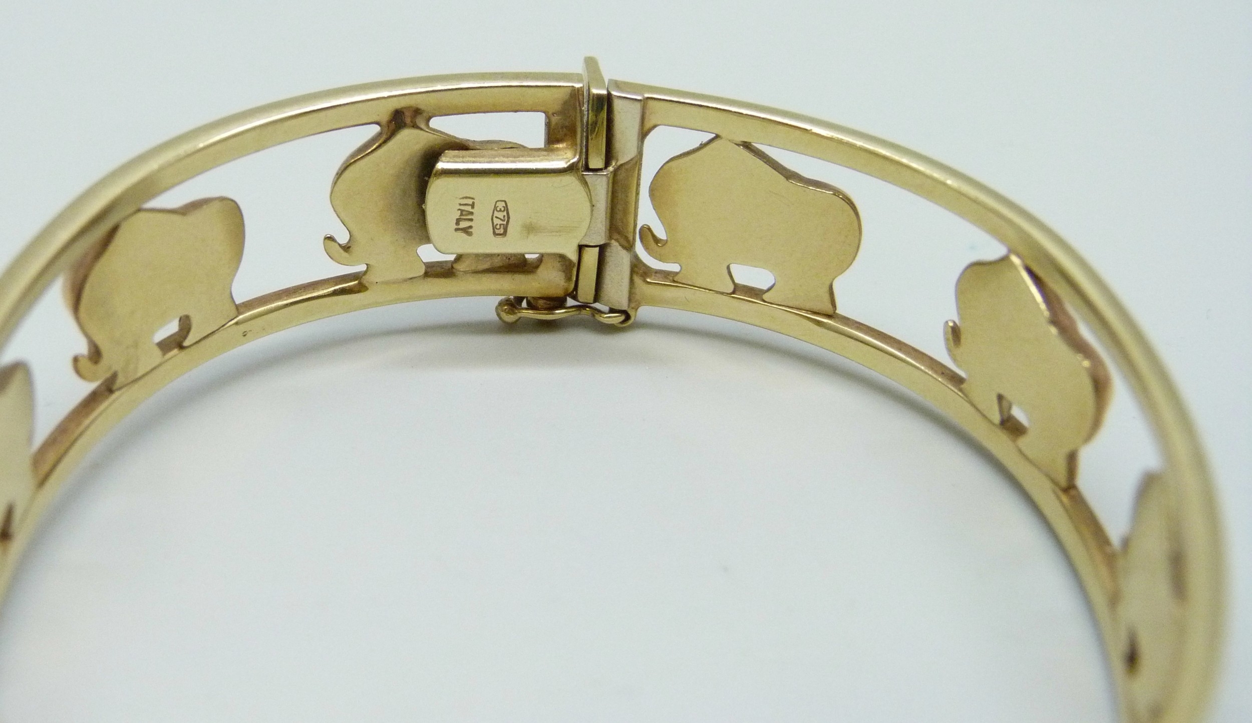 A 9ct gold Italian bangle with elephant design, 19.6g, 6 x 5.3cm