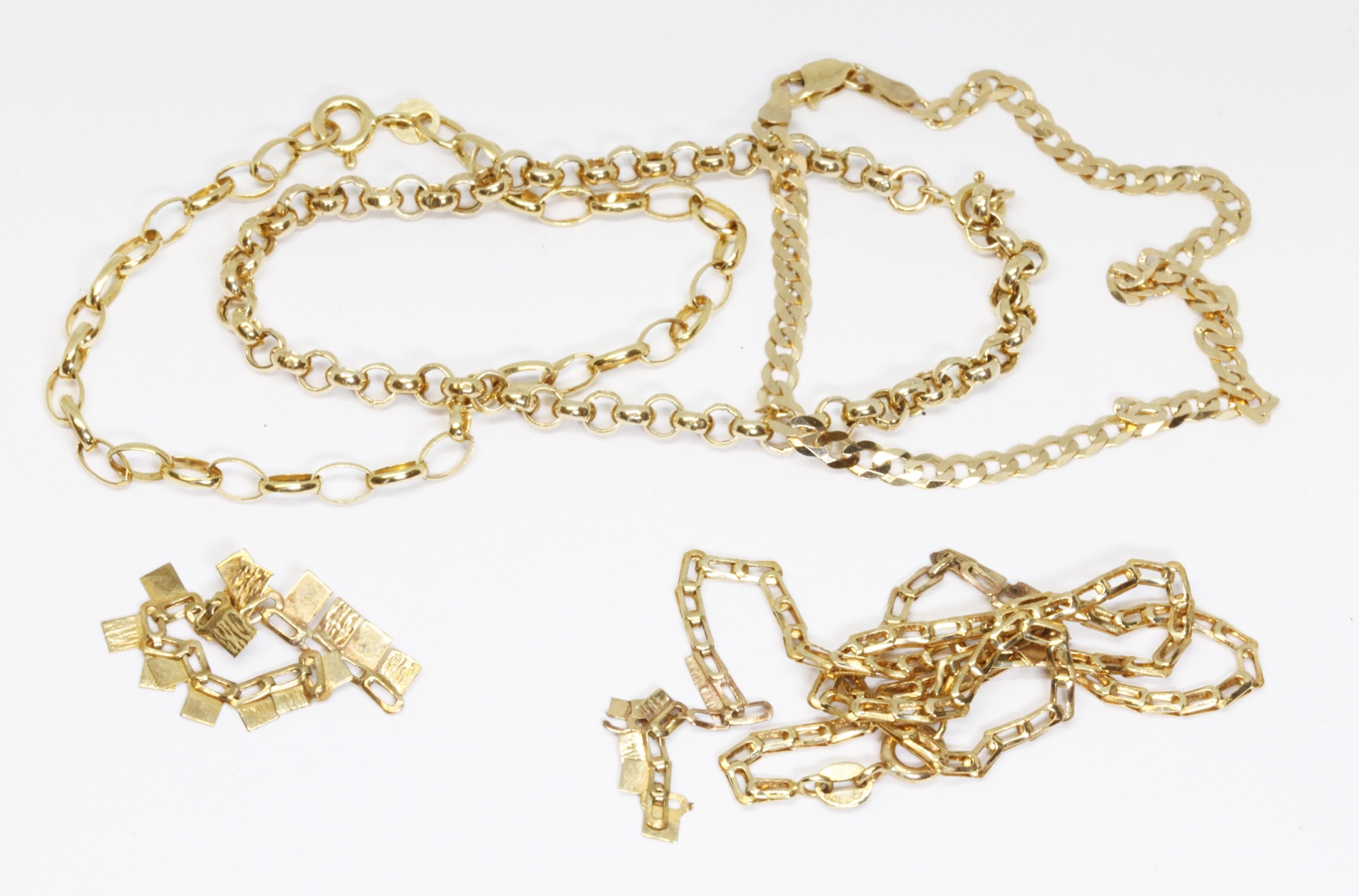 A broken 9ct gold fringe necklace and three 9ct gold bracelet, various marks, weight 9.5g.