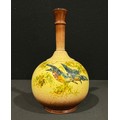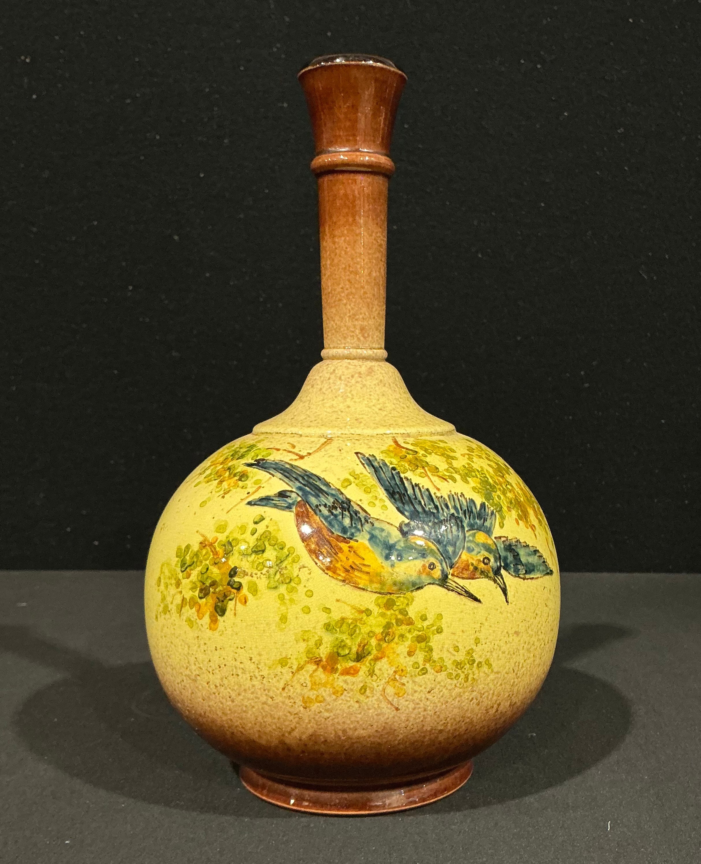 An Ault Pottery bottle vase, designed by Christopher Dresser (1834 - 1904), decorated by Clarissa Ault, painted with a pair of kingfishers, glazed in shades of ochre, yellow, blue and brown, 25cm, impressed signature mark, monogrammed, c.1890