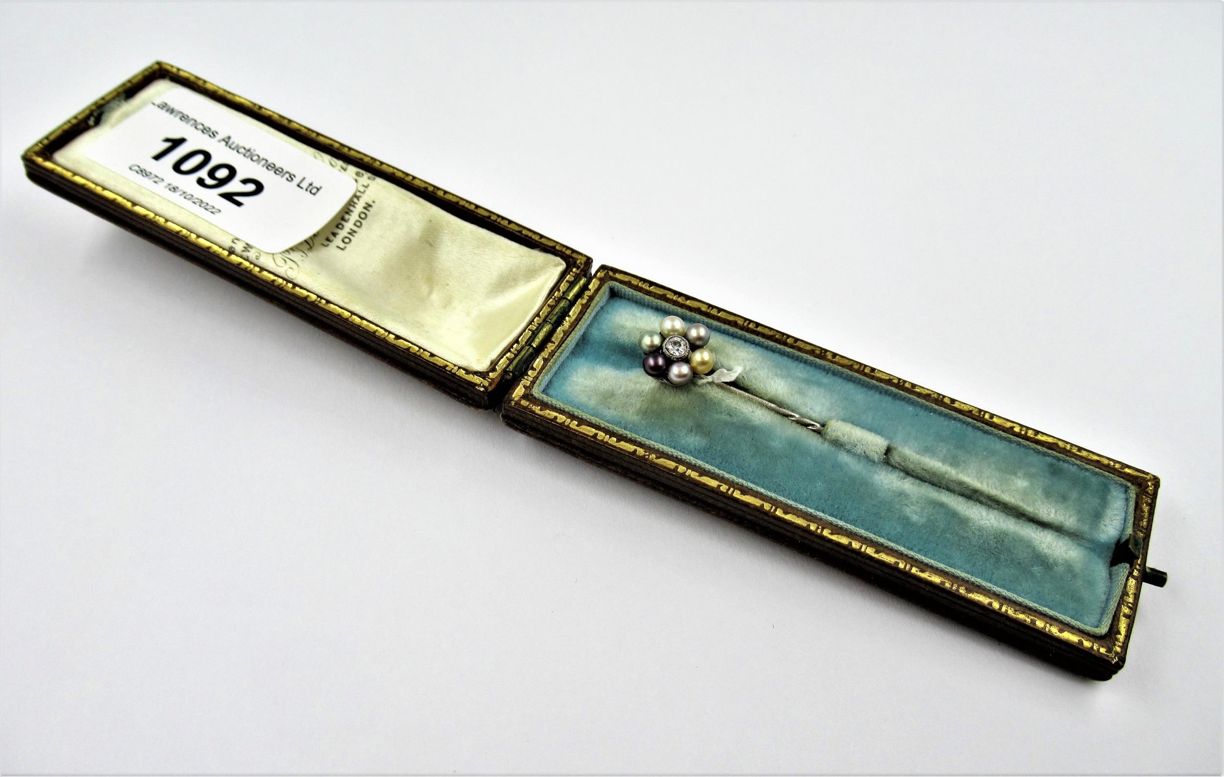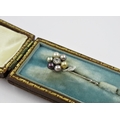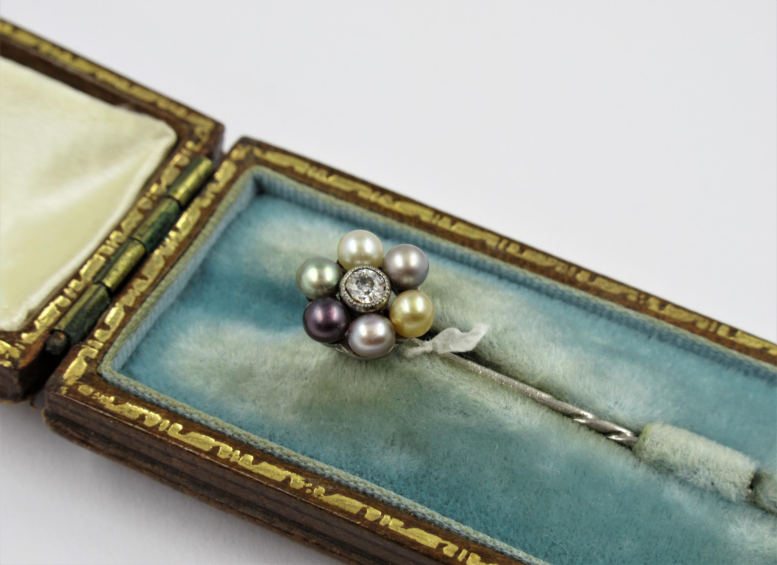 Diamond and cultured pearl flowerhead stick pin, in a fitted case