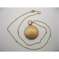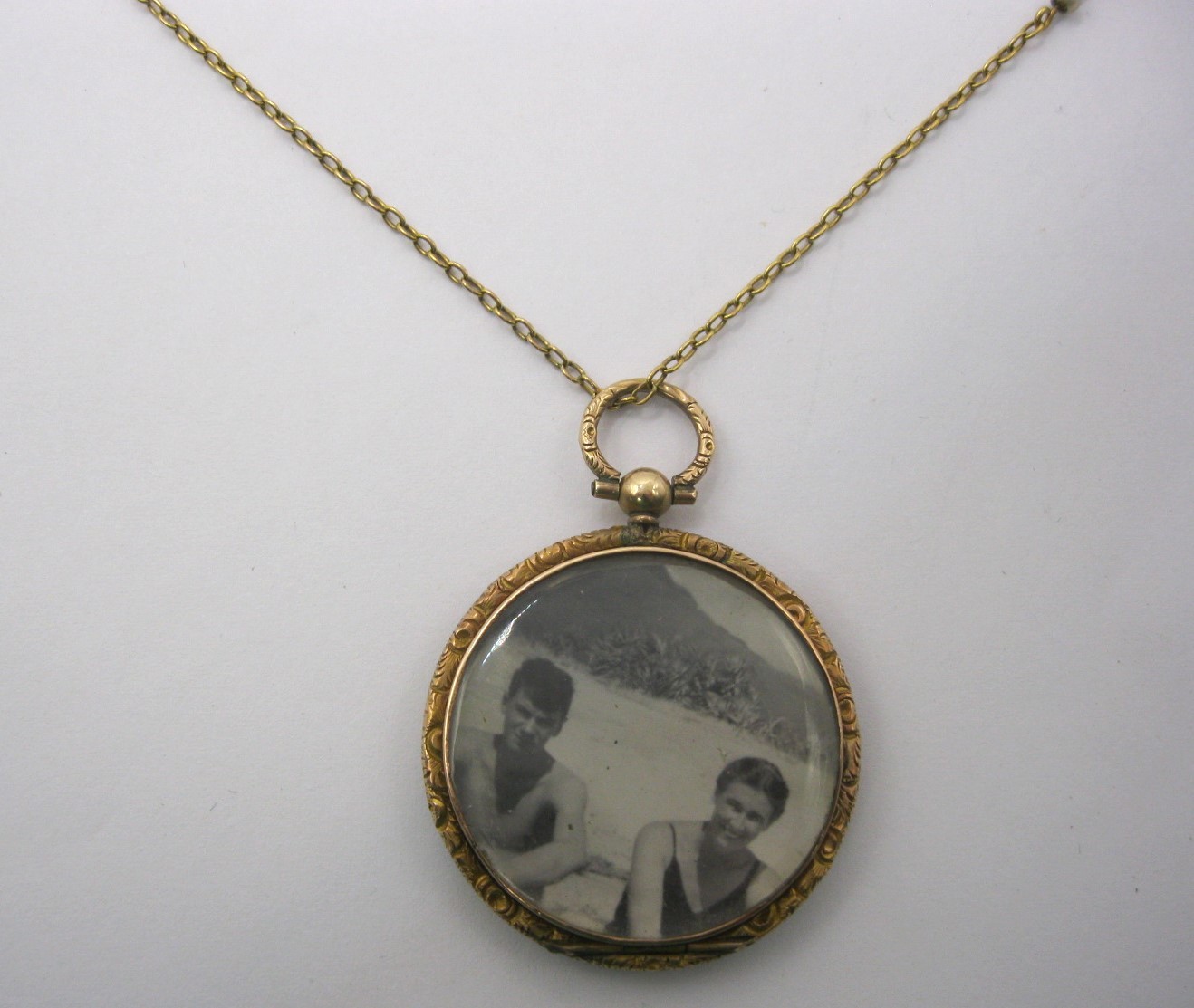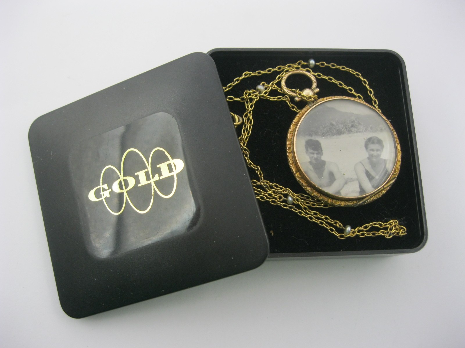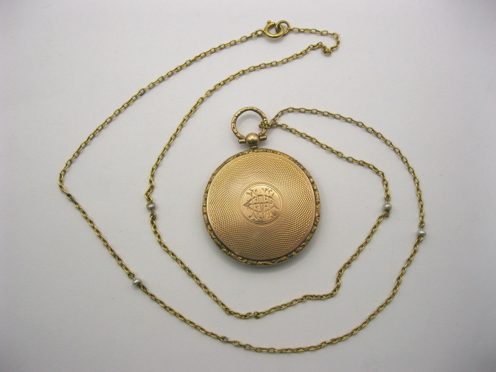 A 9 carat gold circular locket pendant on chain. The locket with British hallmarks within, gross weight of locket including glass 8.8g, diameter 33mm, engine turned back, engraved with interlinked initials. The fine gauge 56cm yellow metal cable link chain spaced with seed pearl beads, approx. 2.9g