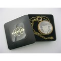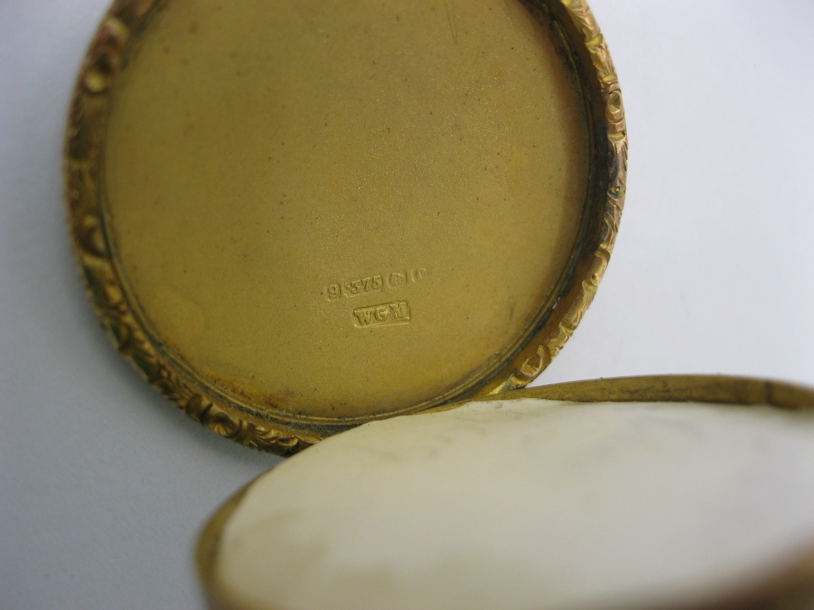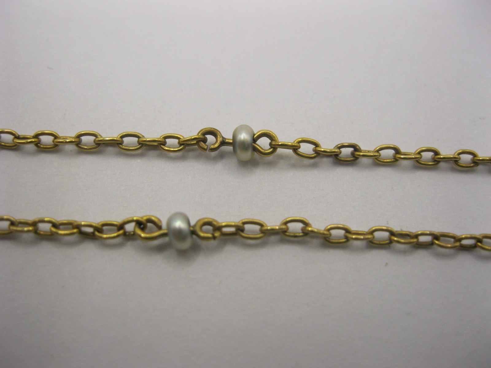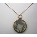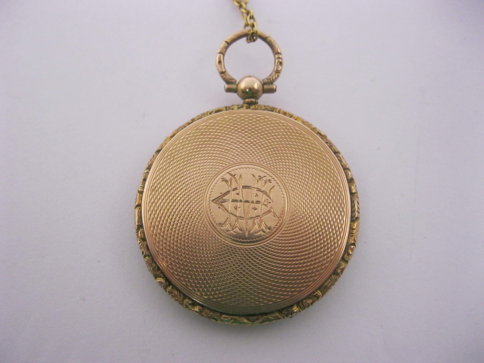 A 9 carat gold circular locket pendant on chain. The locket with British hallmarks within, gross weight of locket including glass 8.8g, diameter 33mm, engine turned back, engraved with interlinked initials. The fine gauge 56cm yellow metal cable link chain spaced with seed pearl beads, approx. 2.9g