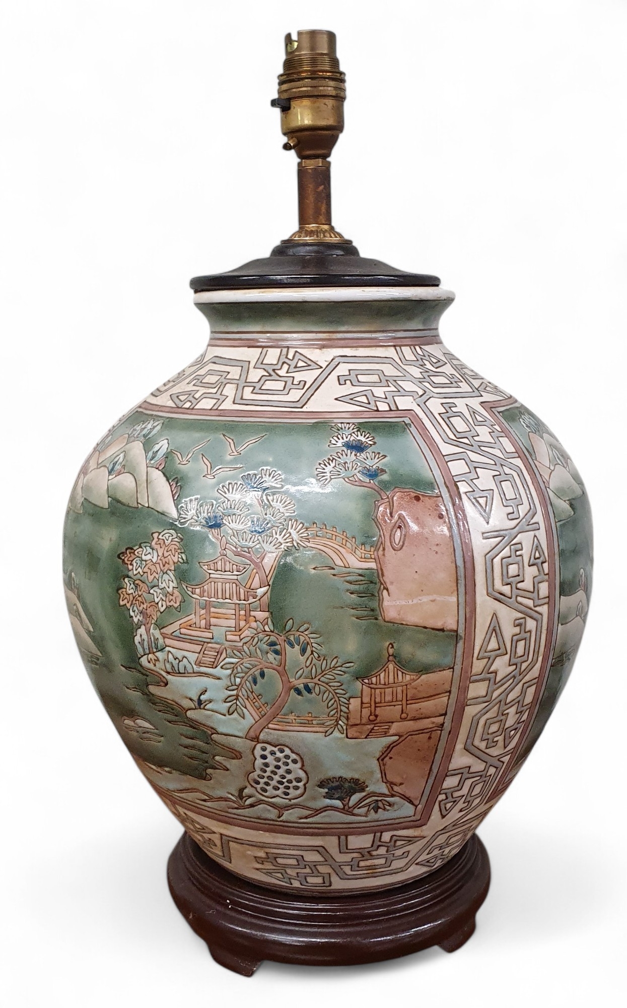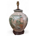 A large Oriental bulbous Lamp with hand painted panel decoration. H 40 cm approx.