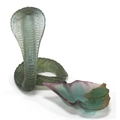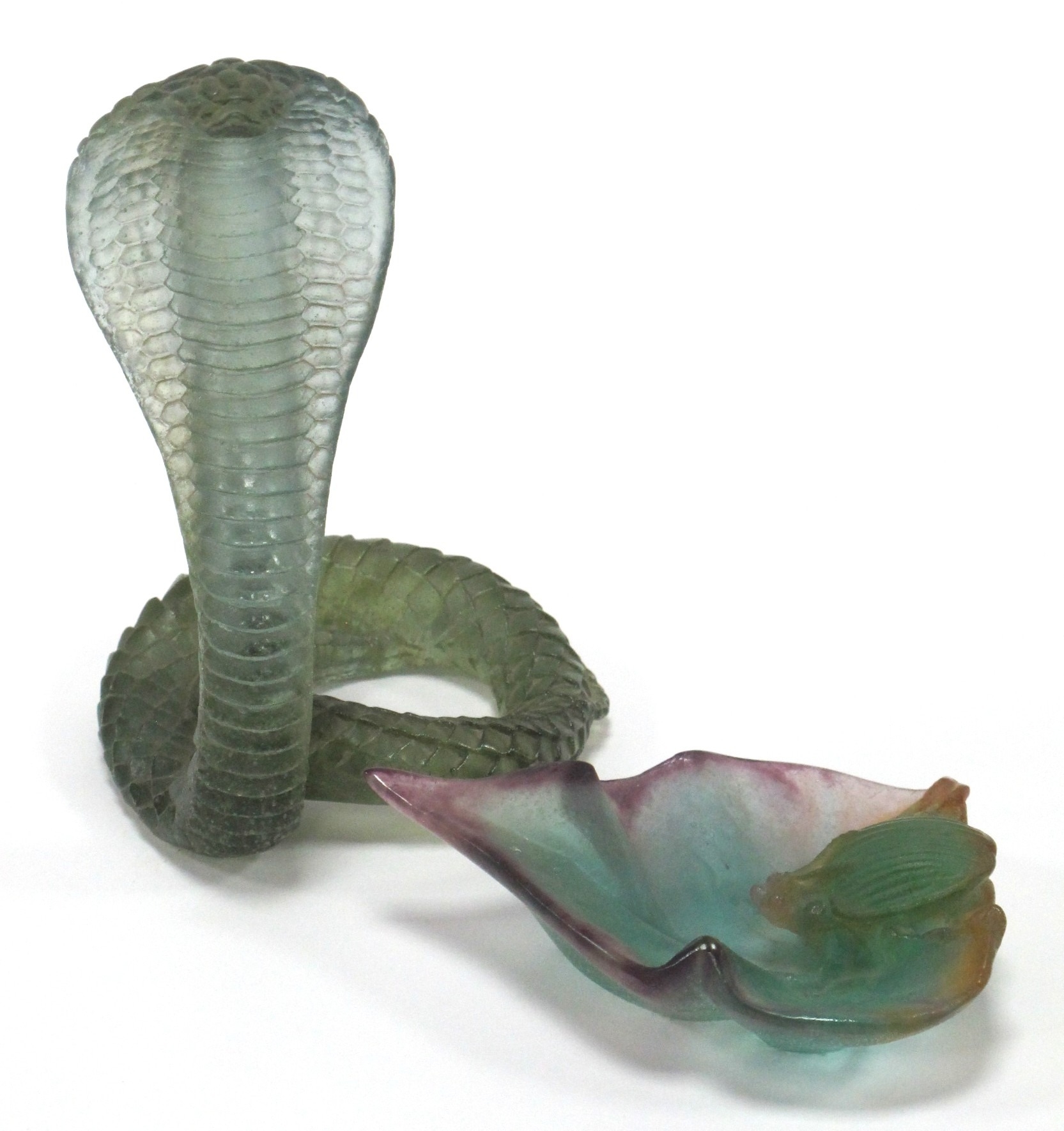A Daum Nancy Pate De Verre Glass Dish, in the form of a beetle on a leaf, signed, 10cm long; A Daum Nancy Model of a Snake, signed, 13.5cm high. (2)