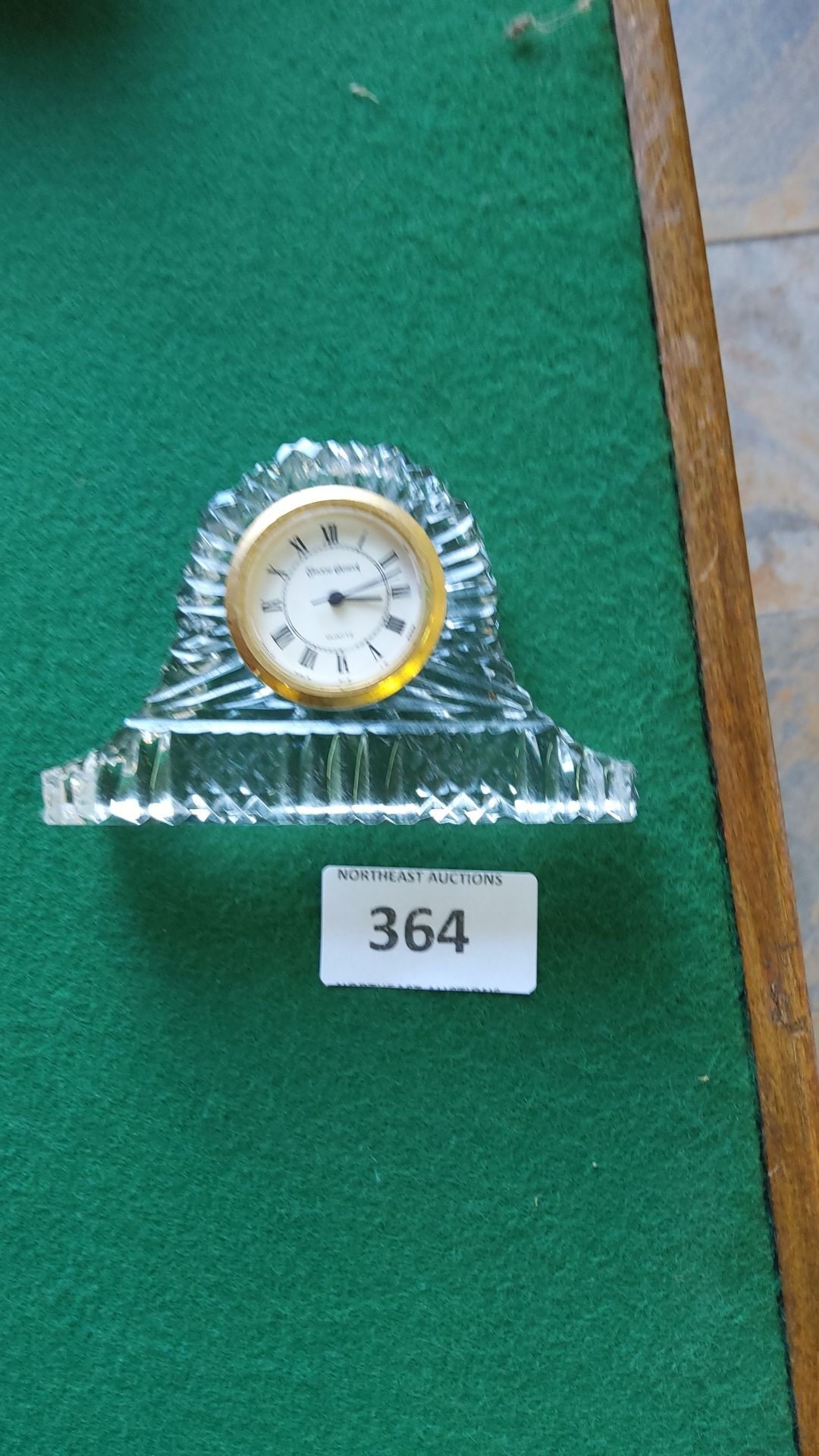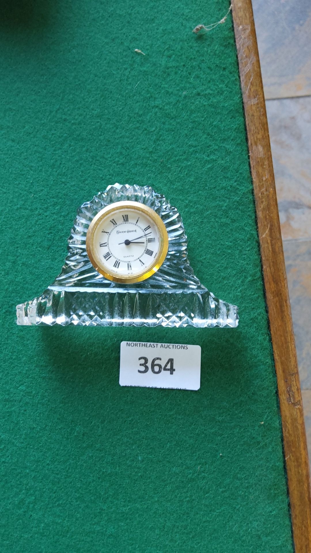 Mantel clock in lead crystal with Roman numerals, gold-toned bezel, signed "Seiko Quartz."