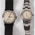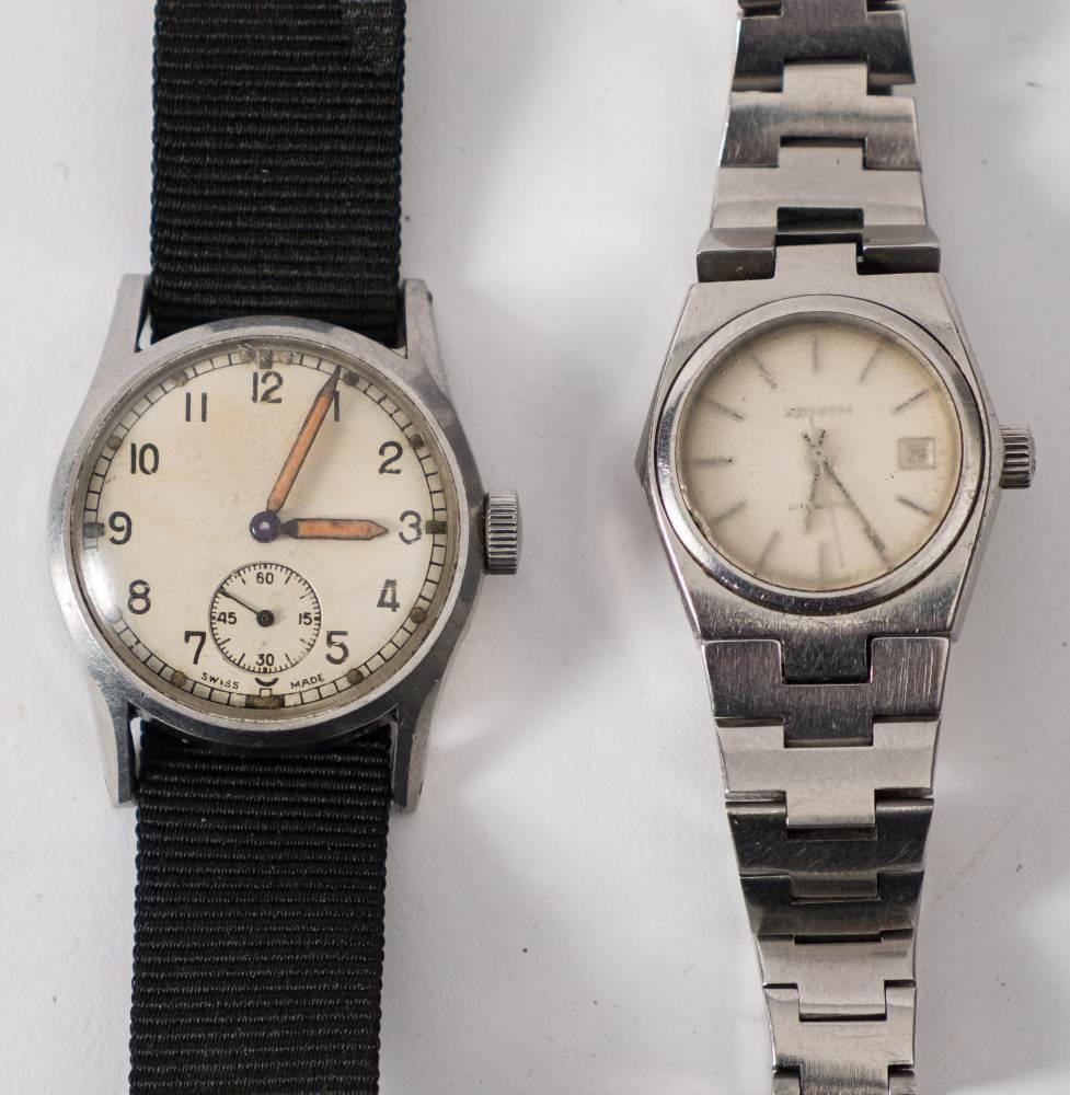 An Army Trade pattern wristwatch: with white enamel dial, Arabic numerals and subsidiary seconds dial marked 'Swiss Made' the back of the case stamped 'ATP 112716' together with a lady's stainless steel Zenith Automatic wristwatch (2)
