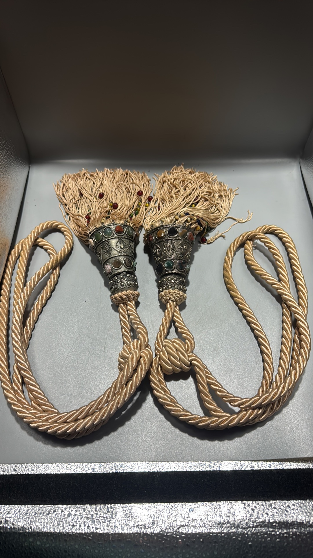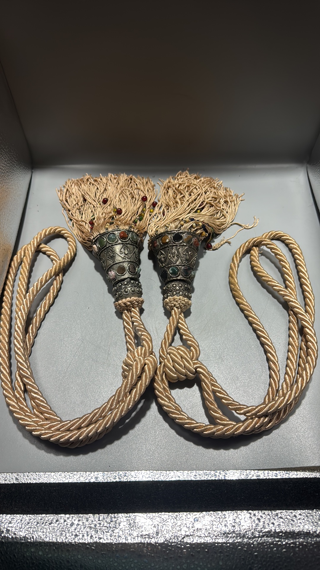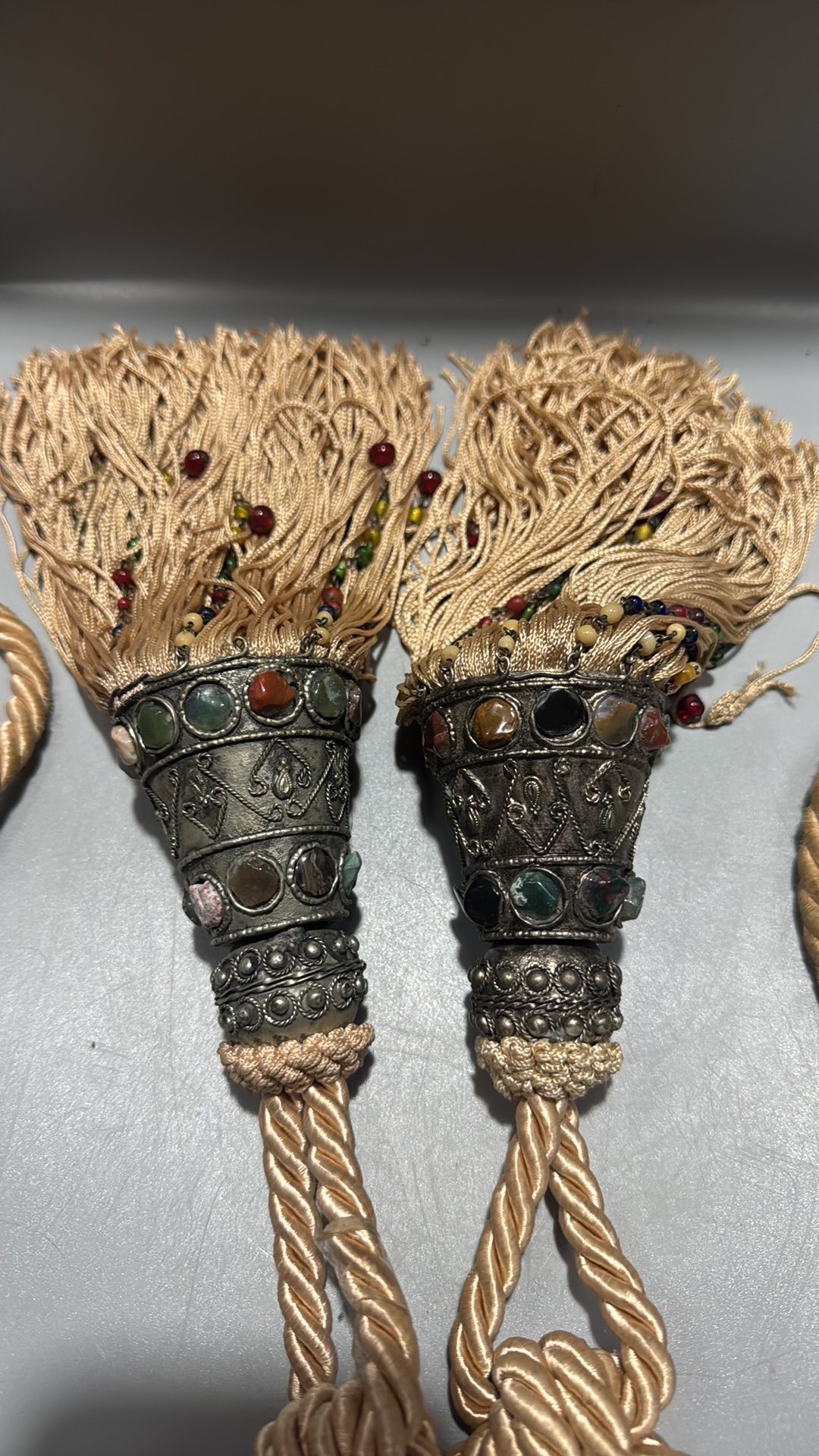 Pair of curtain tiebacks with twisted champagne cord, conical white-metal mounts inset with multicoloured cabochon glass and long beaded rayon fringes.