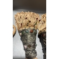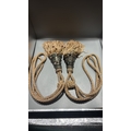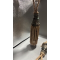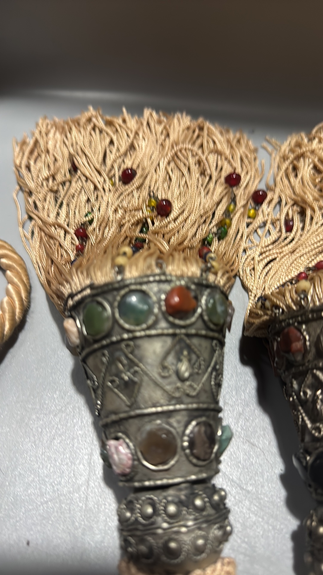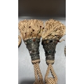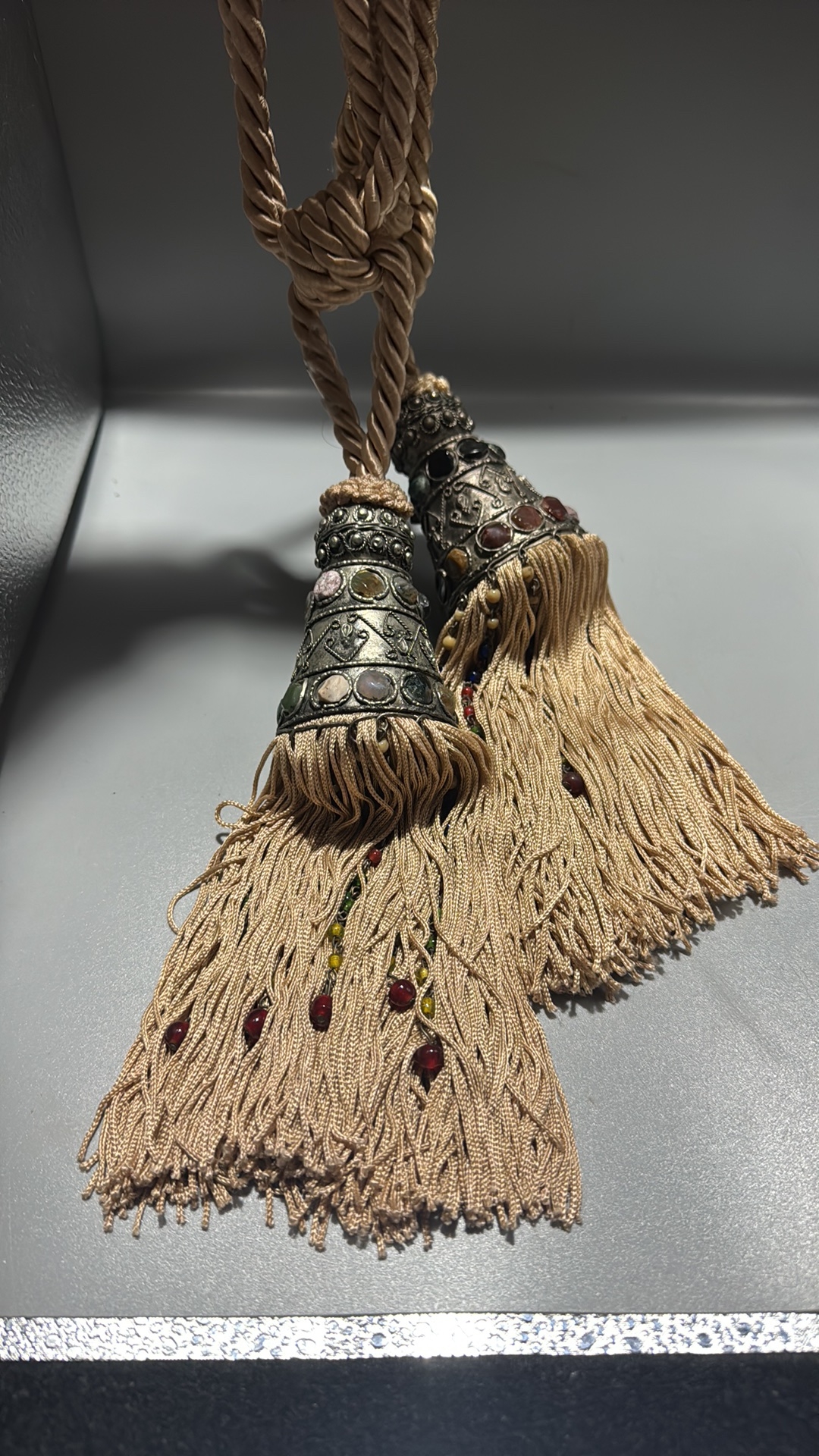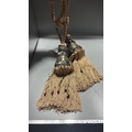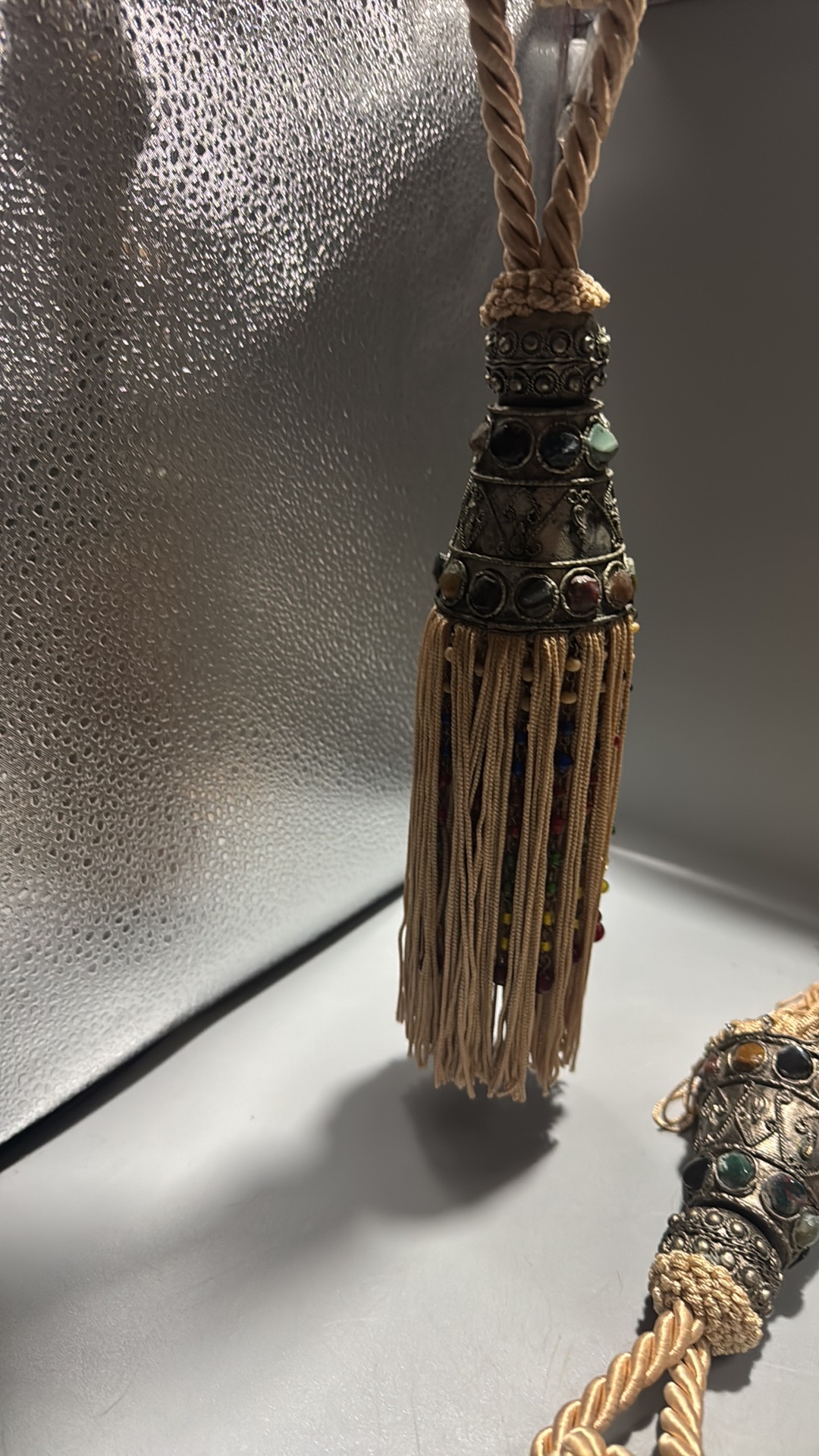 Pair of curtain tiebacks with twisted champagne cord, conical white-metal mounts inset with multicoloured cabochon glass and long beaded rayon fringes.