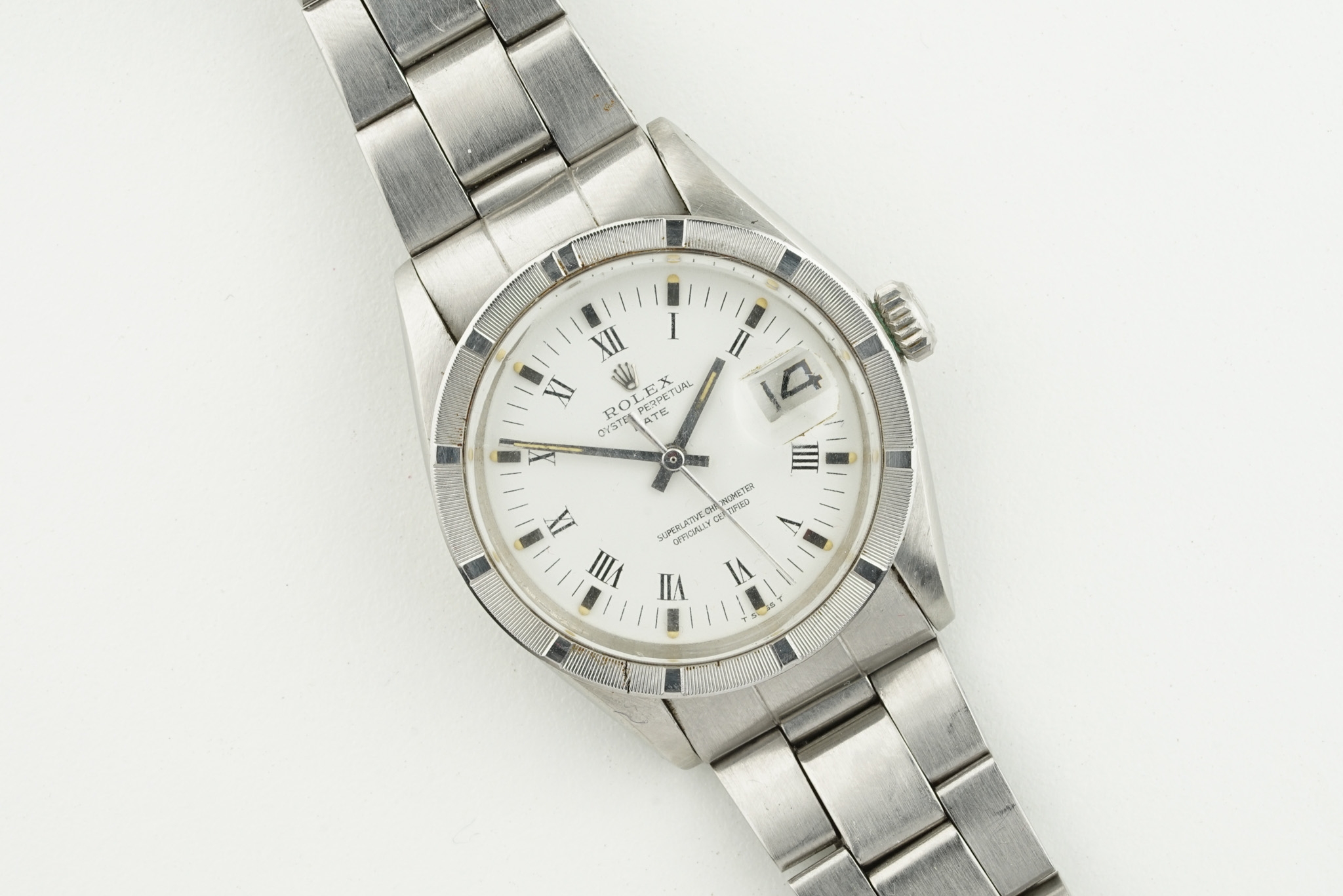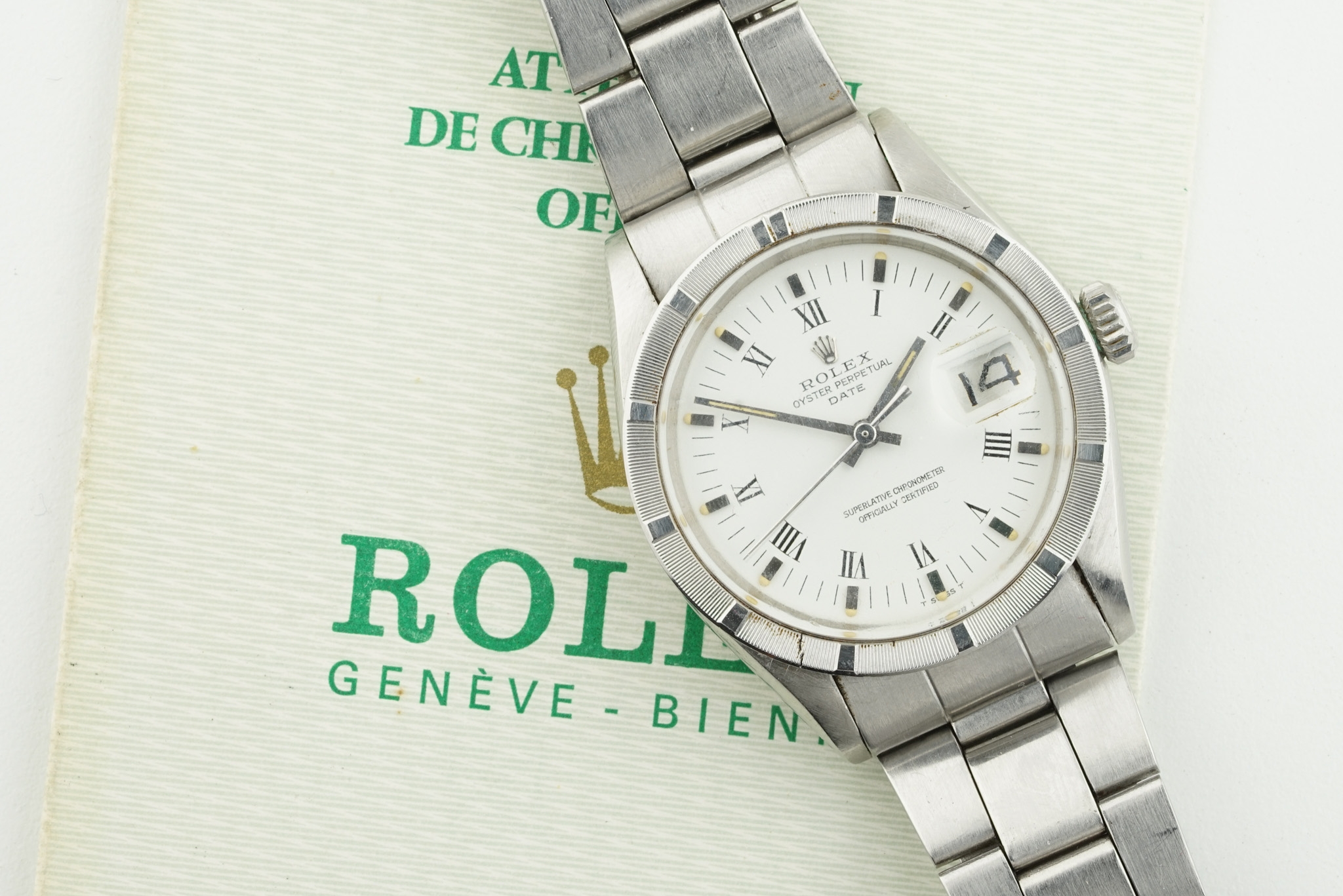 ROLEX OYSTER PERPETUAL DATE ROMAN NUMERAL DIAL W/ GUARANTEE PAPERS REF. 1501 CIRCA 1973, circular white dial with roman numeral hour markers and hands, 34mm stainless steel case with a crown and a case back, inside is an automatic rolex movement, on a stainless steel folded link rolex bracelet, comes with guarantee papers, currently running.