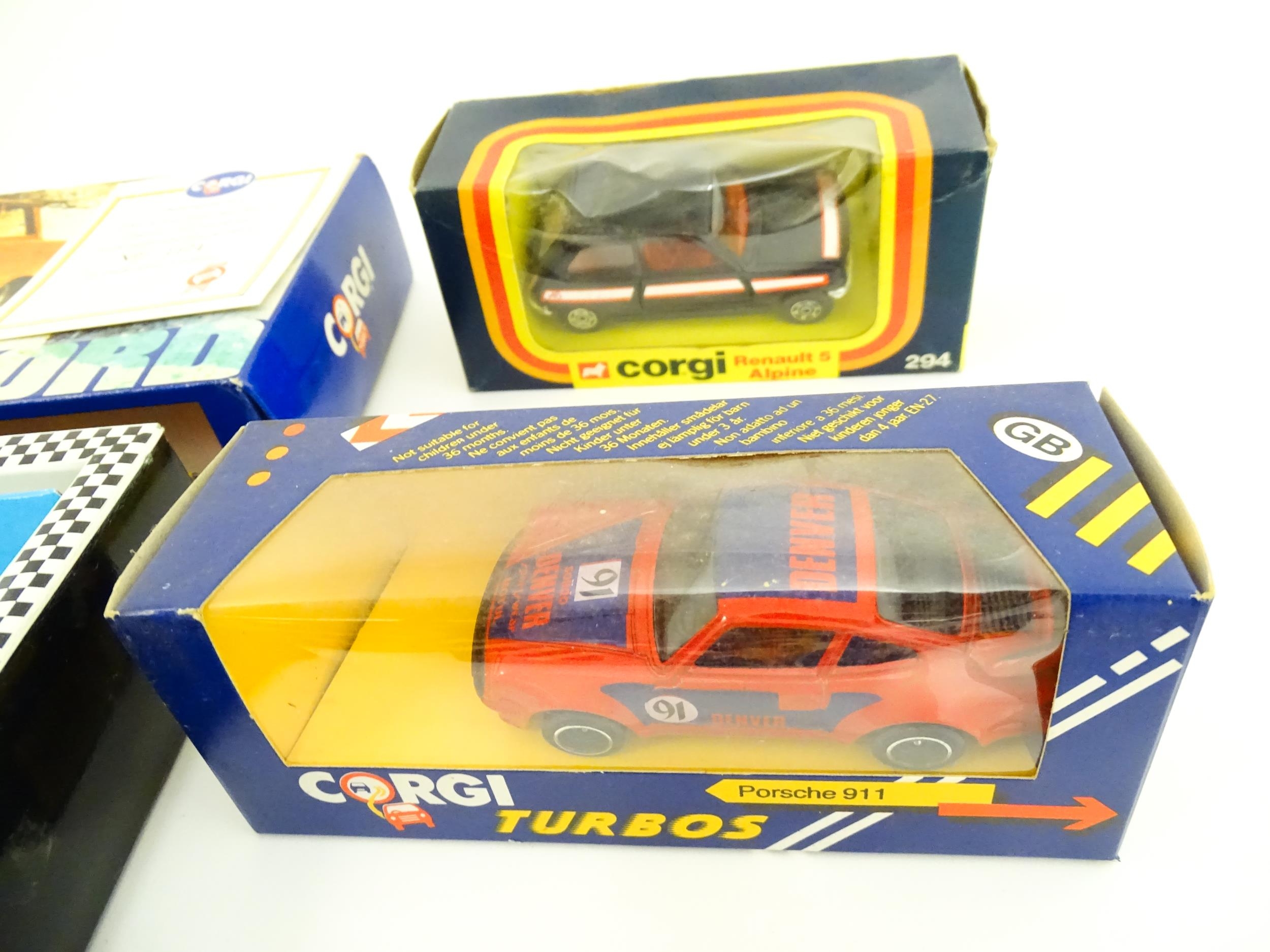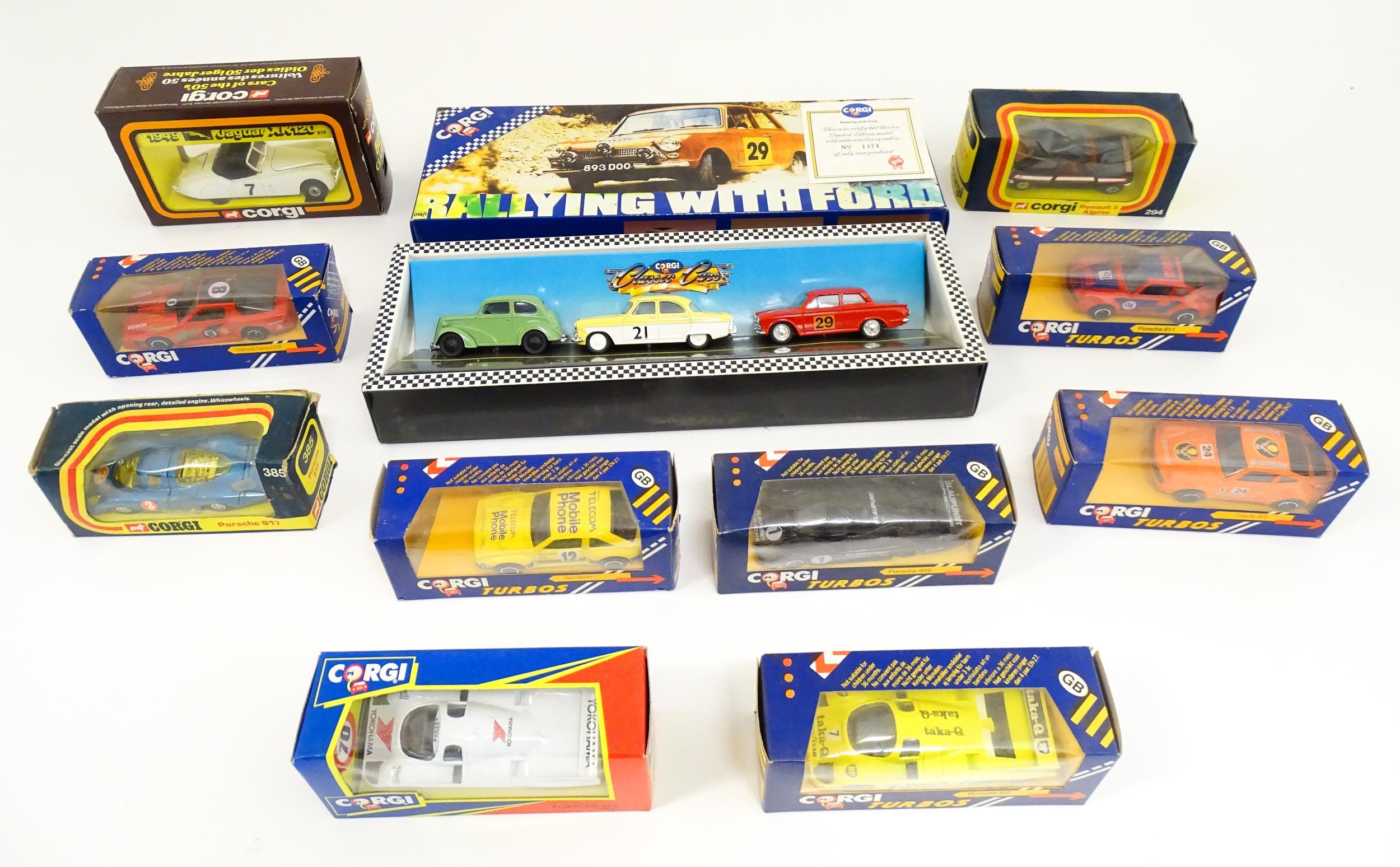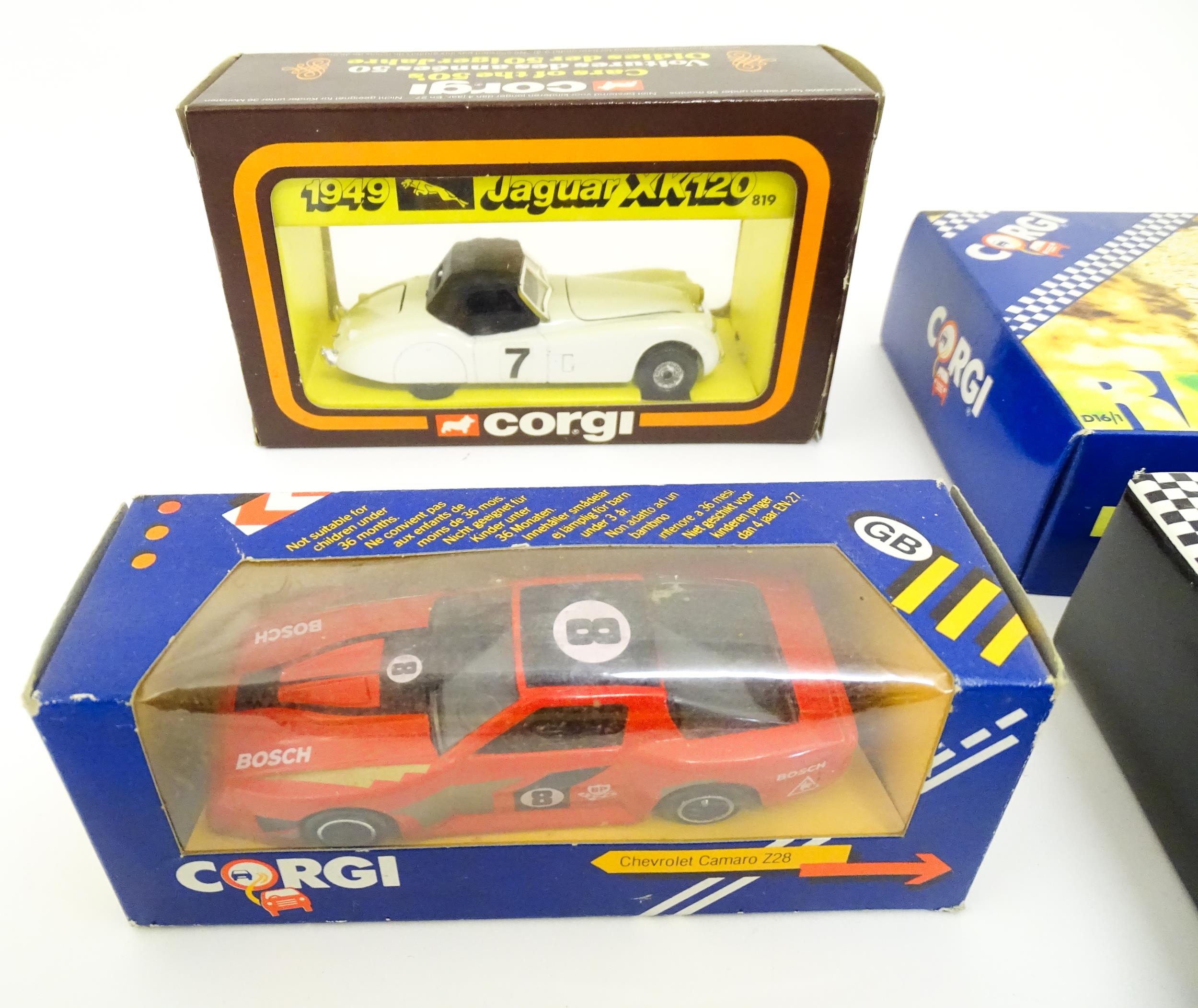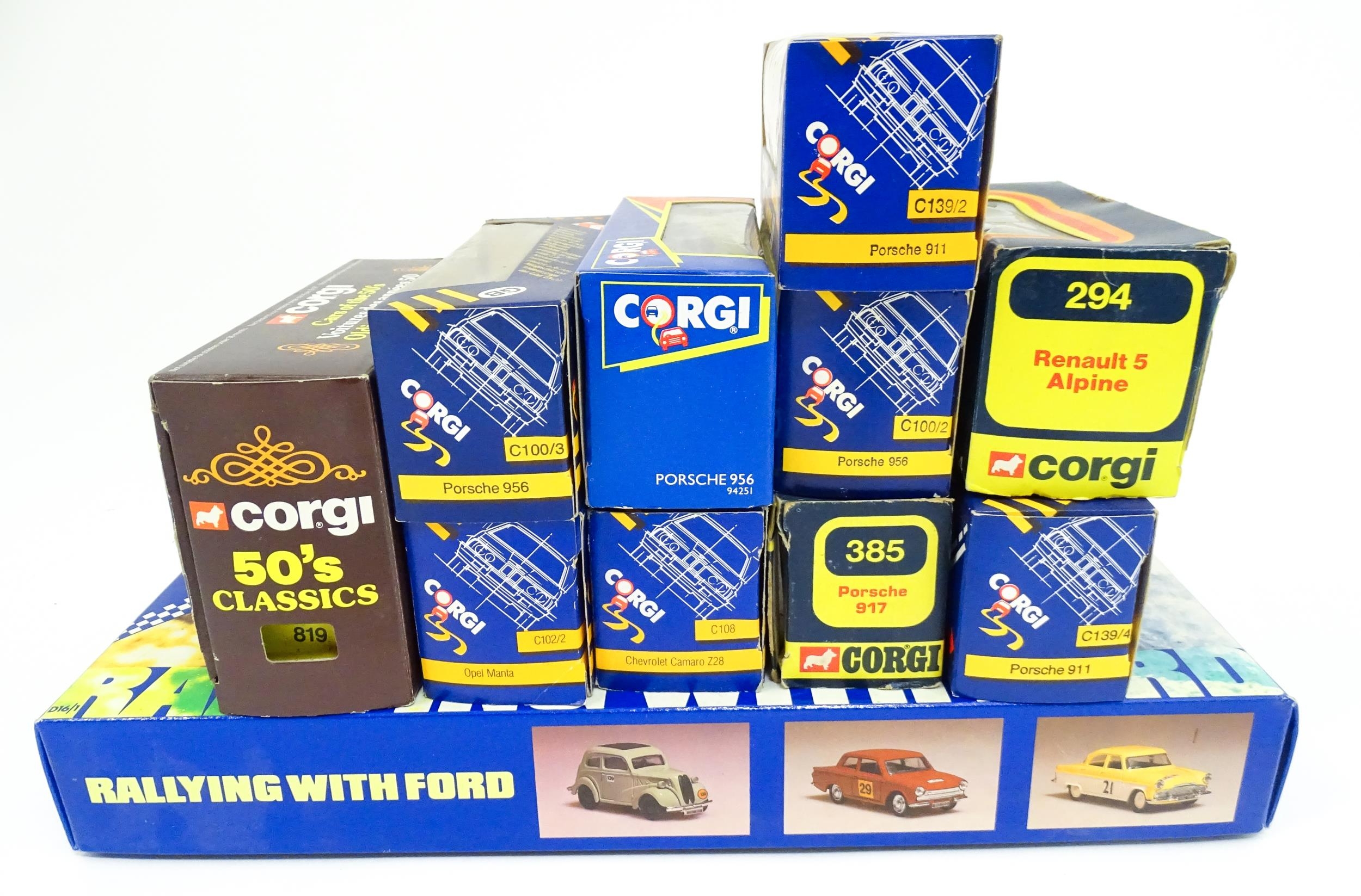 Toys: A quantity of boxed Corgi Toys die cast scale model cars, to include Renault 5 Alpine, Porsche 956, Chevrolet Camaro Z28, Opel Manta, Porsche 911, Porsche 917, Jaguar XK120, etc. Together with a boxed Corgi Rallying With Ford gift set. (11)