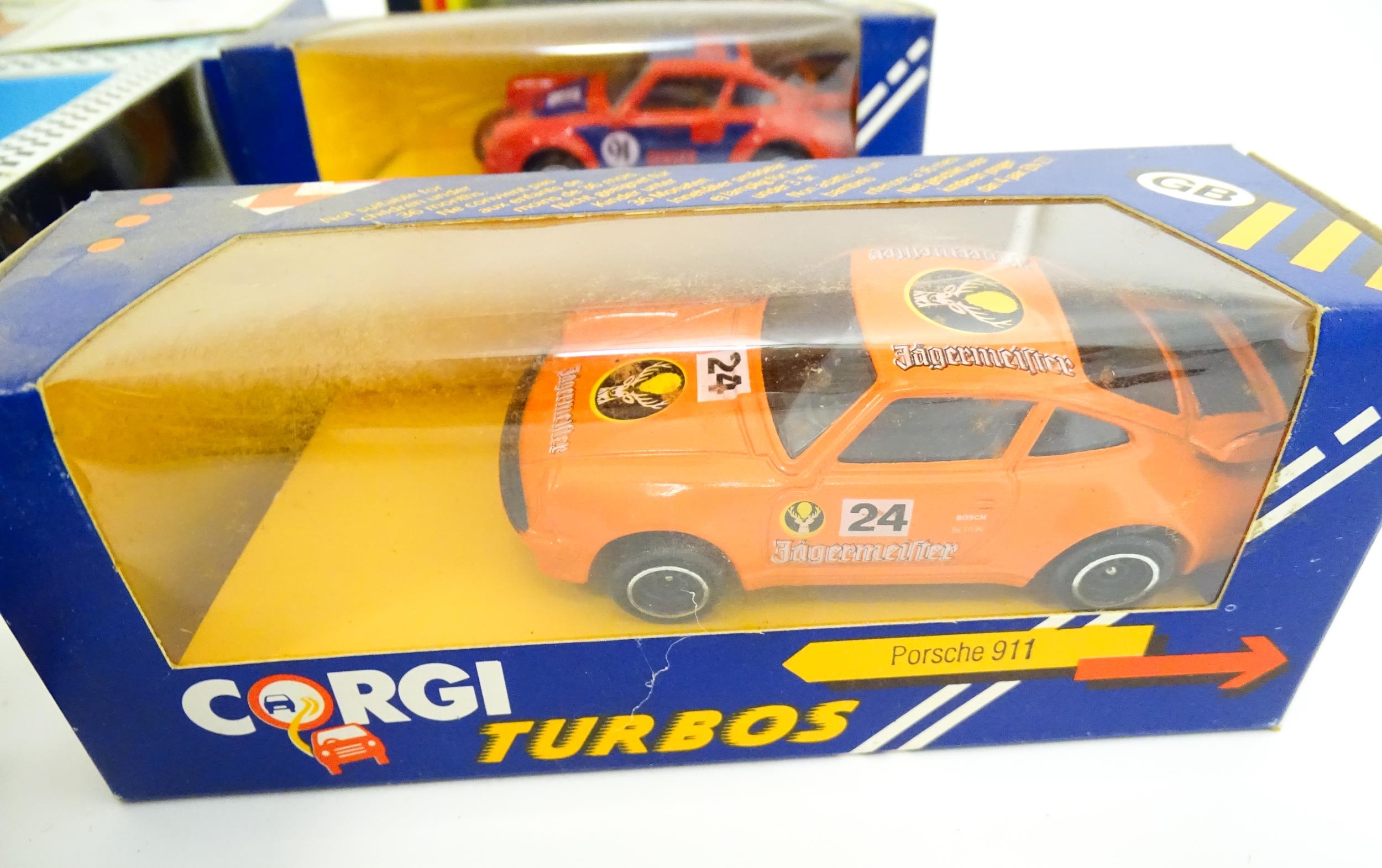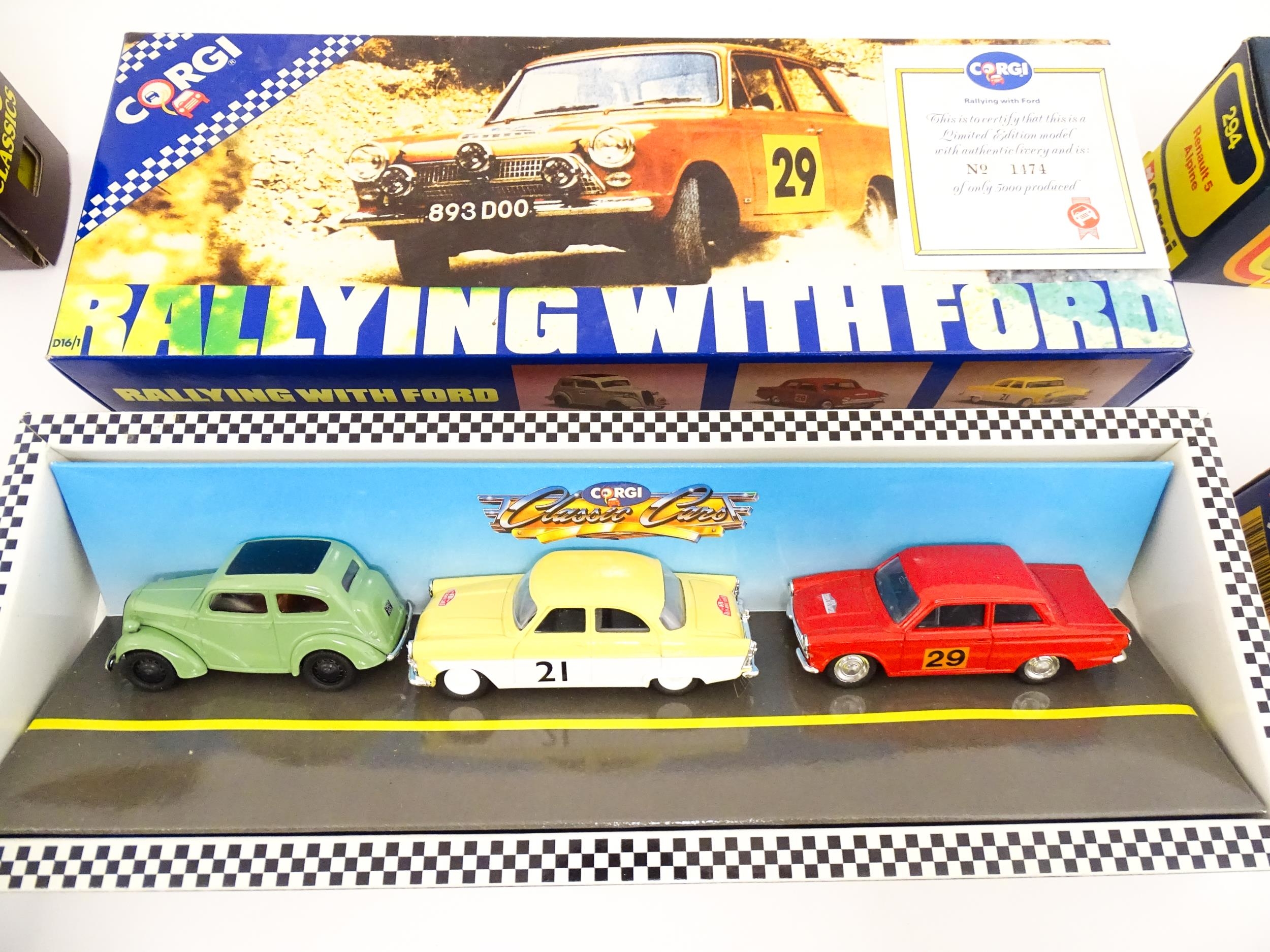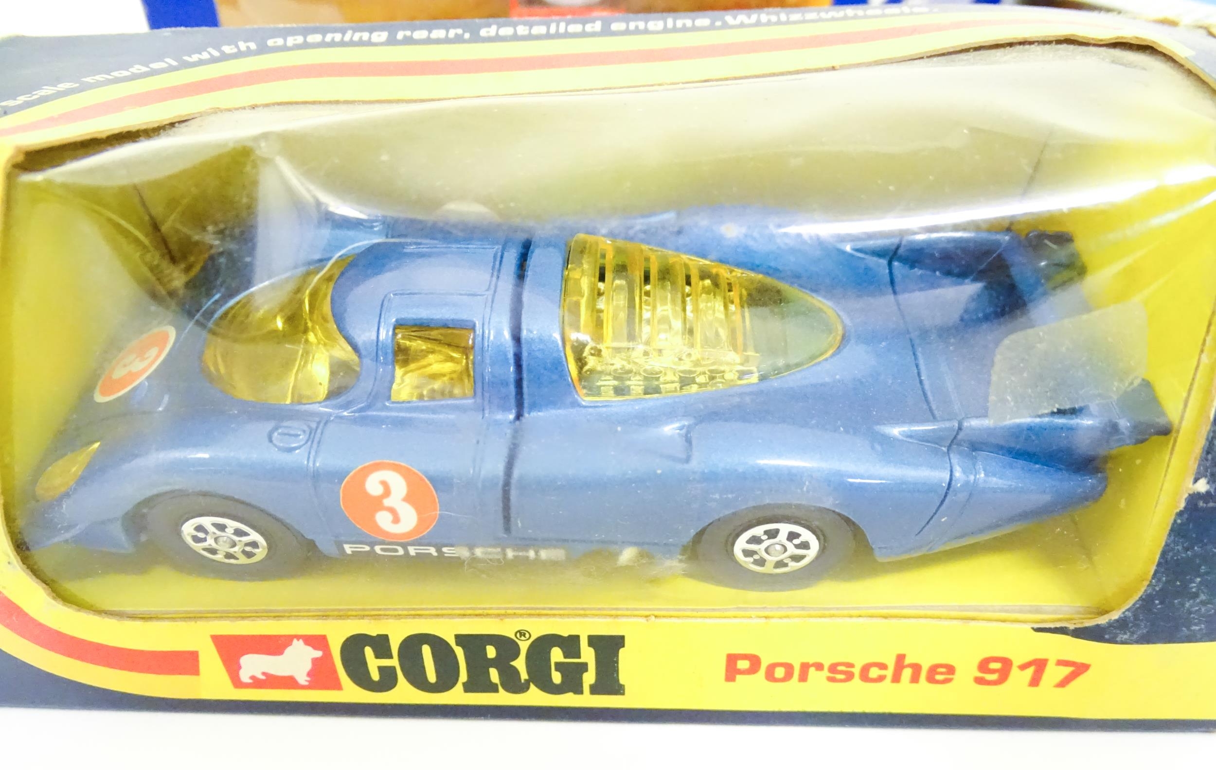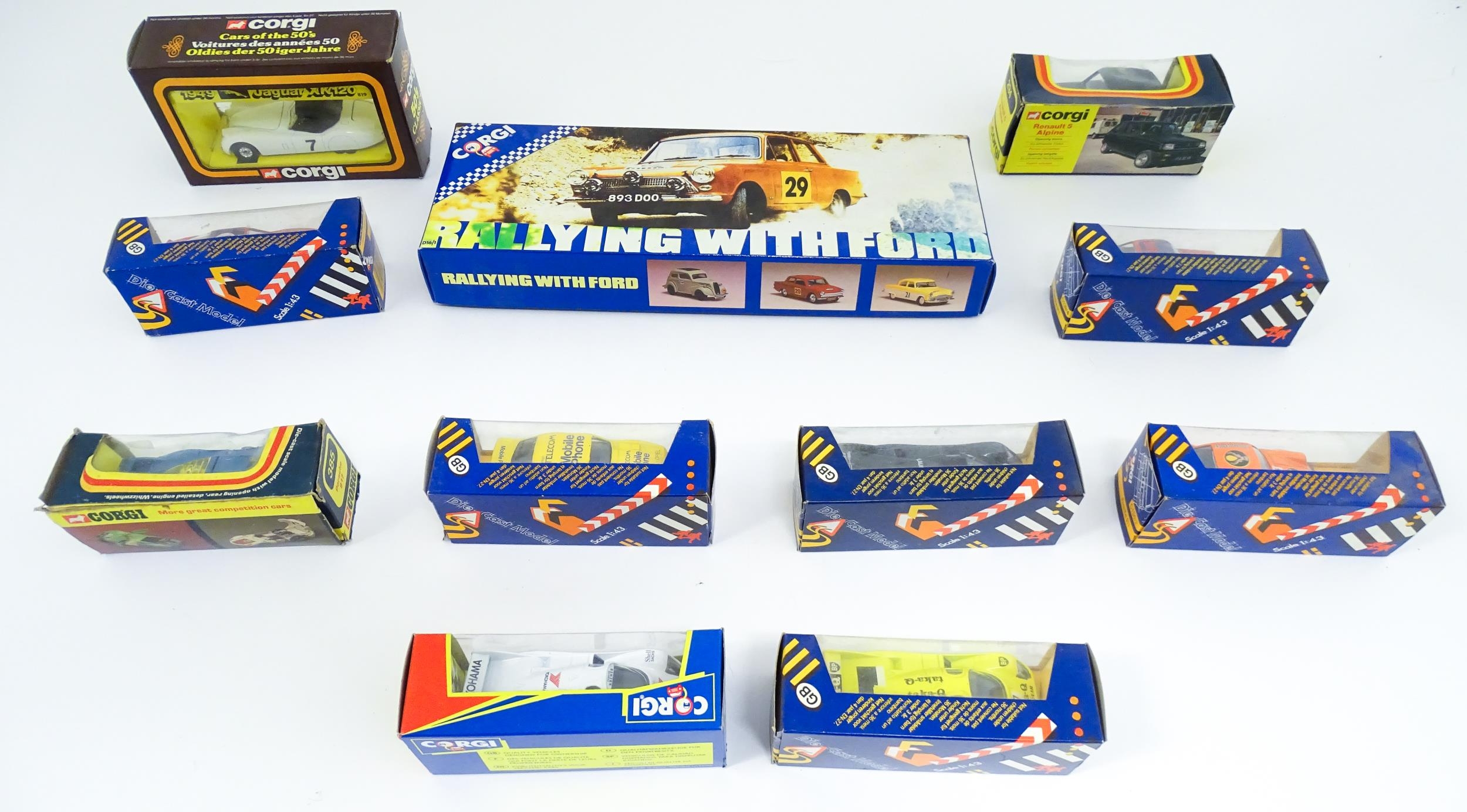 Toys: A quantity of boxed Corgi Toys die cast scale model cars, to include Renault 5 Alpine, Porsche 956, Chevrolet Camaro Z28, Opel Manta, Porsche 911, Porsche 917, Jaguar XK120, etc. Together with a boxed Corgi Rallying With Ford gift set. (11)