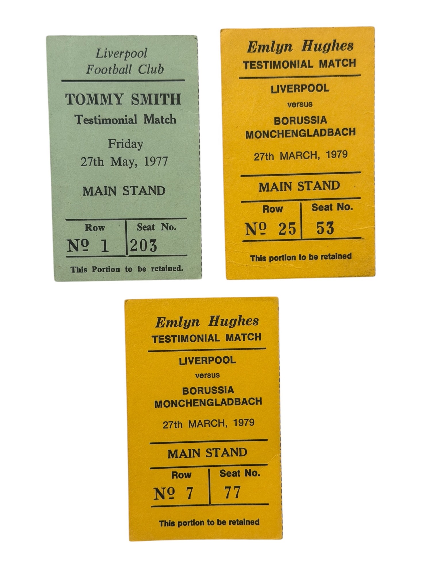 X3 LIVERPOOL 1970s TESTIMONIAL FOOTBALL TICKET STUBS, TOMMY SMITH TESTIMONIAL 27/5/1977, EMLYN HUGHES TESTIMONIAL VERSUS MONCHENGLADBACH 27/3/1979 x2. GOOD.