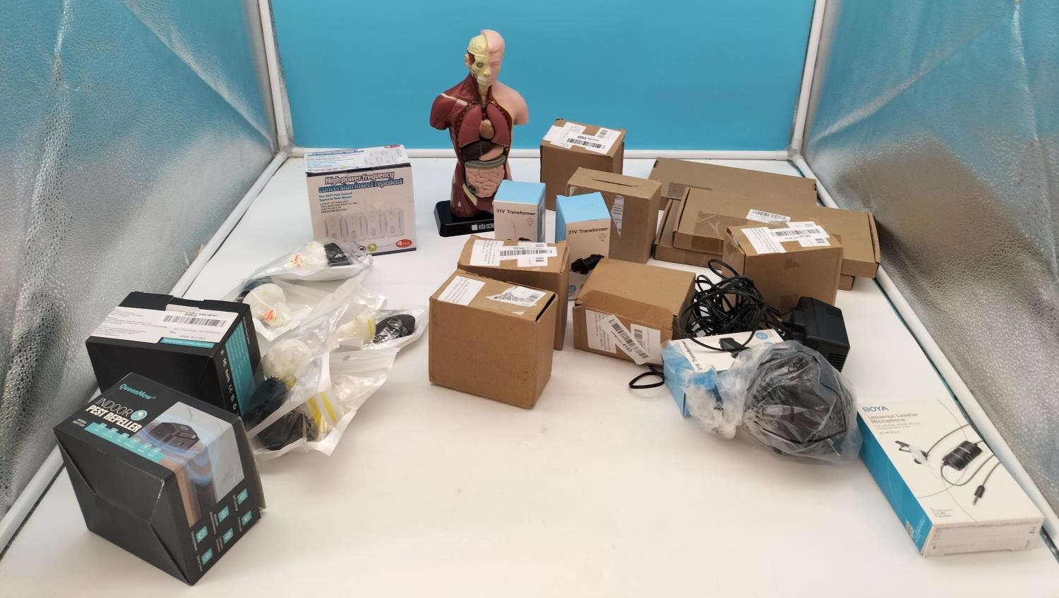 Box of Mixed New Items to include Pest Repellents, 31v Transformers, Jubilee Clips, etc.