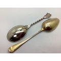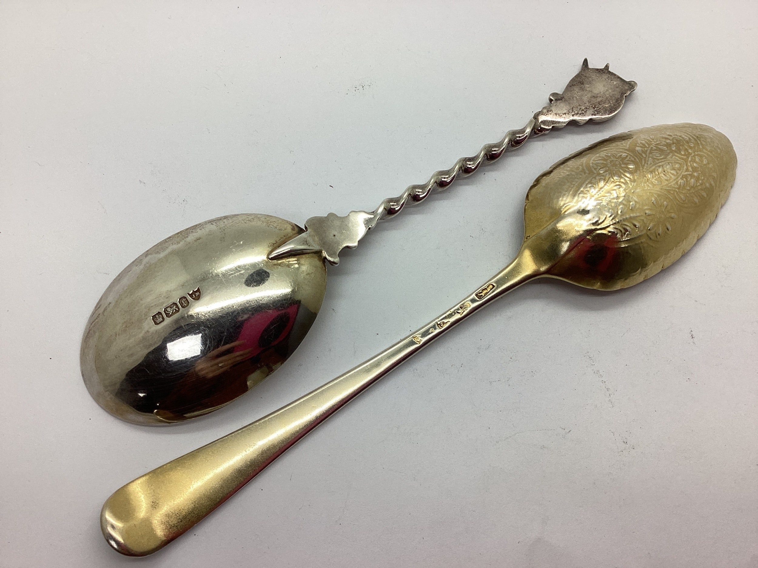 A Highly Decorative Hallmarked Silver Gilt Dessert / Berry Spoon, (bottom struck) TS (unclear), profusely detailed and initialled; A Hallmarked Silver Serving Spoon, JM, Sheffield 1895, with twisted stem and decorative finial (total weight 110grams). (2)