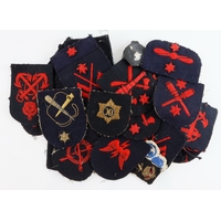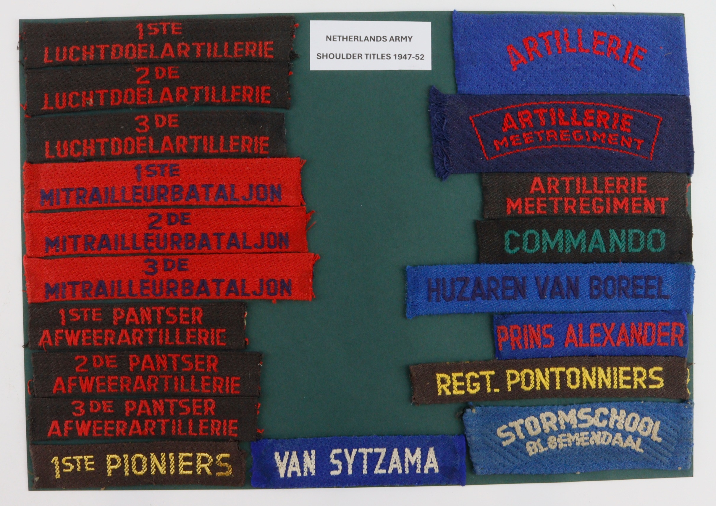 CLOTH BADGES – NETHERLANDS ARMY Shoulder Title badges in use between 1947 and 1952 including COMMANDO – ANTI-AIRCRAFT ARTILLERY, ANTI-TANK ARTILLERY, MACHINE GUN BATTALIONS, BLUE HUSSARS RECCE REGIMENT LIGHT TANKS, WHITE HUSSARS INFANTRY TANKS and RED HUSSARS MEDIUM TANKS all the badges are in excellent condition. (19 items)