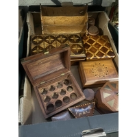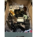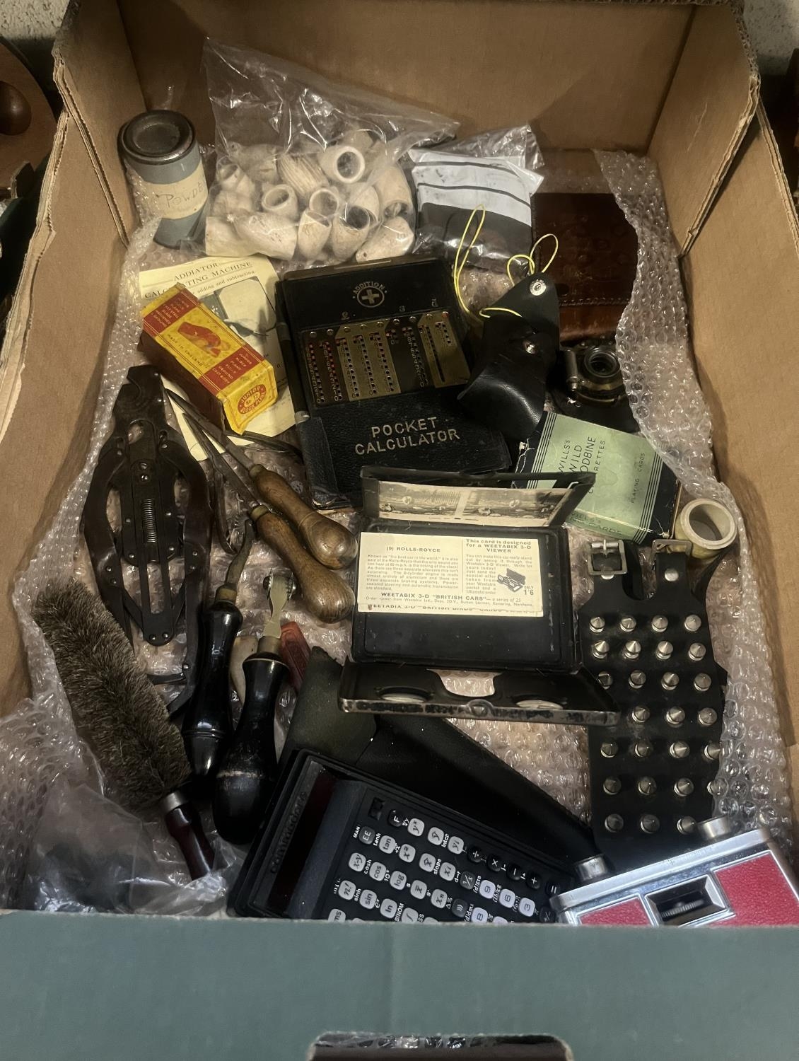 Box containing curios including a pocket calculator, vintage 3D viewer and a Junior Block Plane No. 12