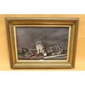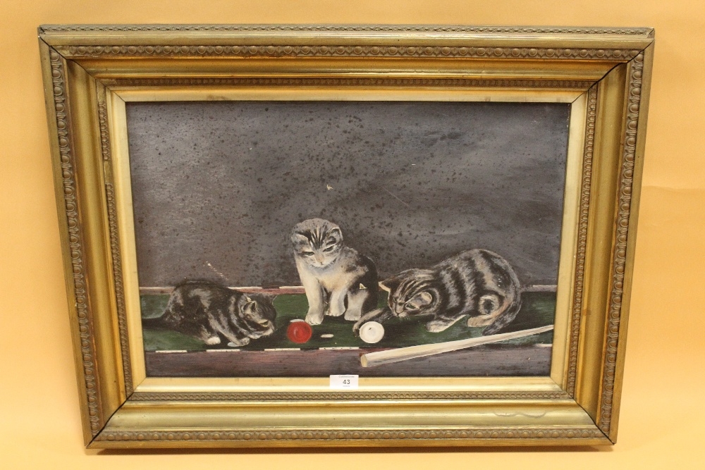 A GILT FRAMED OIL ON CANVAS DEPICTING A TRIO OF CATS UPON A SNOOKER TABLE - OVERALL SIZE 73 X 55.5 CM