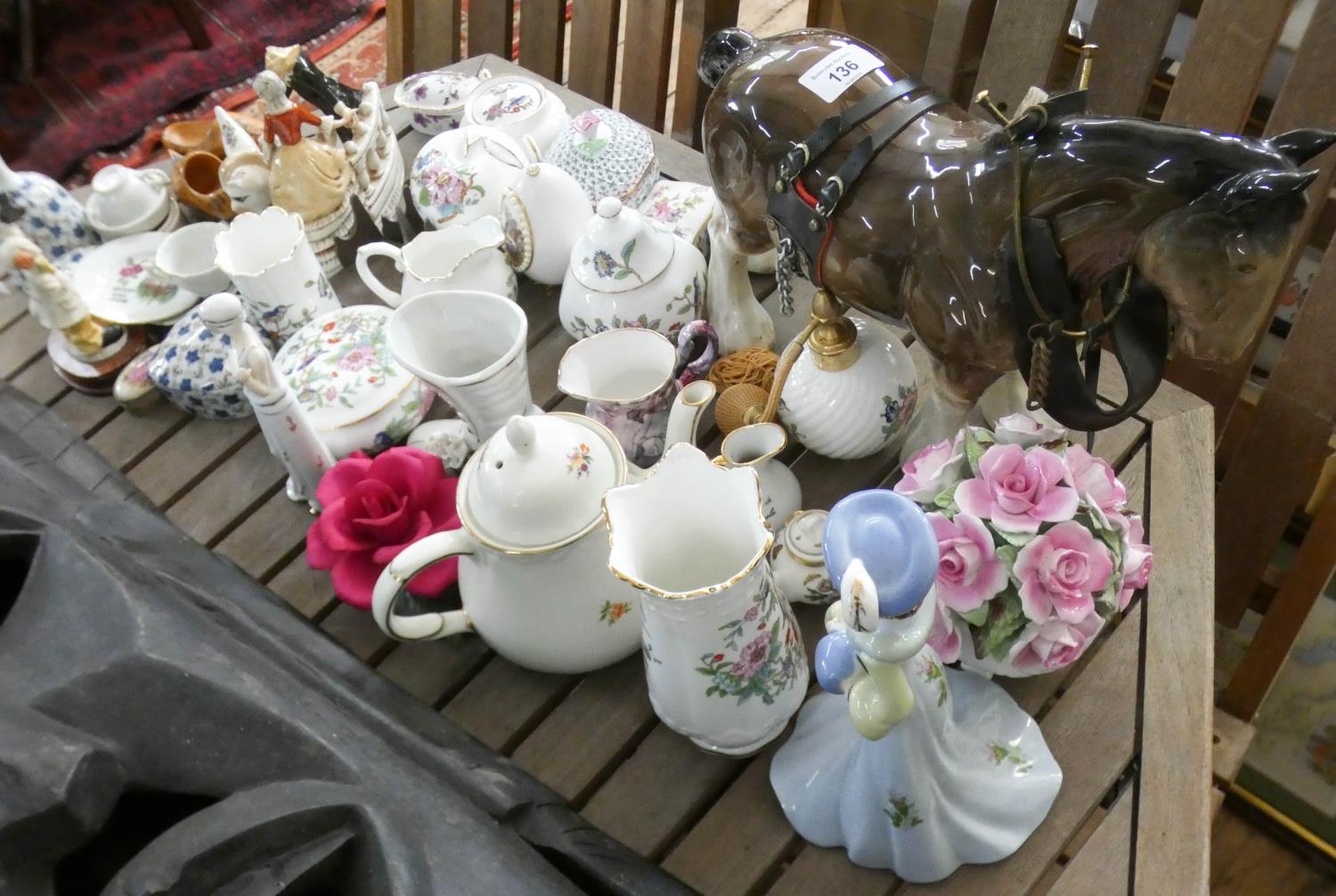 Quantity of small Ainsley and other ornaments, shire horse figure etc