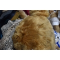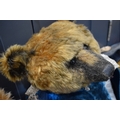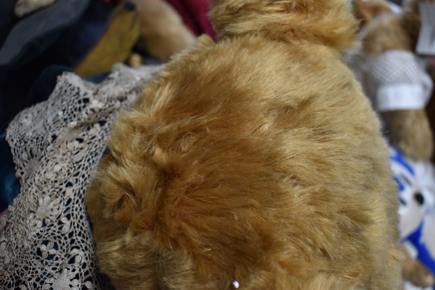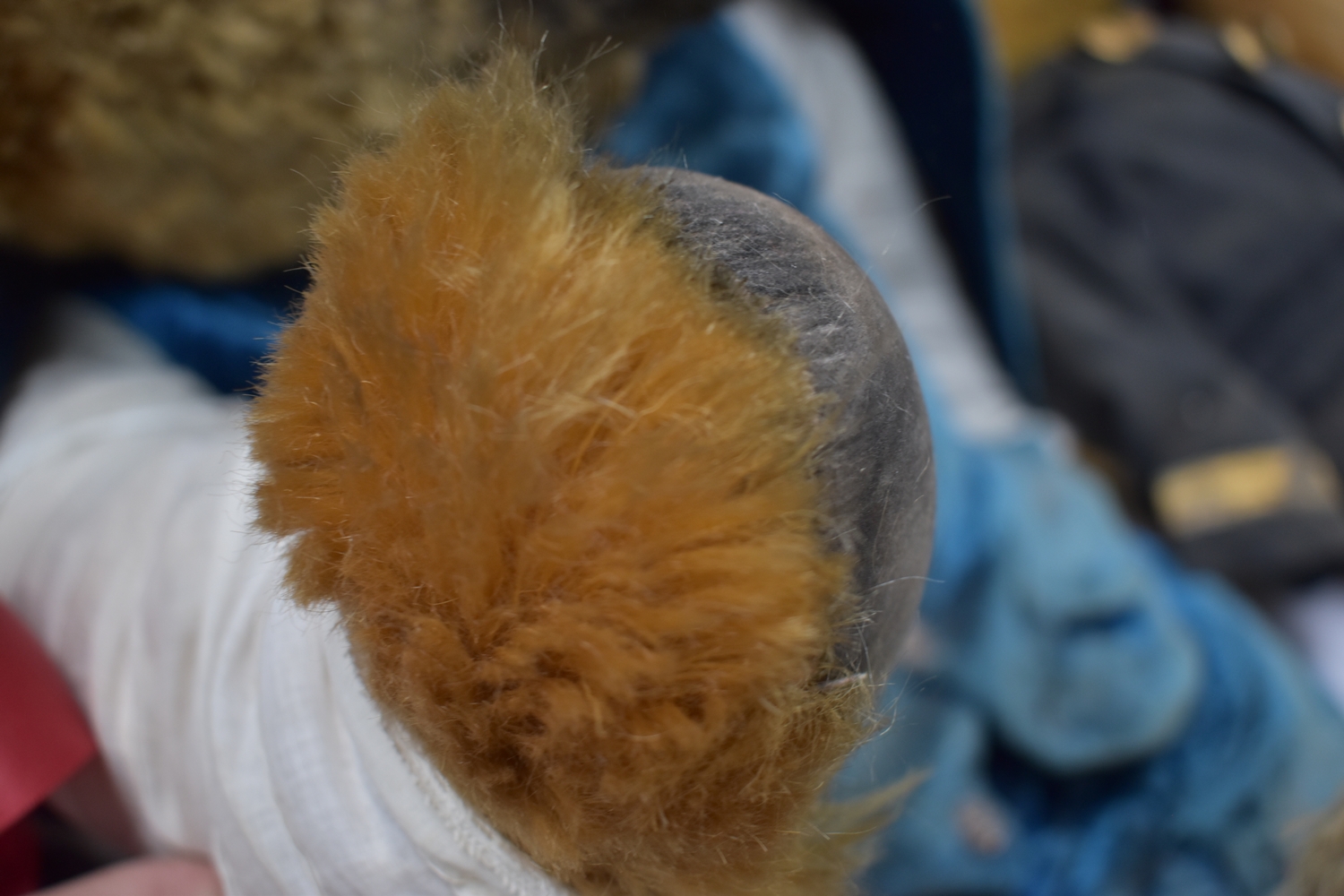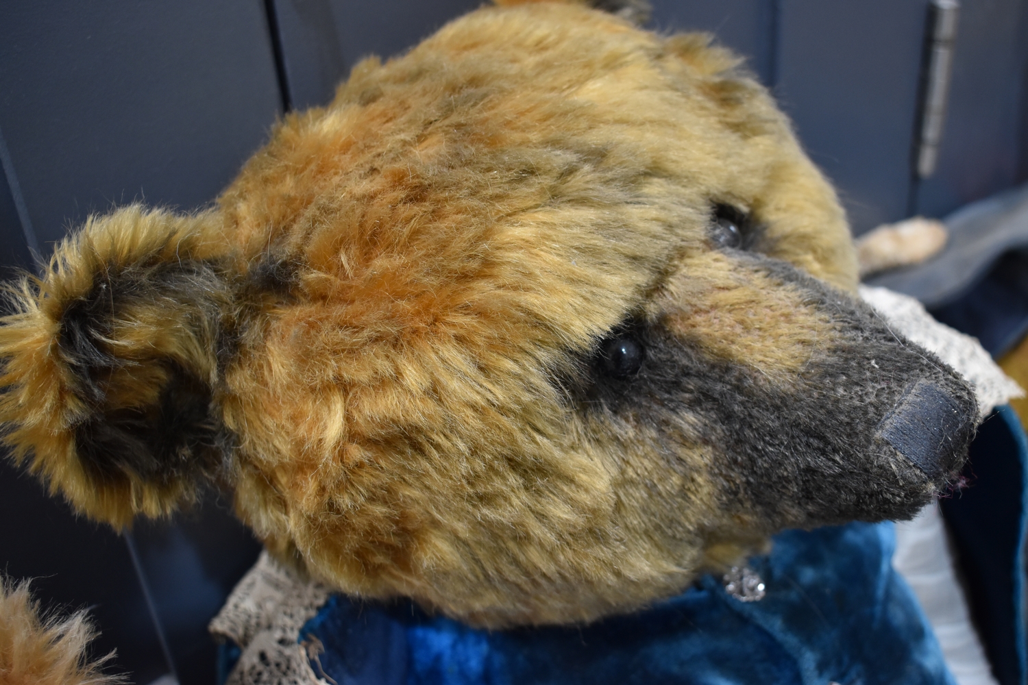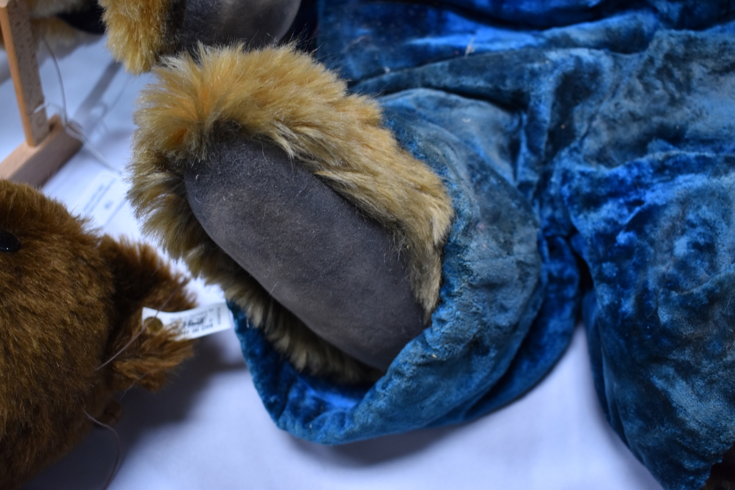A large Portobello Bear Co. Limited Edition bear, wearing blue velvet attire, Collectors Designer Bears, with articulated limbs, 75cm long.