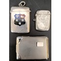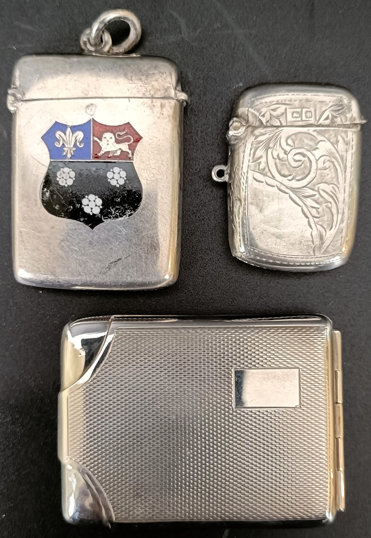 A silver and enamel vesta, decorated a crest in enamel, another, and a matchbox holder, 1.7 ozt