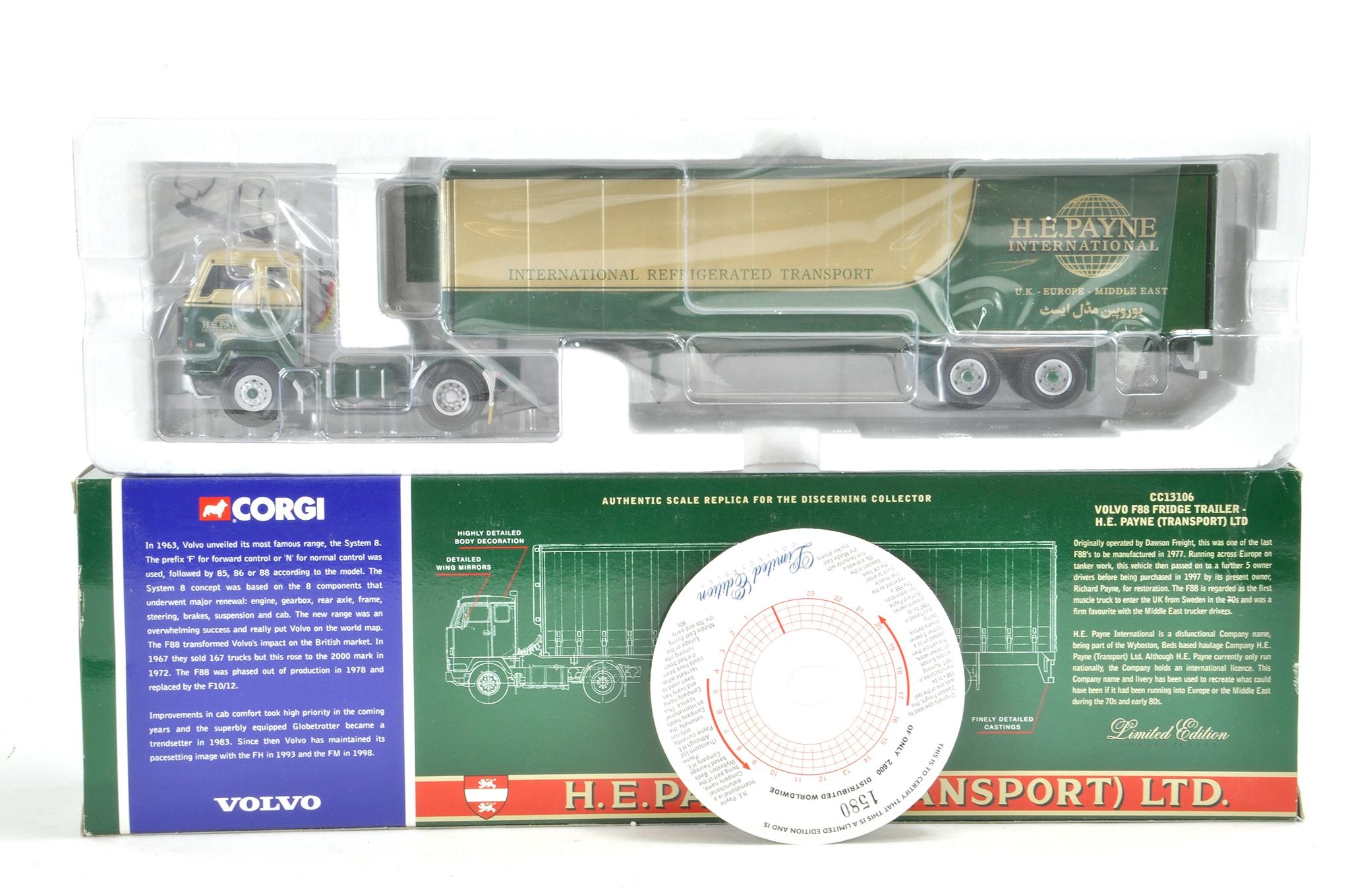 Corgi Diecast Model Truck issue comprising No. CC13106 Volvo F88 Tautliner in the livery of HE Payne. Excellent and complete in box.