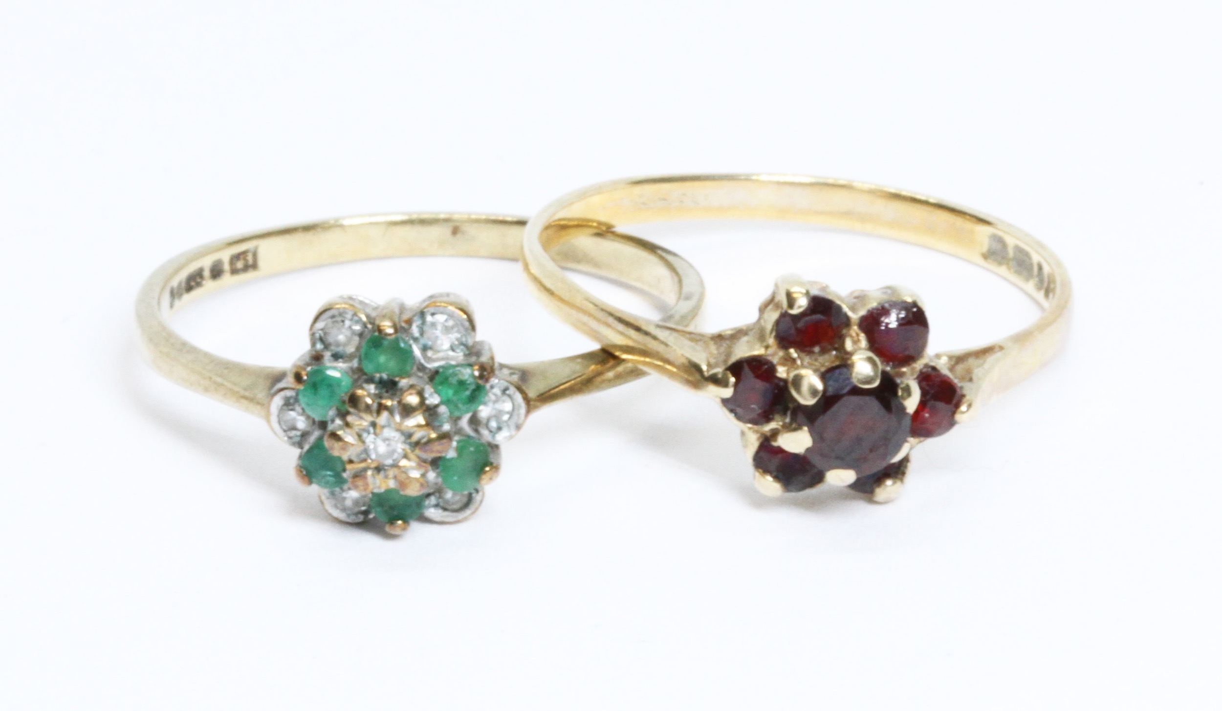Two hallmarked 9ct gold cluster rings, gross weight 2.8g, size M.