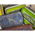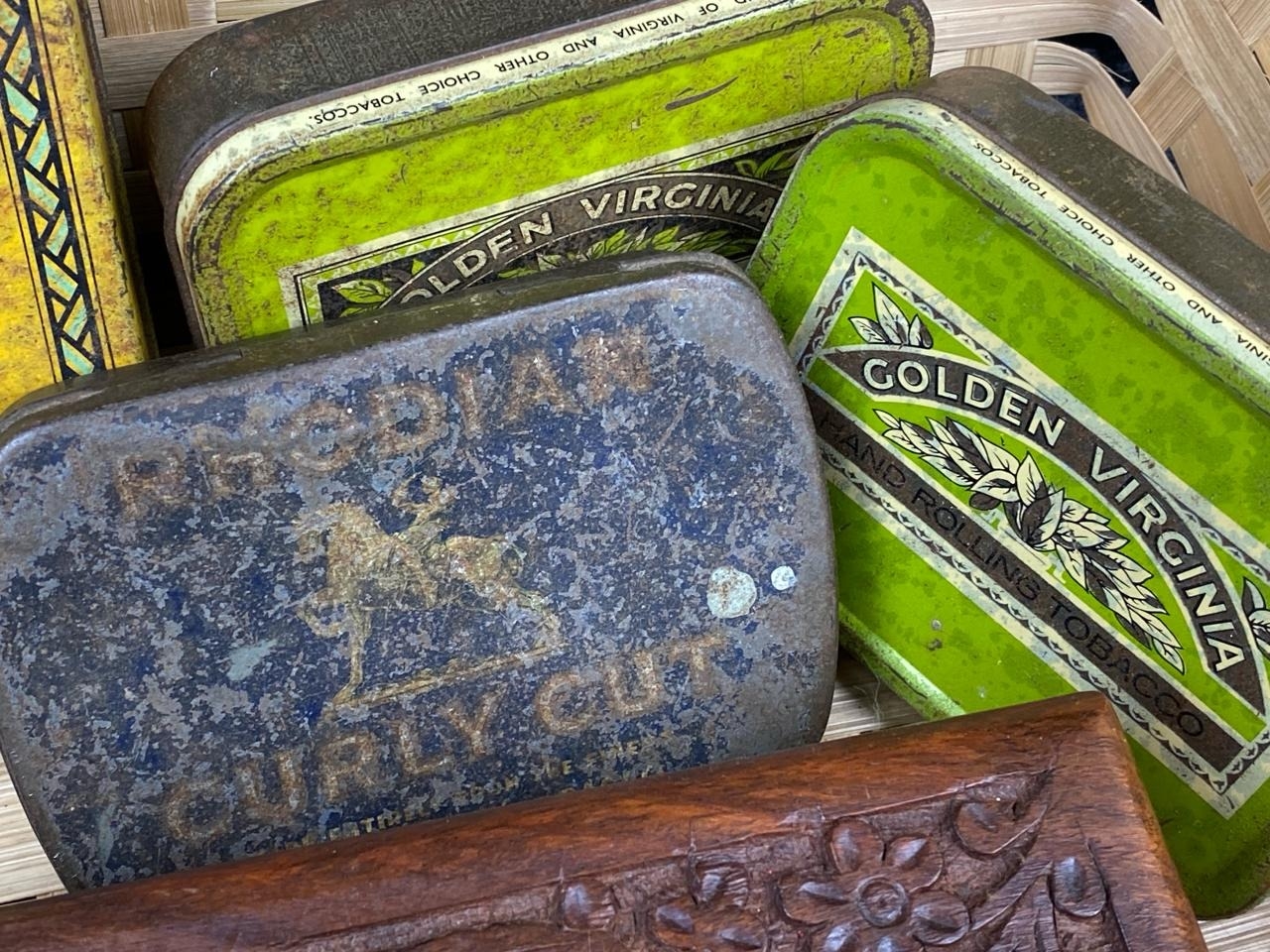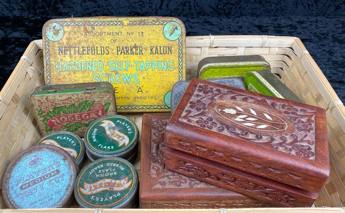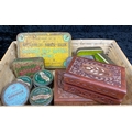 Various vintage tins, tobacco containers and two sheesham wood keepsake boxes.