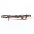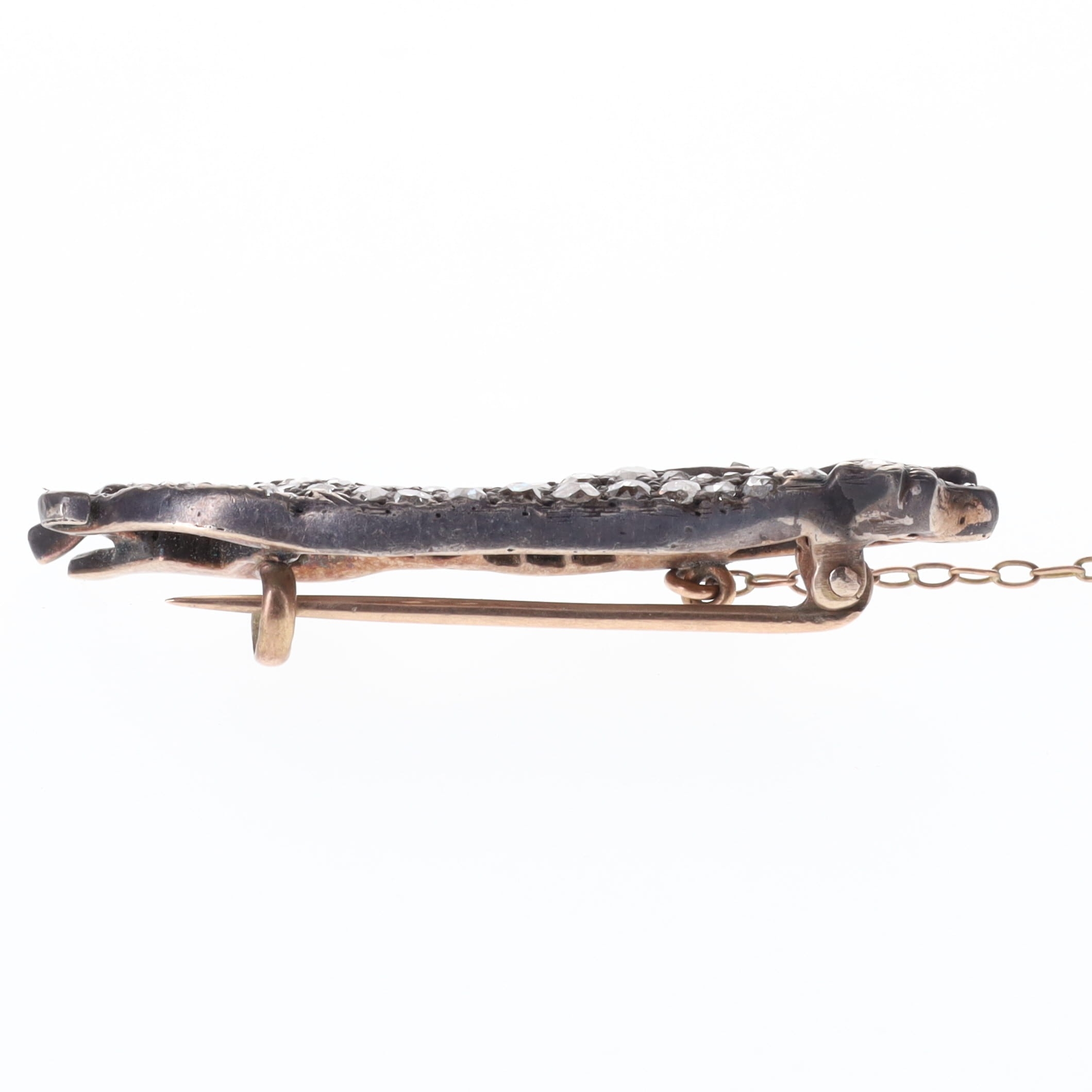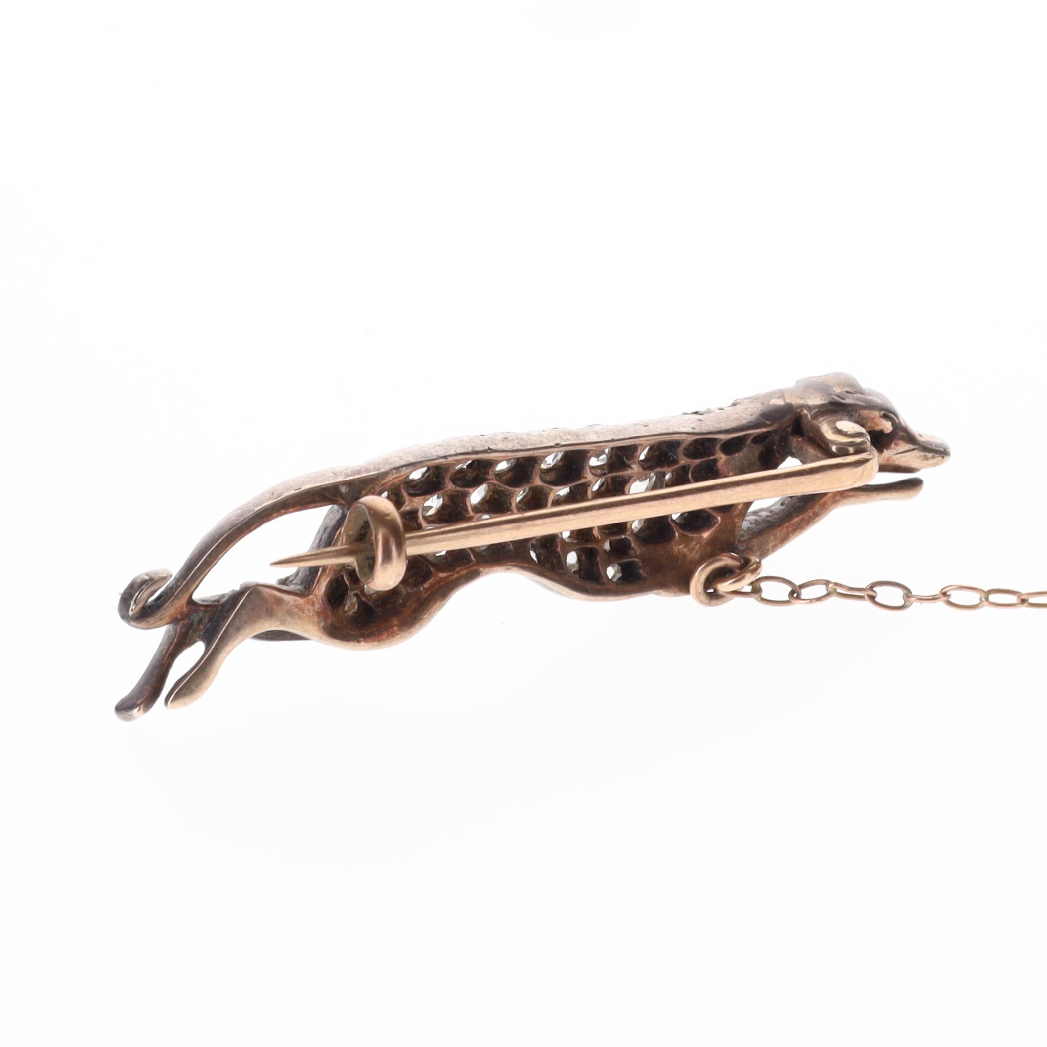 Victorian Diamond Gold And Silver Greyhound Brooch, tested 9ct and silver. One central diamond missing. Measures 4cm in length. Weighs approximately 4.5g