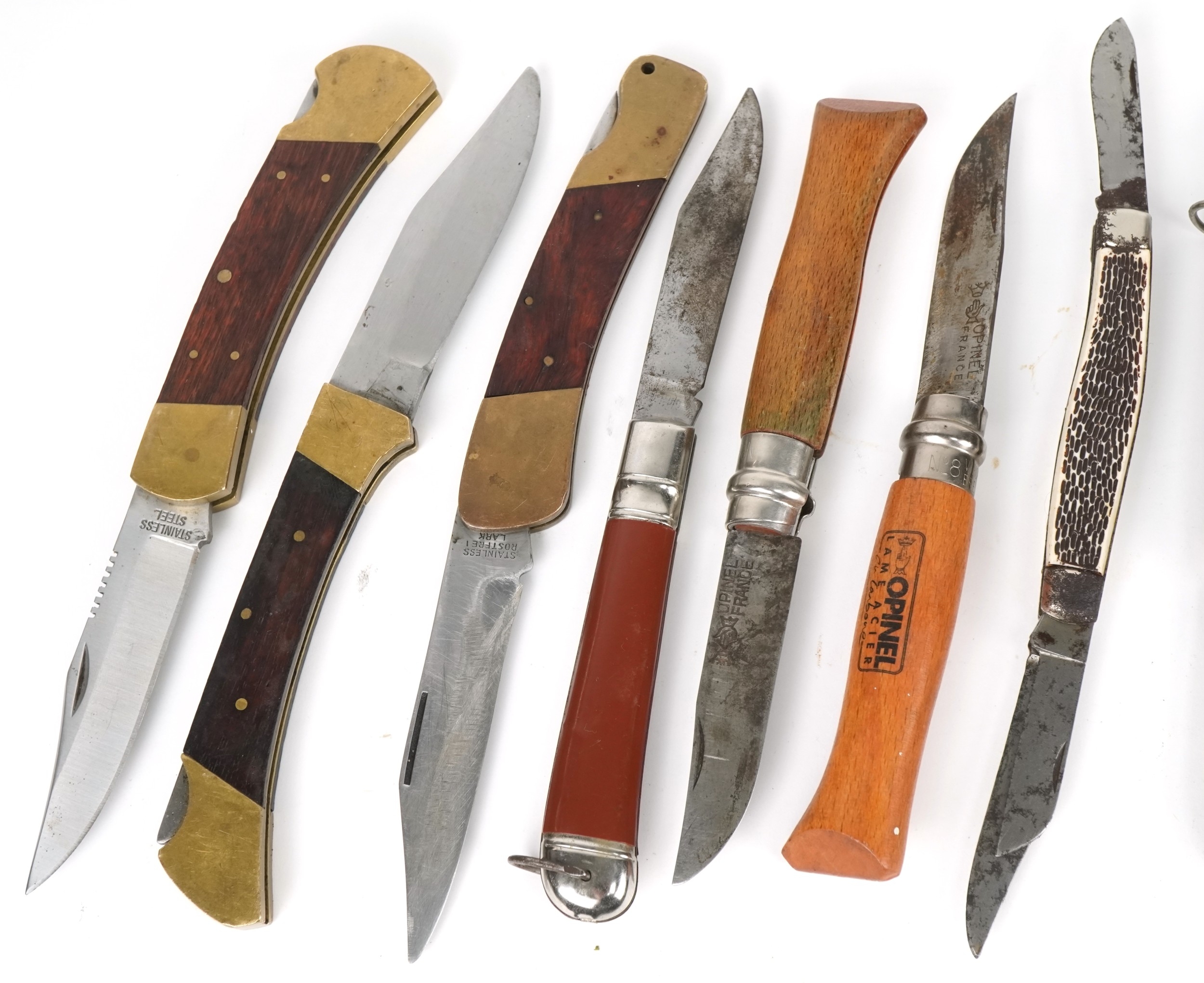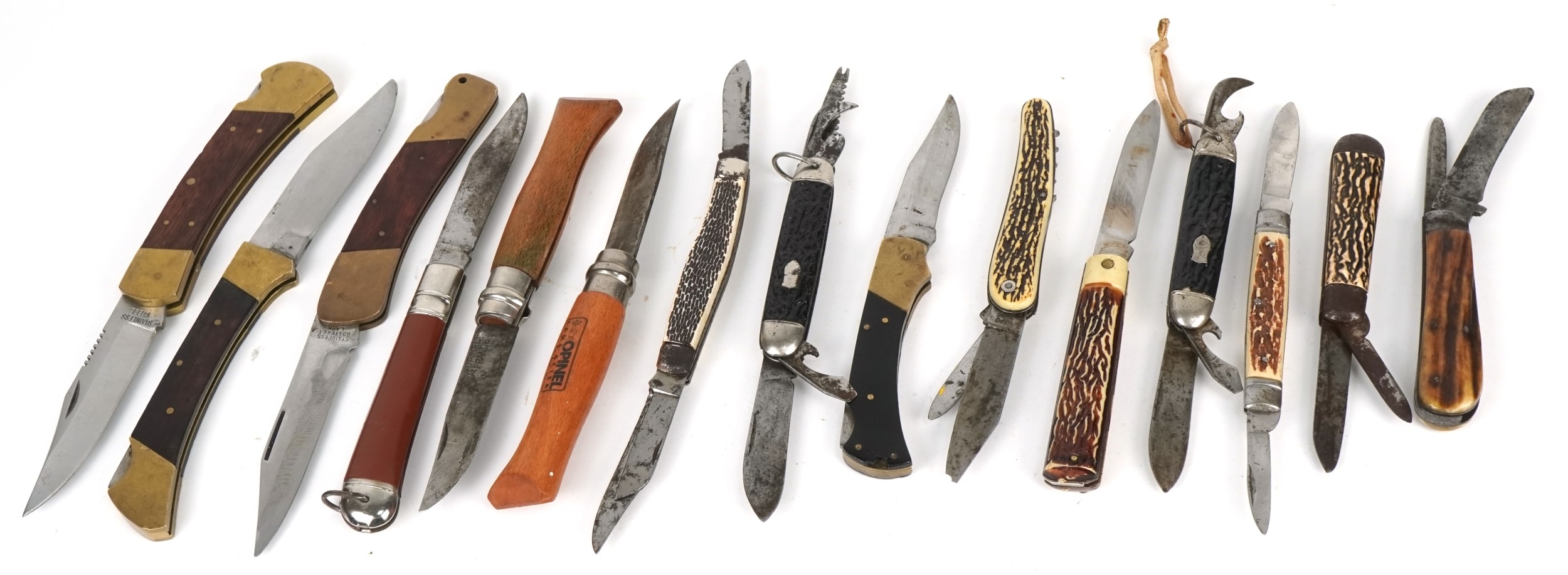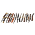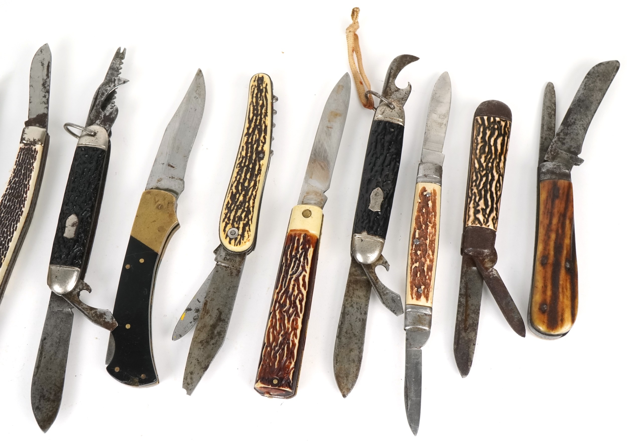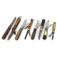 A collection of pocket knives and tools including horn design examples, the largest 12cm in length.