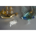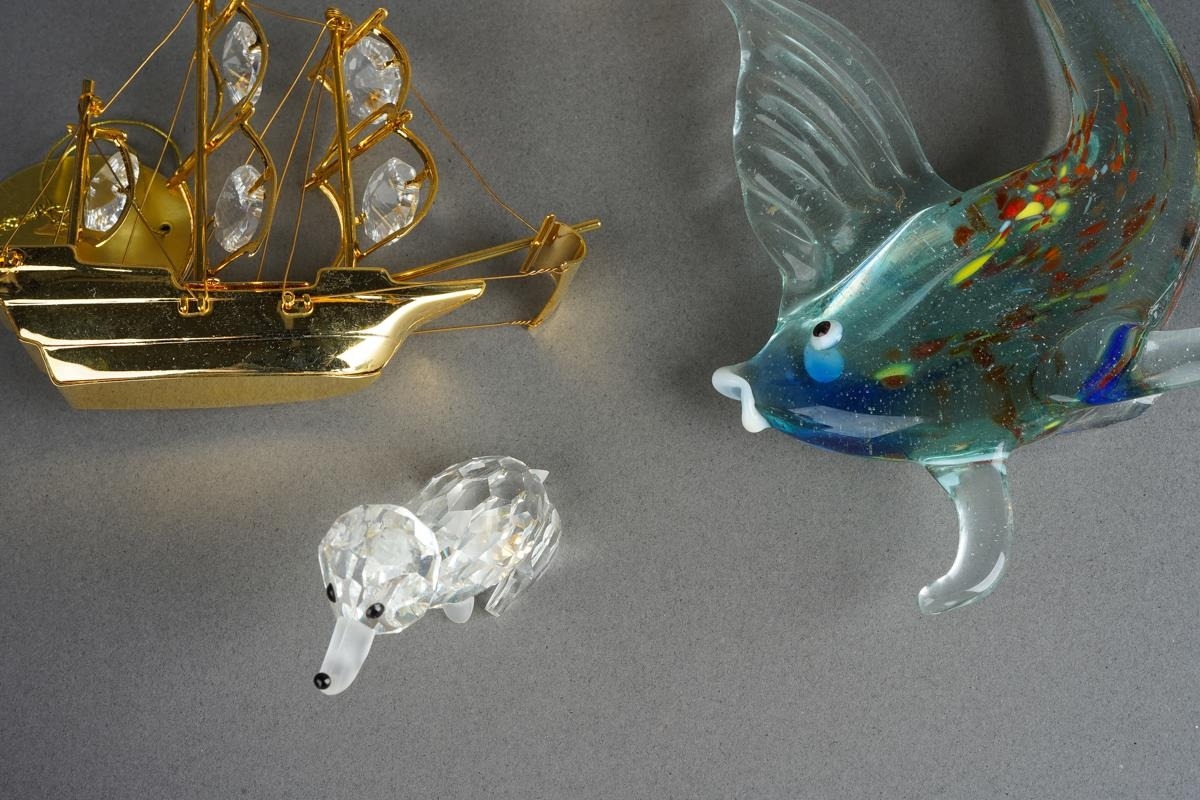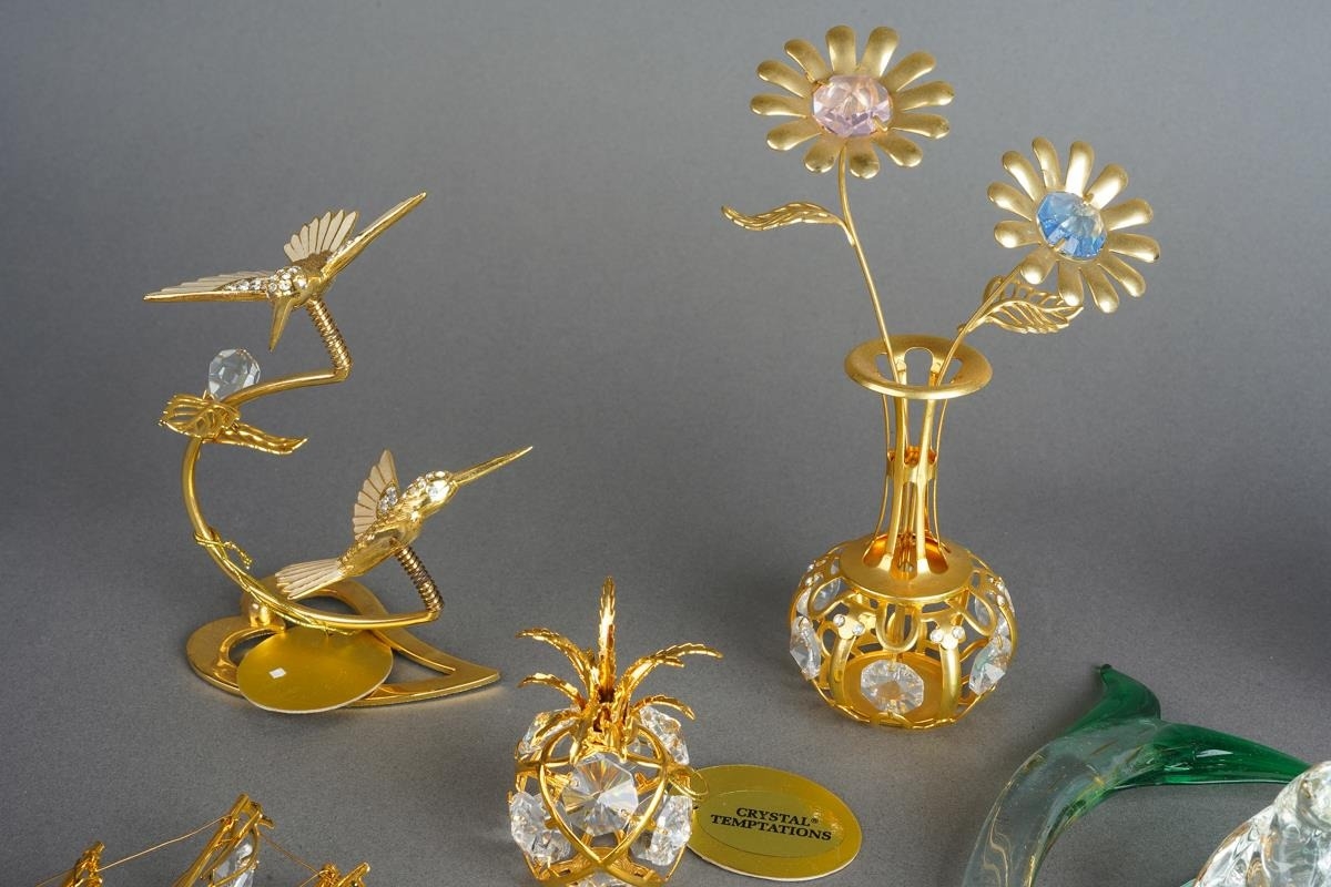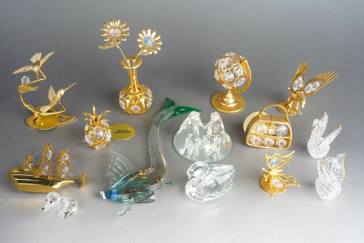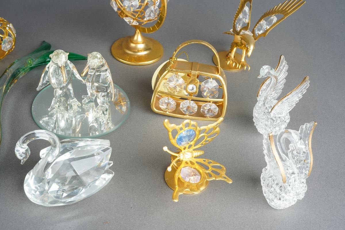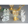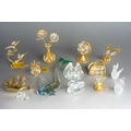 Eight Crystal Temptations by Swarovski 24k gold plated ornaments including vase of flowers, birds, pineapple, globe, ship, handbag [three with tags] together with various Swarovski style birds and a Murano fish [1 box]