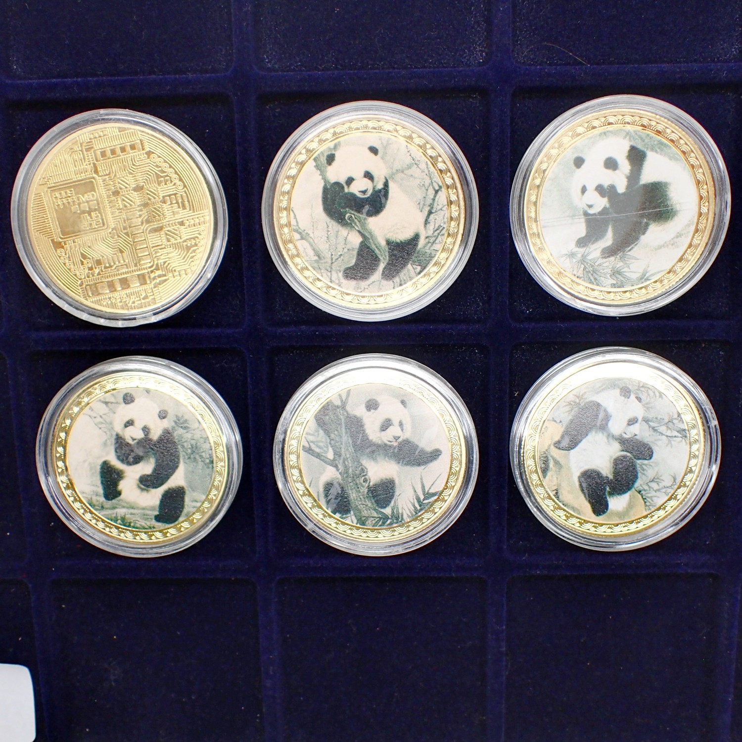 Five commemorative panda crowns with a further plated bitcoin example. UK P&P Group 1 (£18+VAT for the first lot and £2+VAT for subsequent lots)