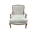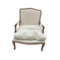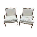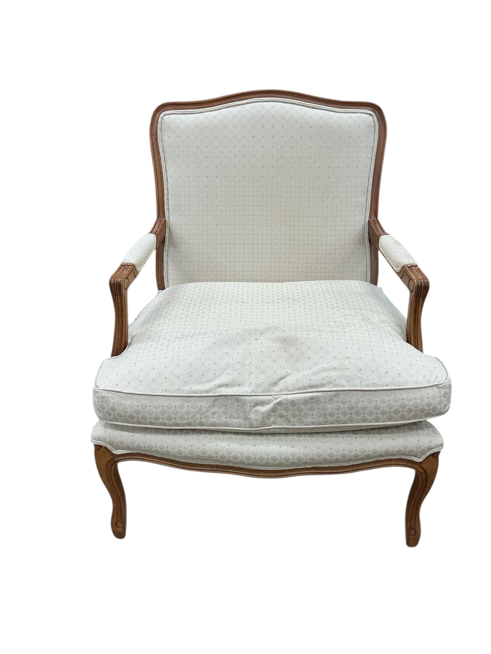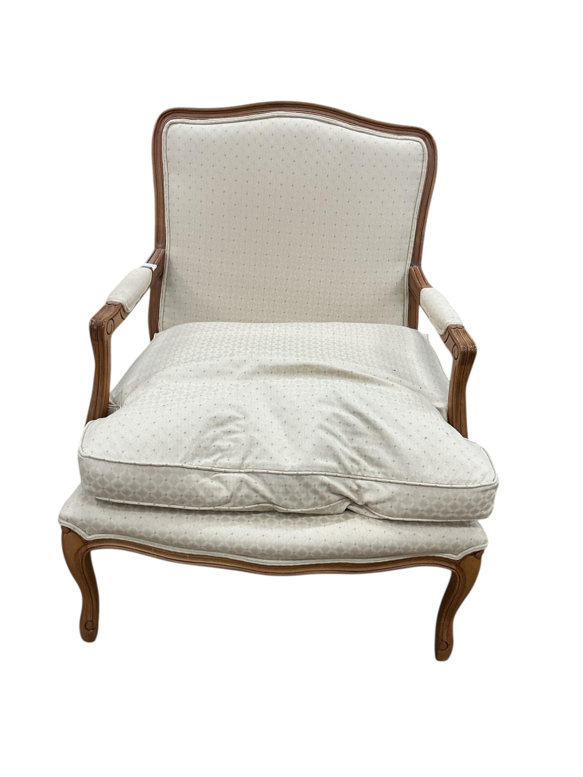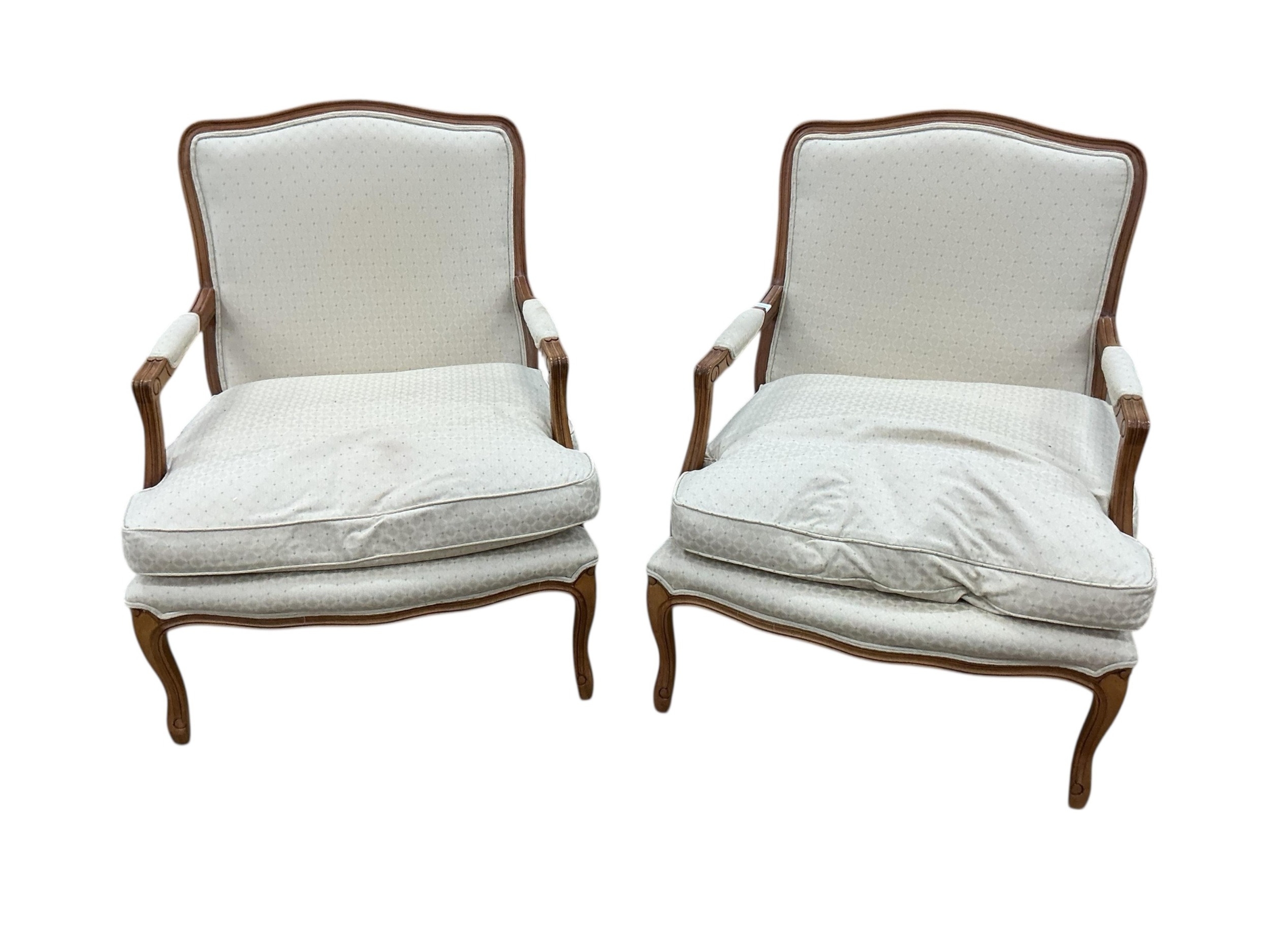 A pair of Louis XVI style upholstered walnut open armchairs, width 68cm, depth 62cm, height 94cm