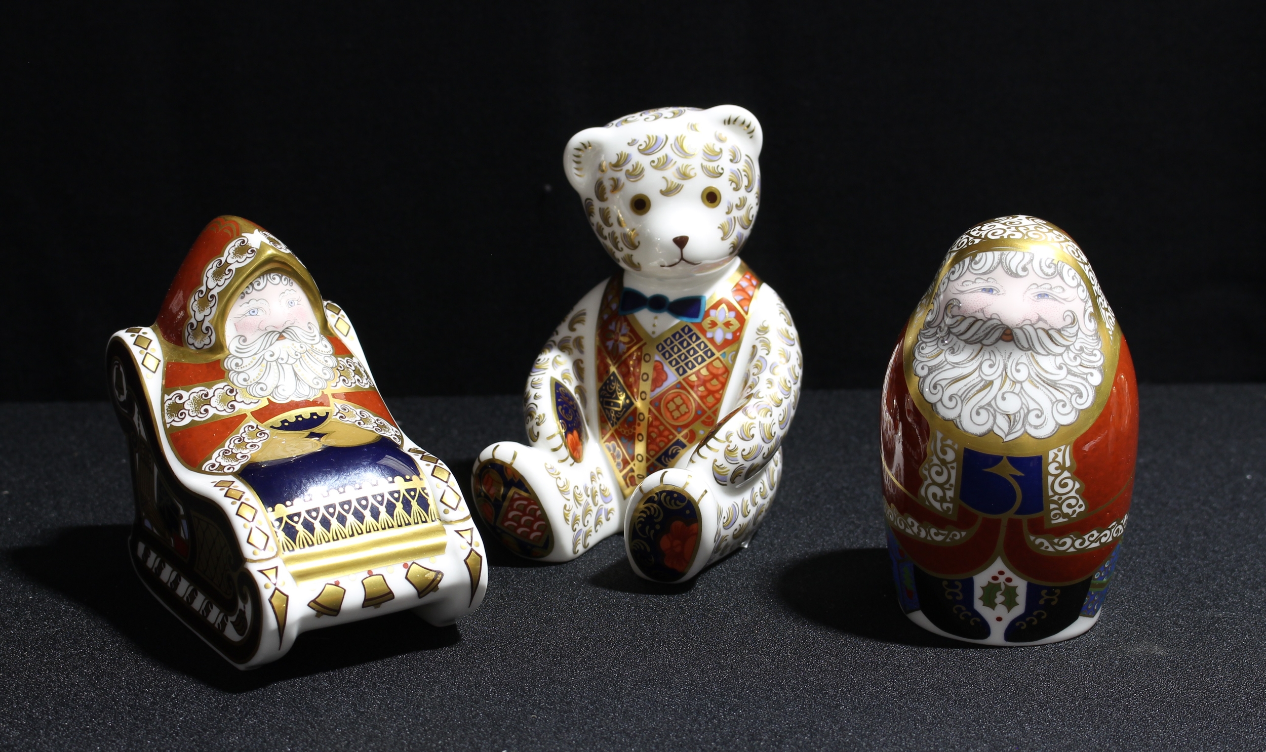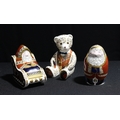 A Royal Crown Derby paperweight, Santa and Sleigh, silver stopper; others, Father Christmas, no stopper; Teddy Bear, silver stopper, printed marks (3)