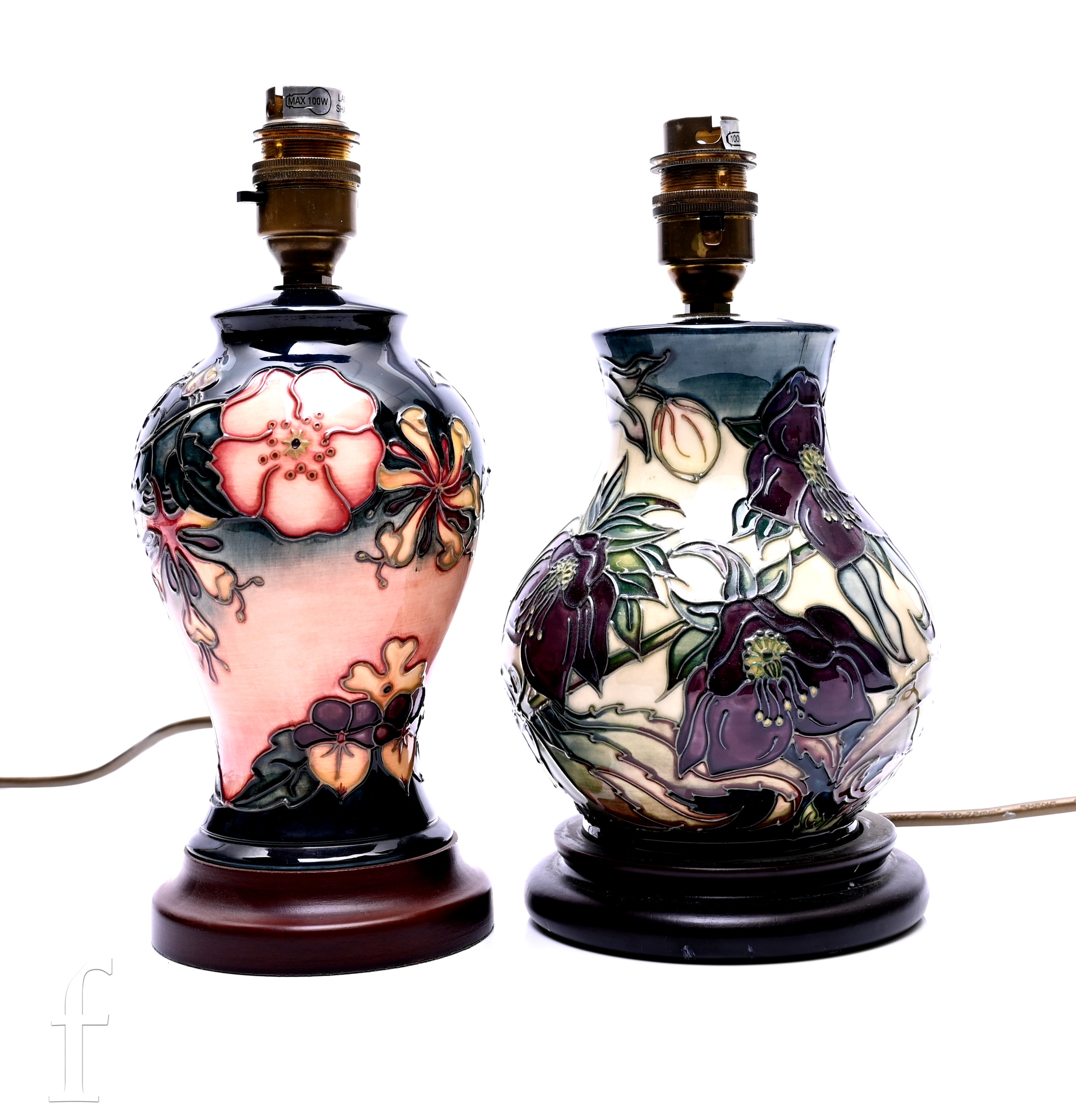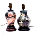 Nicola Slaney for Moorcroft Pottery, a 'Hellebore' pattern lamp base, of baluster form on turned wooden base, height to top of fitting 24cm, together with an 'Oberon' pattern lamp base by Rachel Bishop, both tube line decorated with stylised flowers and leafy stems. (2)