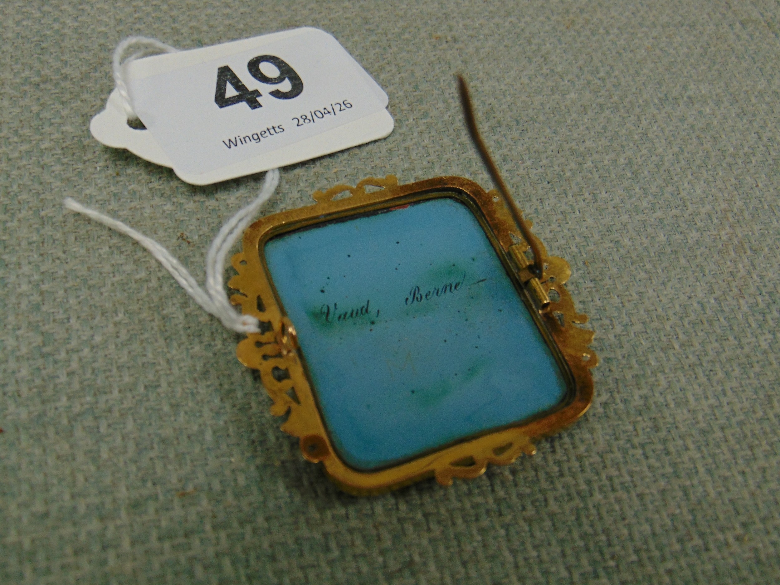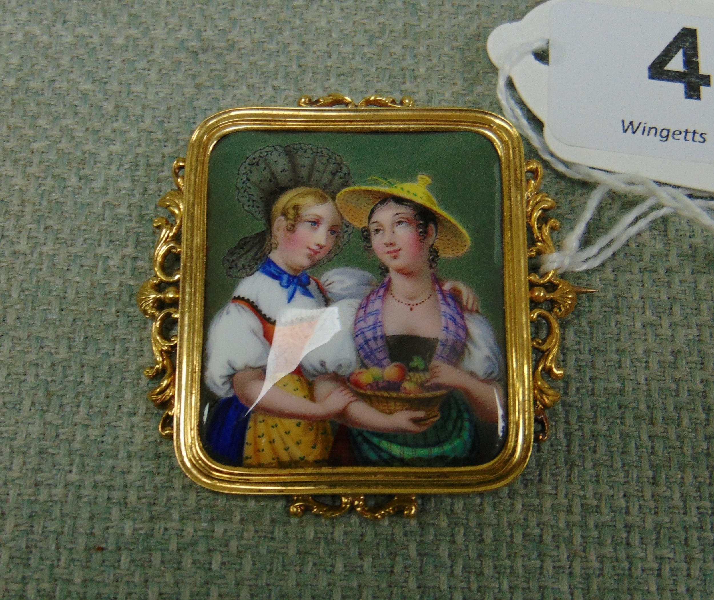 Antique porcelain brooch, decorated with classical continental ladies, within an ornate gilt metal frame, 2 x 1.5".