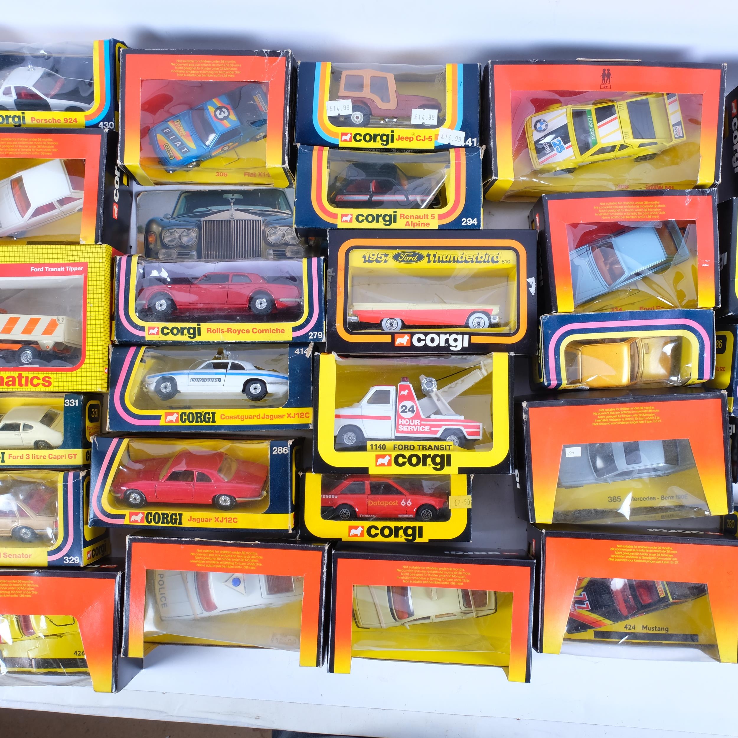 27 various Corgi toy cars and trucks, to include a Jaguar XJ12C (206), a Porsche 924 (430), a Rolls Royce Corniche (279), and a Ford Transit Tipper (1121), all in original boxes