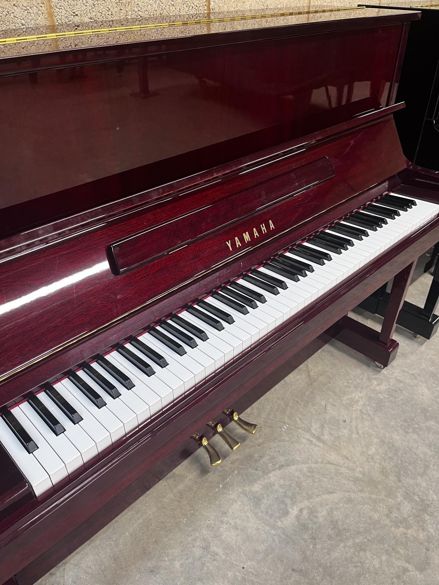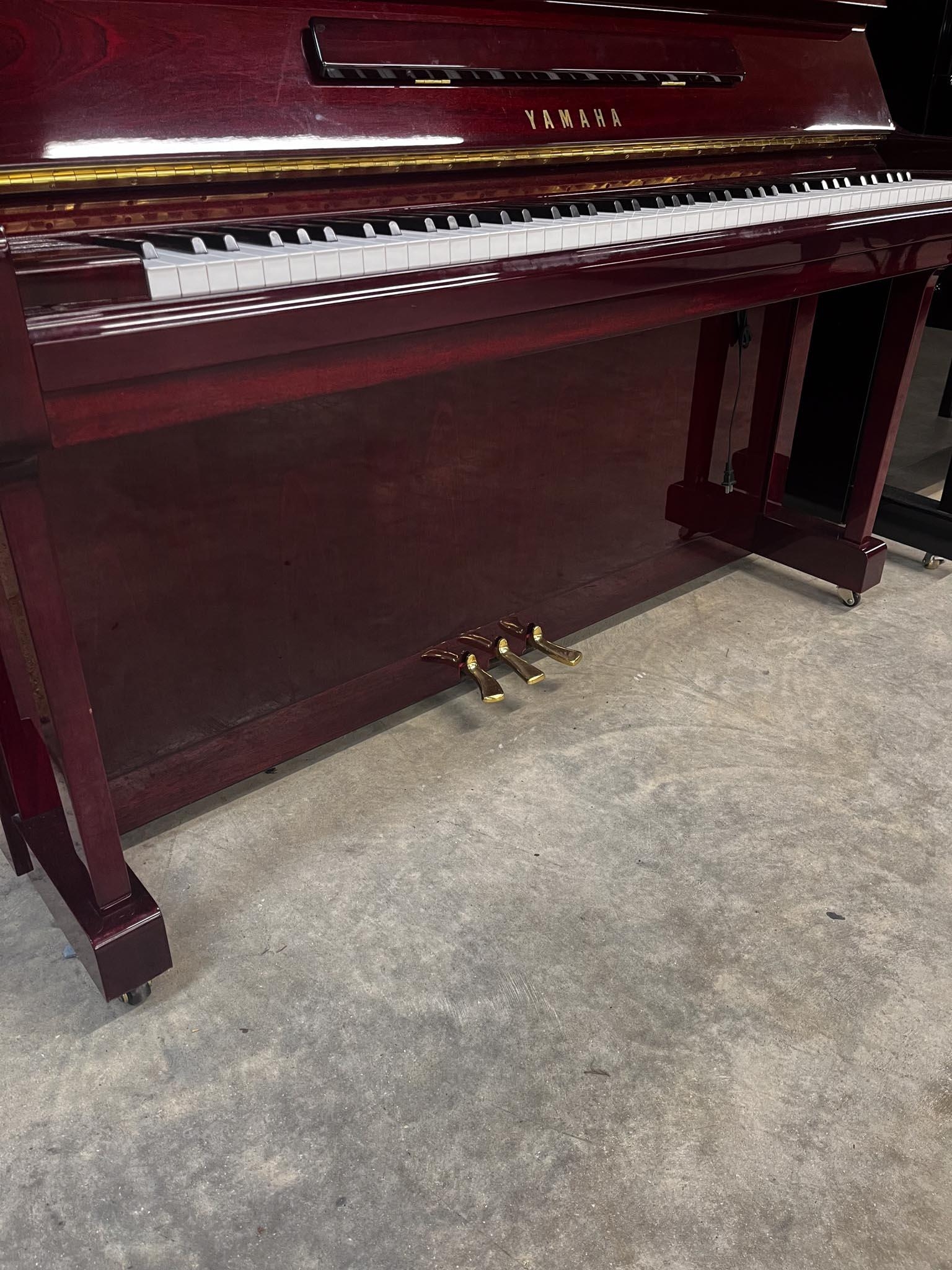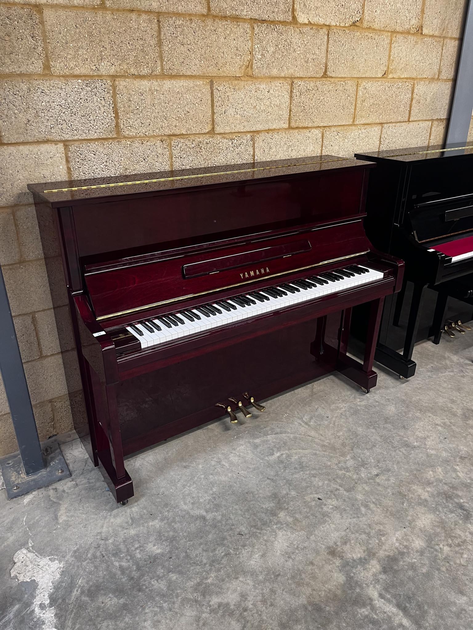 A Model YU 121C upright piano in a bright mahogany case; together with a stool.
