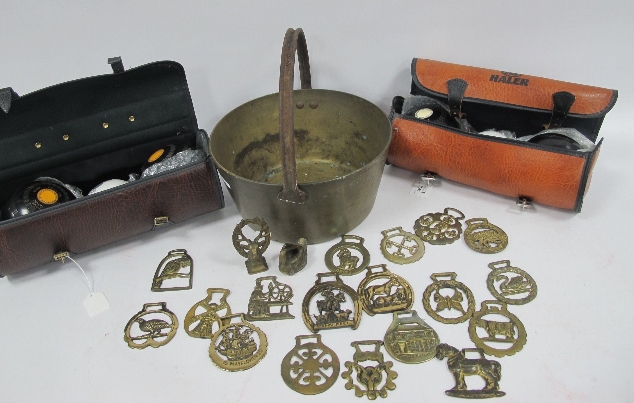 Lawn Green Bowls - Thomas Taylor, two pairs with jacks, in cases. Brass jam pan and horse brasses.