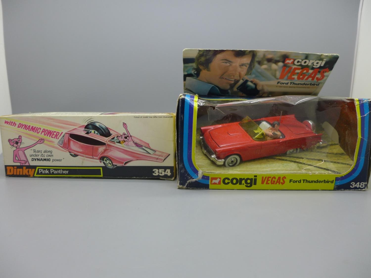 A Corgi Vegas Ford Thunderbird and a Dinky 354 Pink Panther, boxes a/f